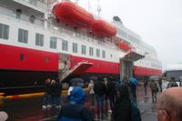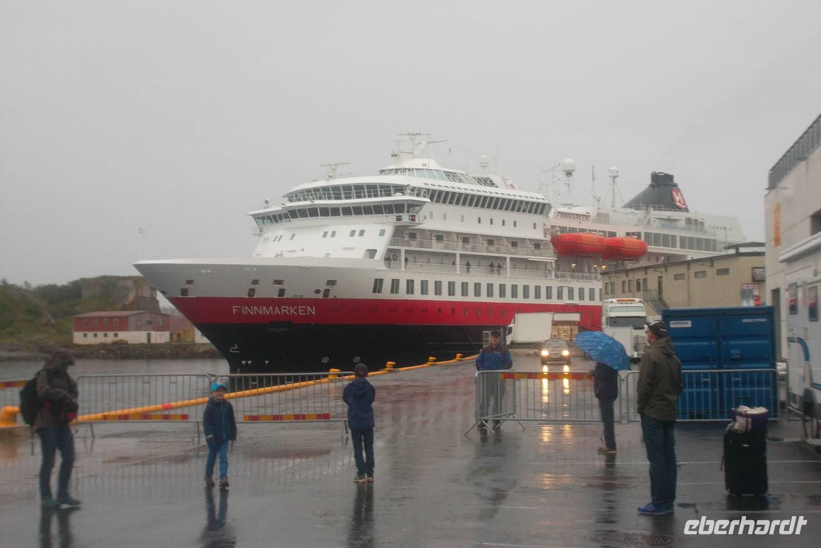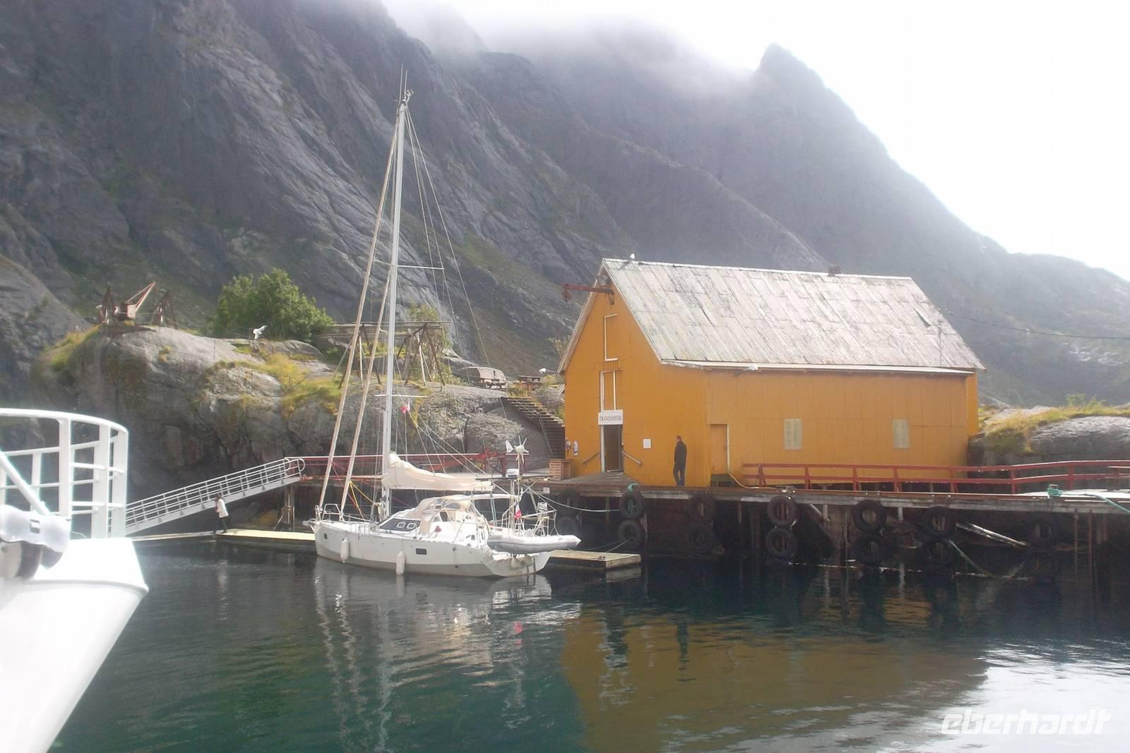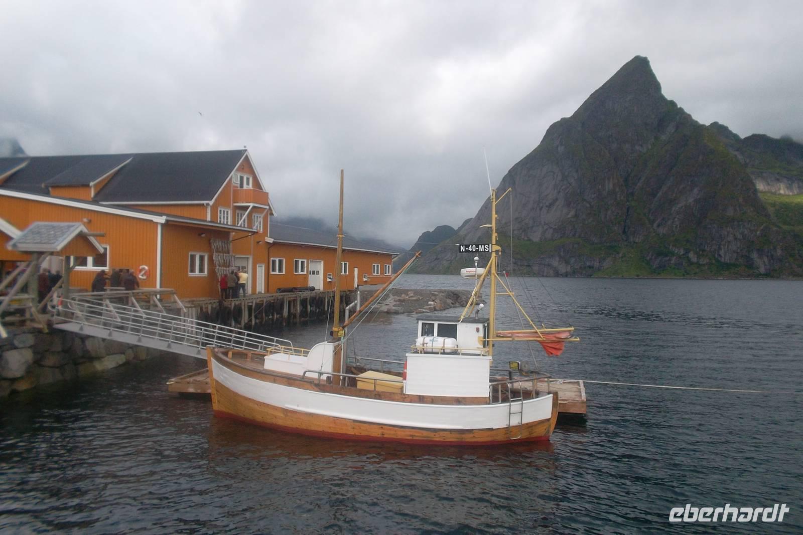 Stokmarknes ist der Hafen, in dem die Geschichte der berühmten „Hurtigruten" begann. Die Gesellschaft der „Hurtigbåten" bedient seit 1893 in Norwegen zuverlässig und regelmäßig Post, Fracht- und Passagierverkehr im unwegsamen Nordland. Bis heute nennt man die Hurtigrute „Reichsstraße Nr. 1", da sie früher noch vor dem Bau einer durchgehenden Inlandstraße Dutzende Häfen miteinander verband. Heute sind die Schiffe riesig, sehr komfortabel und luxuriös. Täglich starten sie sowohl in nördlicher Richtung von Bergen als auch in südlicher Richtung von Kirkenes und laufen dabei jeweils 34 Häfen an. Hier waren wir dieses Mal nur als Deckspassagiere von Stokmarknes bis Svolvaer gebucht. Gut drei Stunden entspannten die Gäste als Deckspassagiere und ließen dabei die grandiose Küstenszenerie Norwegens an sich vorbeiziehen. Man lernt auf diese Weise die typische „Hurtigruten-Atmosphäre" kennen und hat als Höhepunkt bei dieser Strecke die Fahrt in den Trollfjord, der kaum breiter ist als das Schiff lang und in dem es dennoch wendet. Das moderne, bestens ausgestattete Schiff „Finnmarken" gehört zur neueren Schiffsgeneration und machte die Fahrt zu einem tollen Erlebnis. In Svolvaer, Hauptort der Lofoten, erwartete der Bus seine Gäste und leider bei strömendem Regen fuhren wir zu unserer Unterkunft, den Fischerhütten. Die „Rorbuer" von Mortsund stehen direkt am, zum Teil sogar auf dem Fjord: auf Stelzen über der Bucht - sie sind als bequeme Unterkünfte, oft mit Aufenthaltsraum, hergerichtet worden. Jeder von uns hatte sein Reich für sich und Abendessen und Frühstück gab es im Haupthaus, von dem man, ebenso wie von den Felsen über der Bucht, einen herrlichen Blick auf's Meer hat.