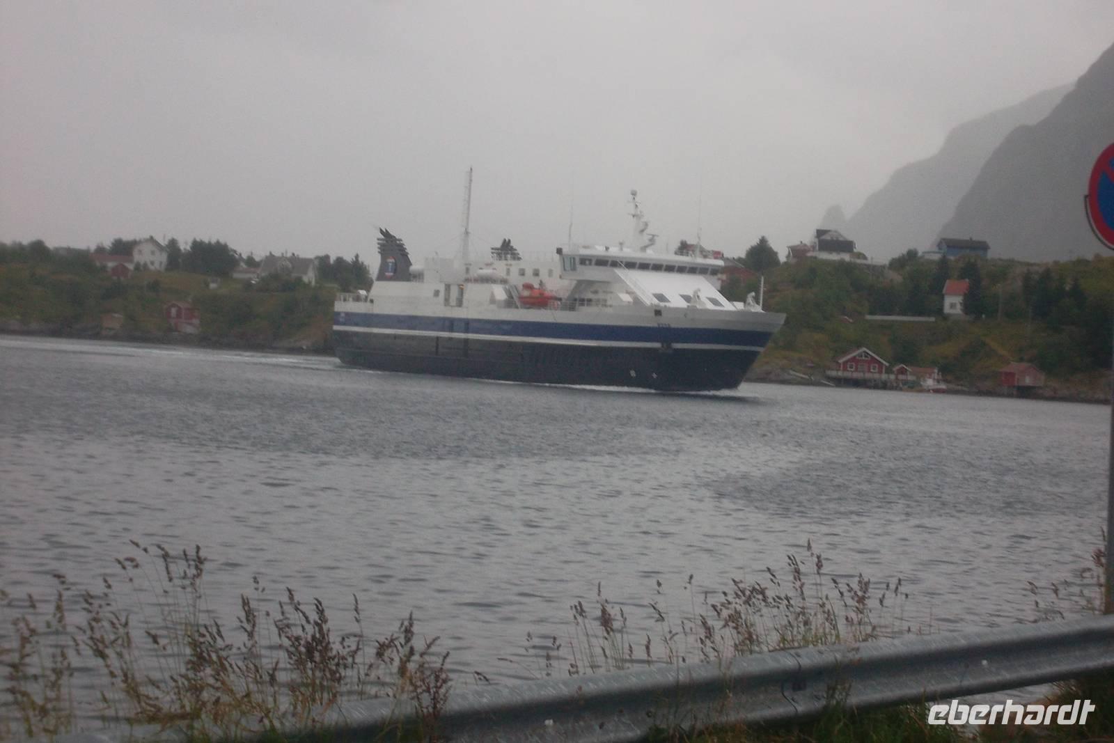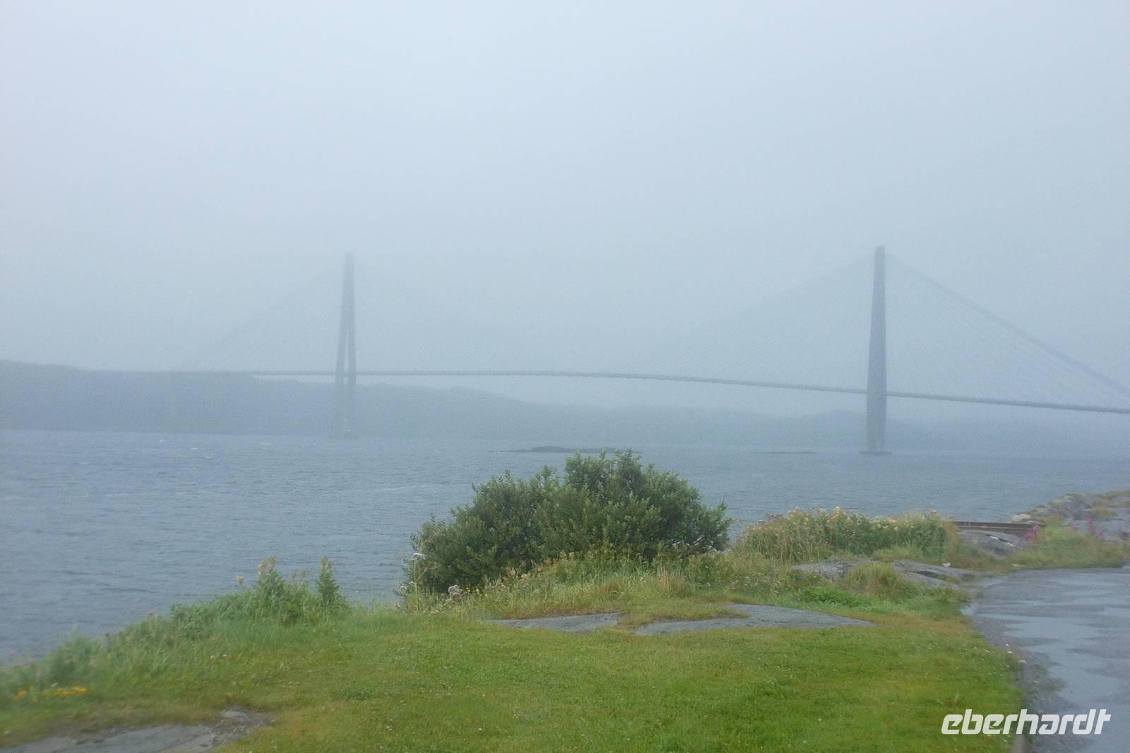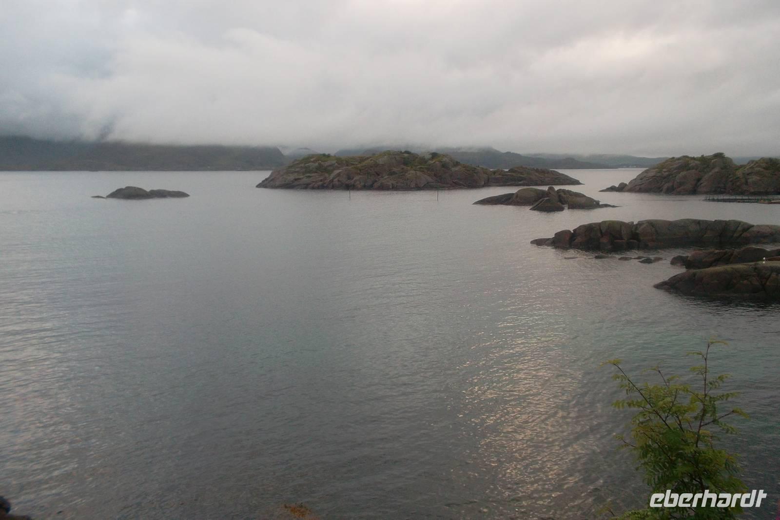 Eigentlich war der heutige Tag als besonderer Höhepunkt geplant: Das Fjordland in Helgeland gehört nämlich zu den schönsten Landschaften Europas. Aber wir hatten nicht mit den norwegischen Trollen und dem Wetter gerechnet: zwar hatten wir genug Zeit, um jeweils die aufeinander abgestimmten Fähren zu erreichen, aber die herrlichen Anblicke des Gebirgszuges der Sieben Schwestern und des nahegelegenen Berges Torghatten konnten wir bei Dauerregen, Nebel und auf Fjordhöhe hängenden Wolken nicht genießen!