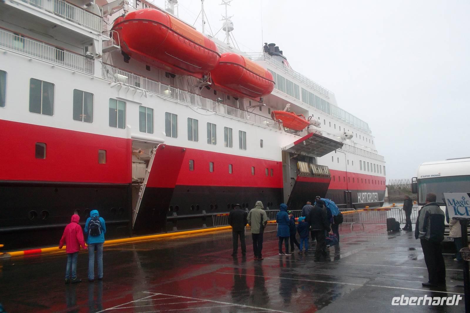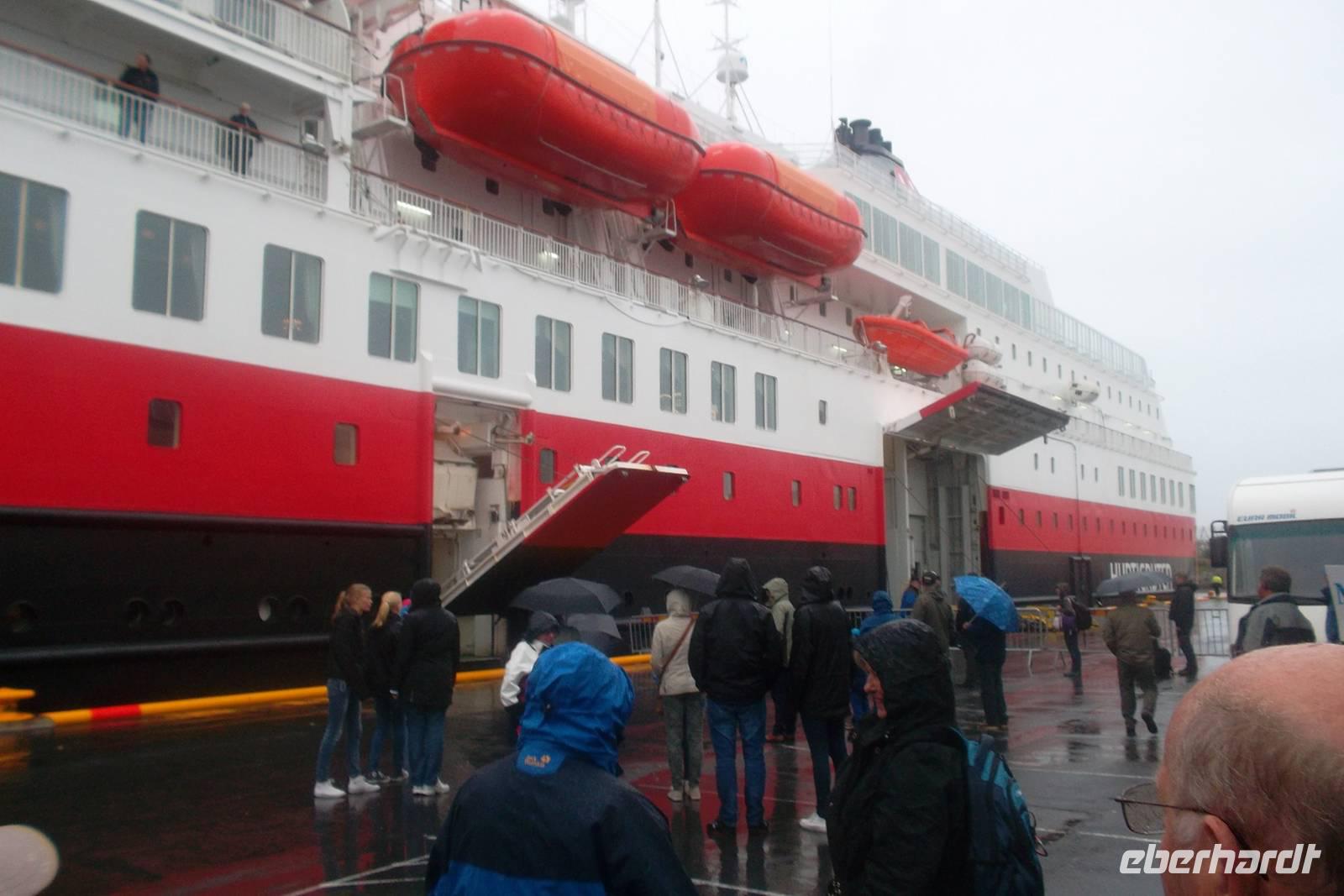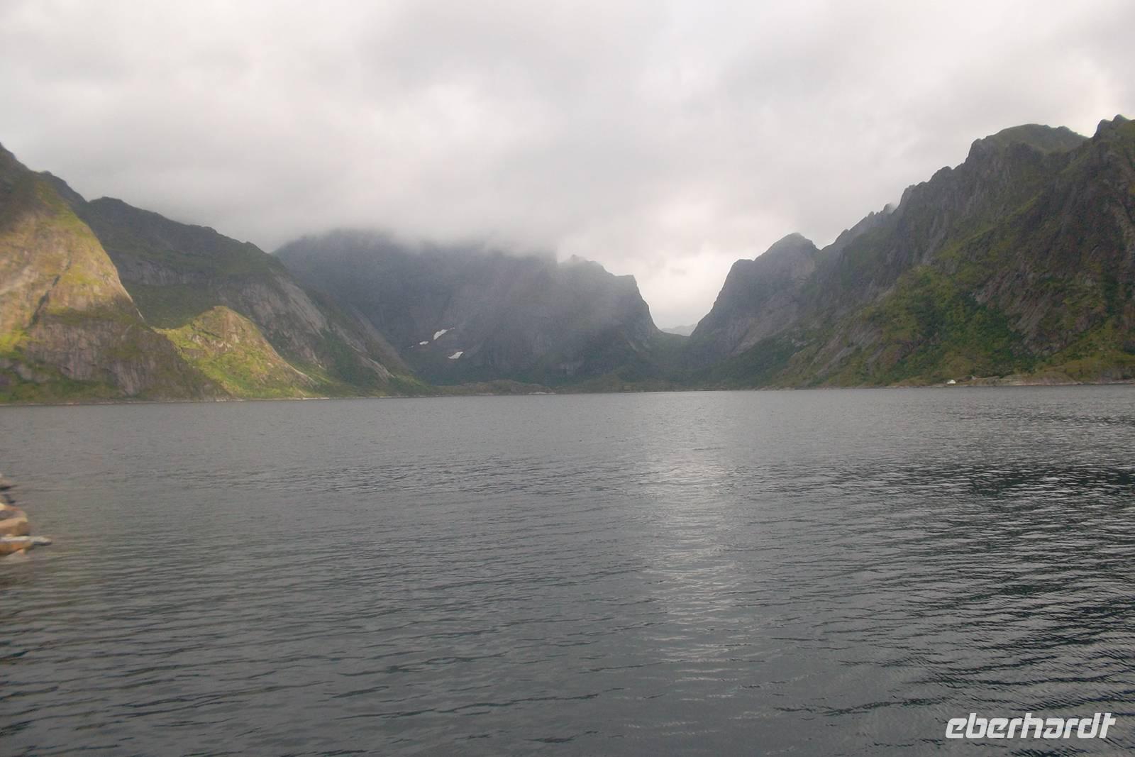 Eigentlich war der heutige Tag als besonderer Höhepunkt geplant: Das Fjordland in Helgeland gehört nämlich zu den schönsten Landschaften Europas. Aber wir hatten nicht mit den norwegischen Trollen und dem Wetter gerechnet: zwar hatten wir genug Zeit, um jeweils die aufeinander abgestimmten Fähren zu erreichen, aber die herrlichen Anblicke des Gebirgszuges der Sieben Schwestern und des nahegelegenen Berges Torghatten konnten wir bei Dauerregen, Nebel und auf Fjordhöhe hängenden Wolken nicht genießen!