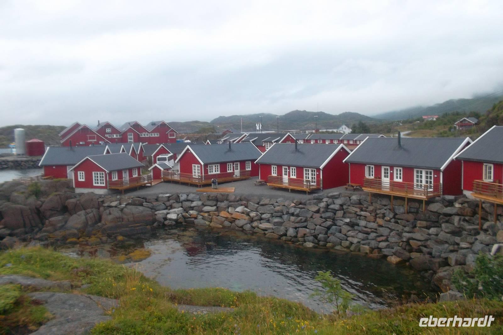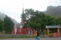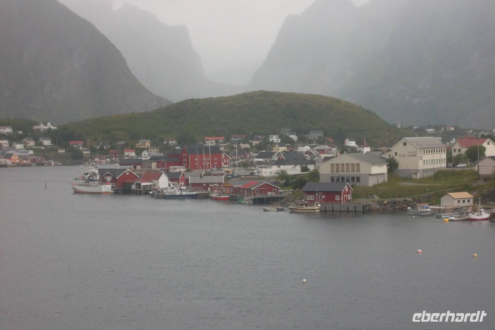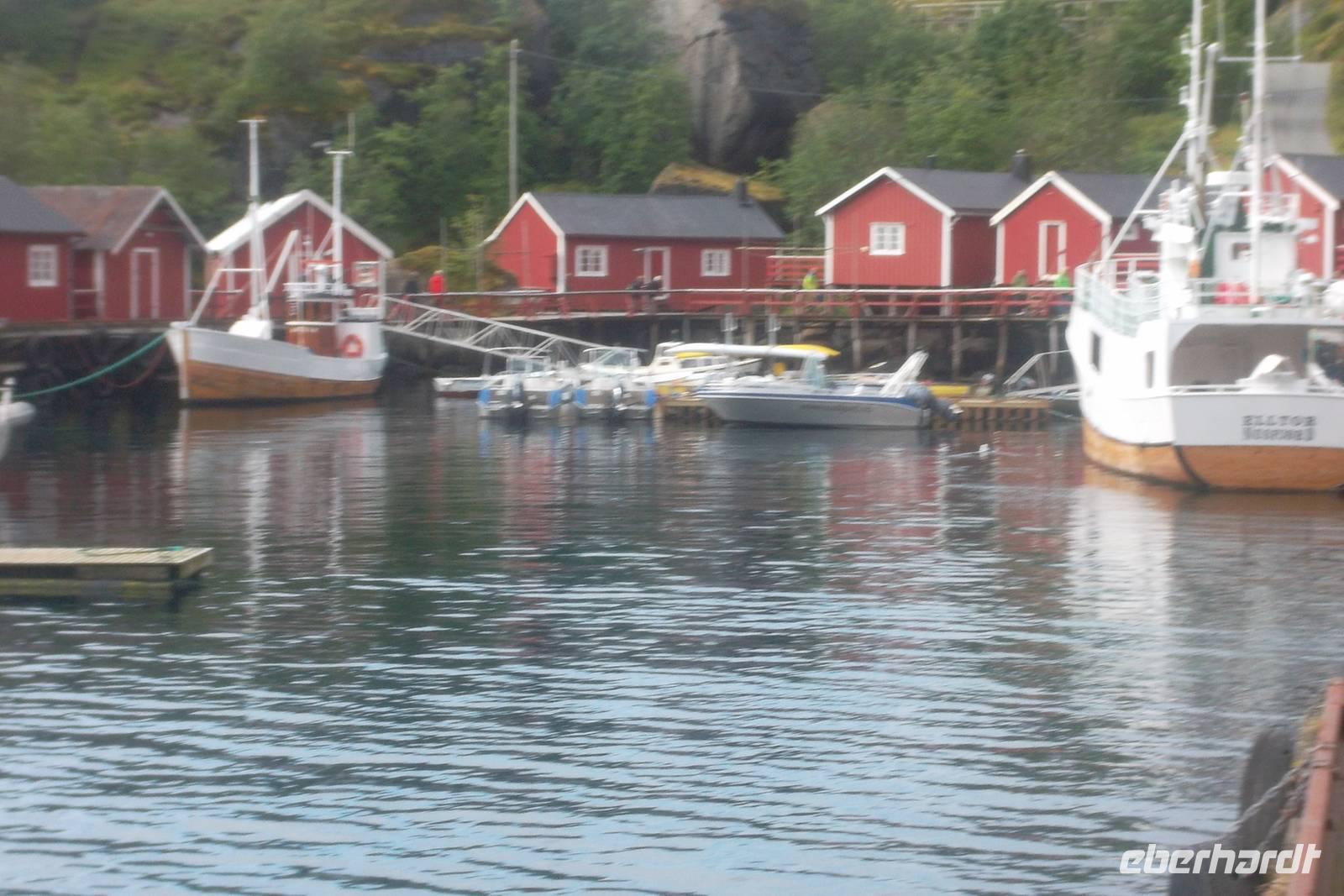 Leider begann der Tag mit schlechtem Wetter und Regen. Die führte uns zunächst gen Süden und zur originellen Kirche von Flakstad, die einst aus Treibholz errichtet wurde. Das Wetter begann sich zu bessern und der Regen hatte schon aufgehört, als wir den berühmtesten Badestrand der Lofoten bei Ramberg erreichten. Zwar gibt es hier selten eine Wassertemperatur über 13 Grad, aber die abgehärteten Lofoten-Insulaner baden hier im Sommer und nennen daher den Strand „Copacabana". Auf dem Weg zurück zu den nächsten Besichtigungen besuchten wir zunächst das entzückende Fischerdörfchen Nusfjord. Es ist ein Ort, in dem die Zeit stehen geblieben scheint und den alle Besucher lieben. Da das Fischerdorf inzwischen zum UNESCO-Weltkulturerbe zählt, muss man hier Eintritt bezahlen. Das lohnt sich aber, denn die Atmosphäre in diesem Ort ist für das alte Norwegen typisch und beschreibt gut das Leben in einem solchen abgeschiedenen Lofotenwinkel.