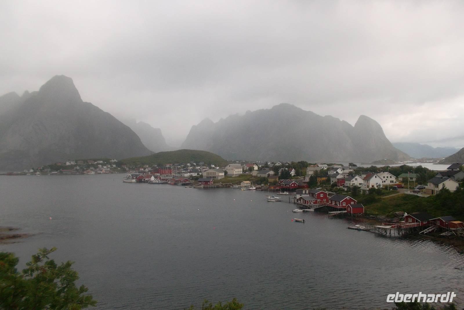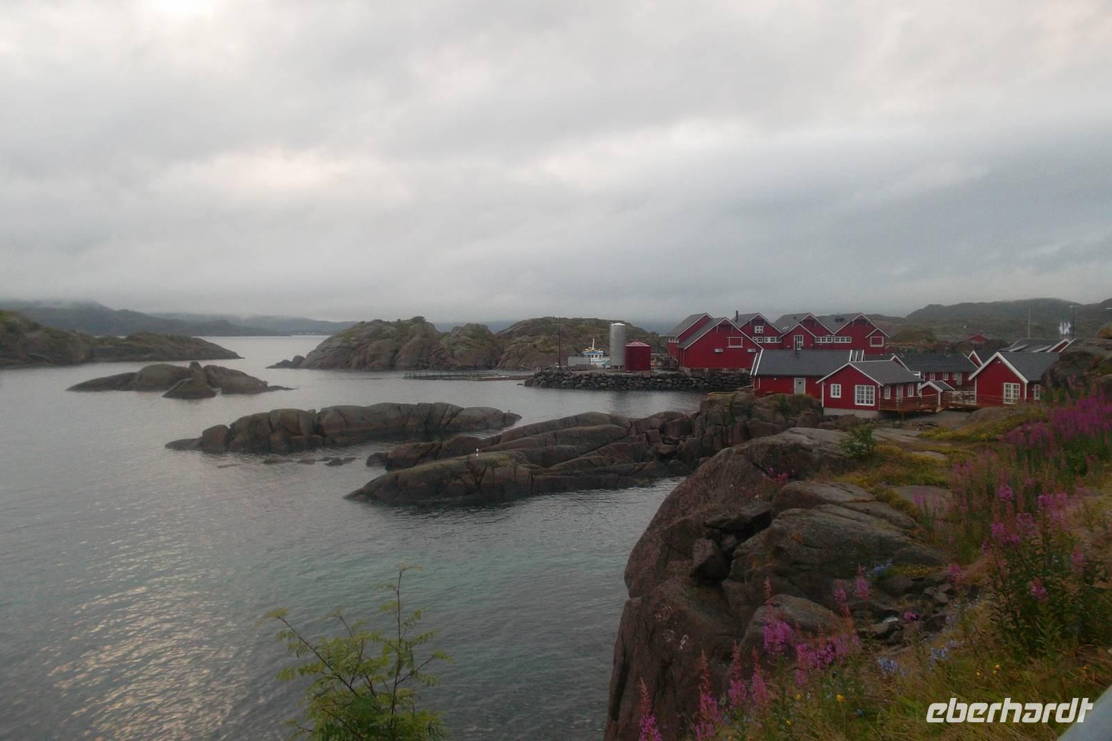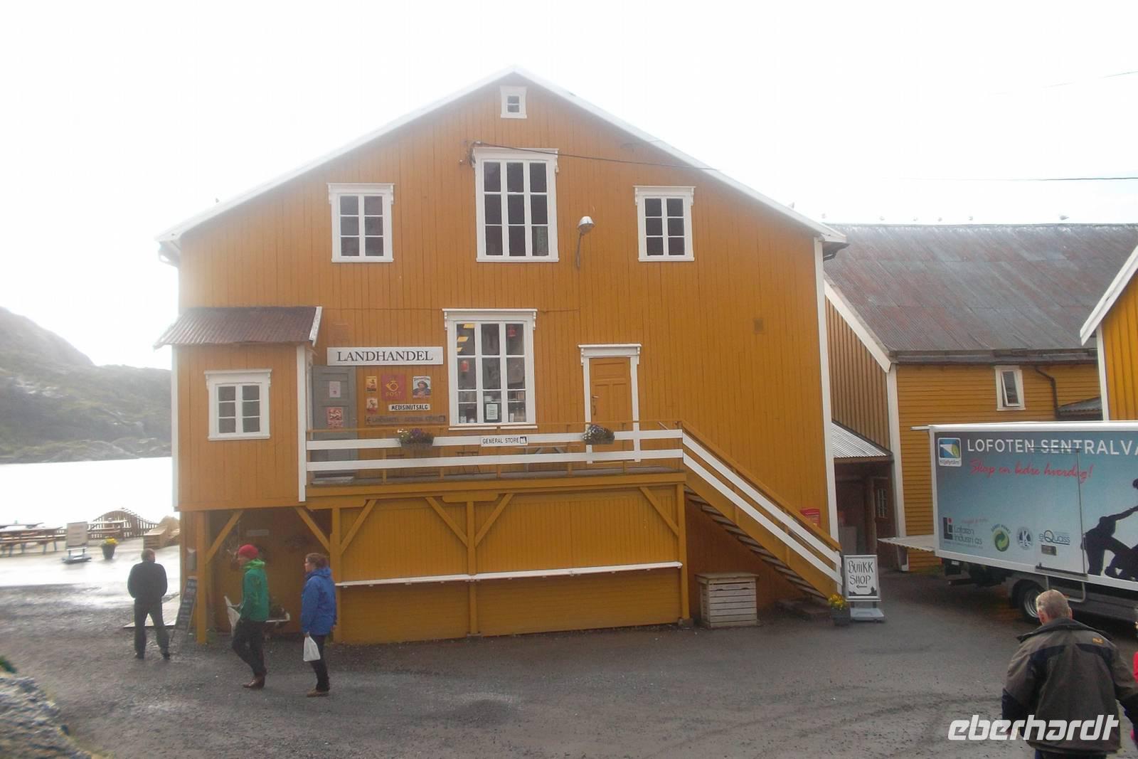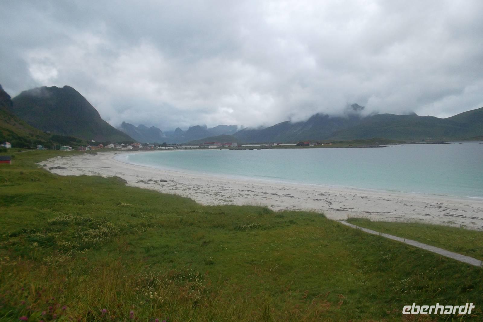 Leider begann der Tag mit schlechtem Wetter und Regen. Die führte uns zunächst gen Süden und zur originellen Kirche von Flakstad, die einst aus Treibholz errichtet wurde. Das Wetter begann sich zu bessern und der Regen hatte schon aufgehört, als wir den berühmtesten Badestrand der Lofoten bei Ramberg erreichten. Zwar gibt es hier selten eine Wassertemperatur über 13 Grad, aber die abgehärteten Lofoten-Insulaner baden hier im Sommer und nennen daher den Strand „Copacabana". Auf dem Weg zurück zu den nächsten Besichtigungen besuchten wir zunächst das entzückende Fischerdörfchen Nusfjord. Es ist ein Ort, in dem die Zeit stehen geblieben scheint und den alle Besucher lieben. Da das Fischerdorf inzwischen zum UNESCO-Weltkulturerbe zählt, muss man hier Eintritt bezahlen. Das lohnt sich aber, denn die Atmosphäre in diesem Ort ist für das alte Norwegen typisch und beschreibt gut das Leben in einem solchen abgeschiedenen Lofotenwinkel.