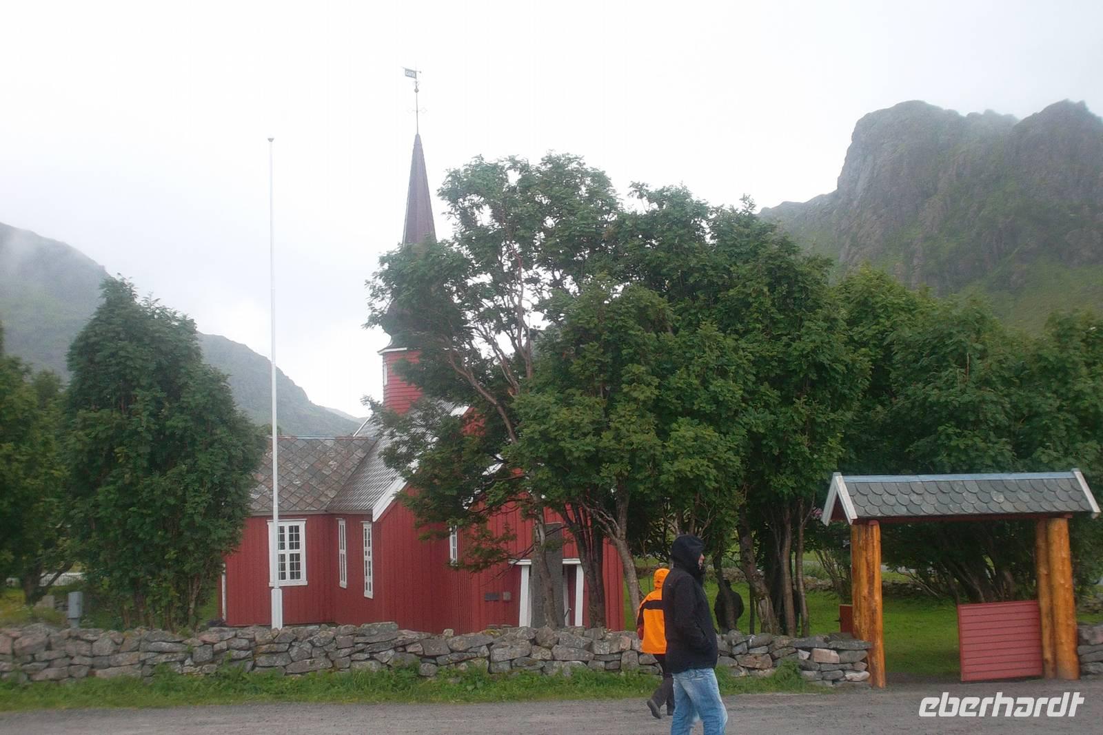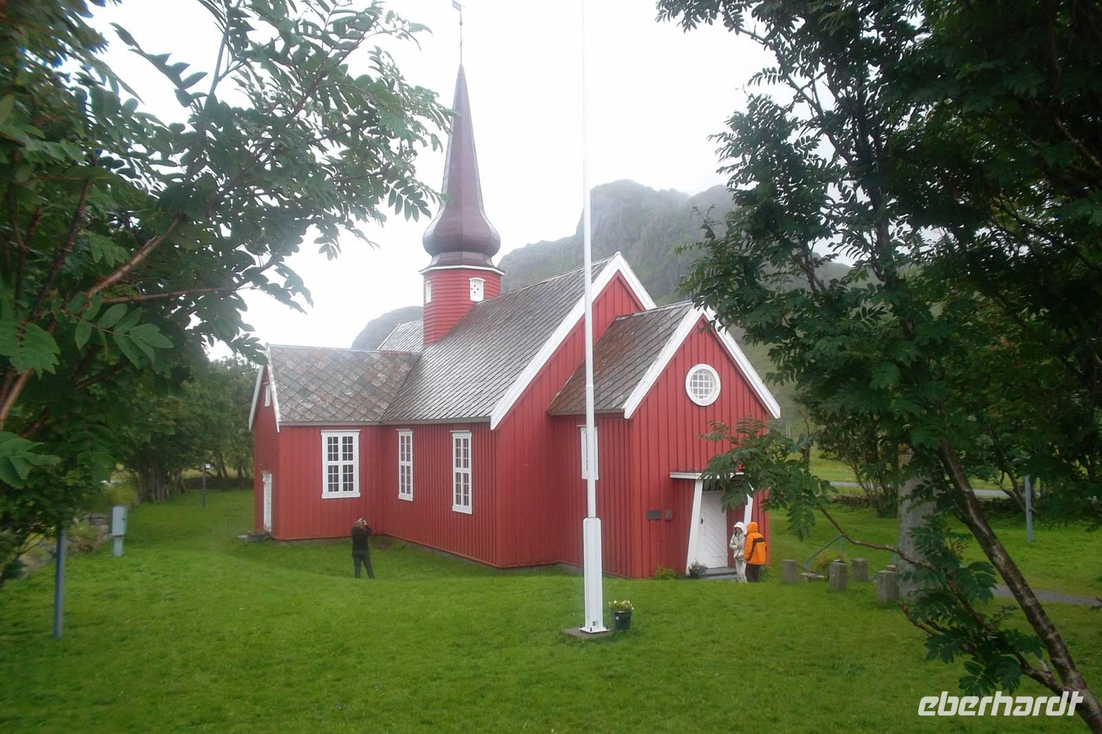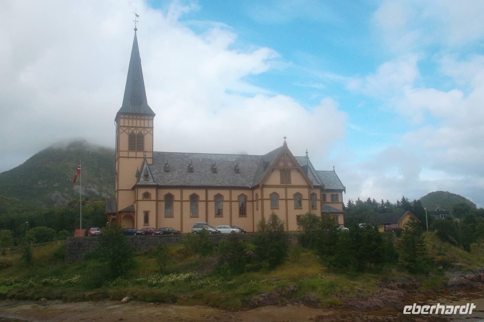 Auf dem weiteren Weg zur Inselgruppen-Hauptstadt Svolvaer unterbrachen wir die Fahrt für einen Fotostopp an der Lofot-Kathedrale. Einst hieß sie „Vågan-kirke", wurde 1898 im neugotischen Stil errichtet und bietet Platz für 1200 Gottesdienstteilnehmer. Deswegen wird sie "Lofotkatedralen" genannt und ist zudem die größte Holzkirche nördlich von Trondheim. Angeblich wurde sie hier am Erzbischofssitz vorgefertigt und ihre Bauteile wurden erst in Kabelvåg zusammengesetzt.