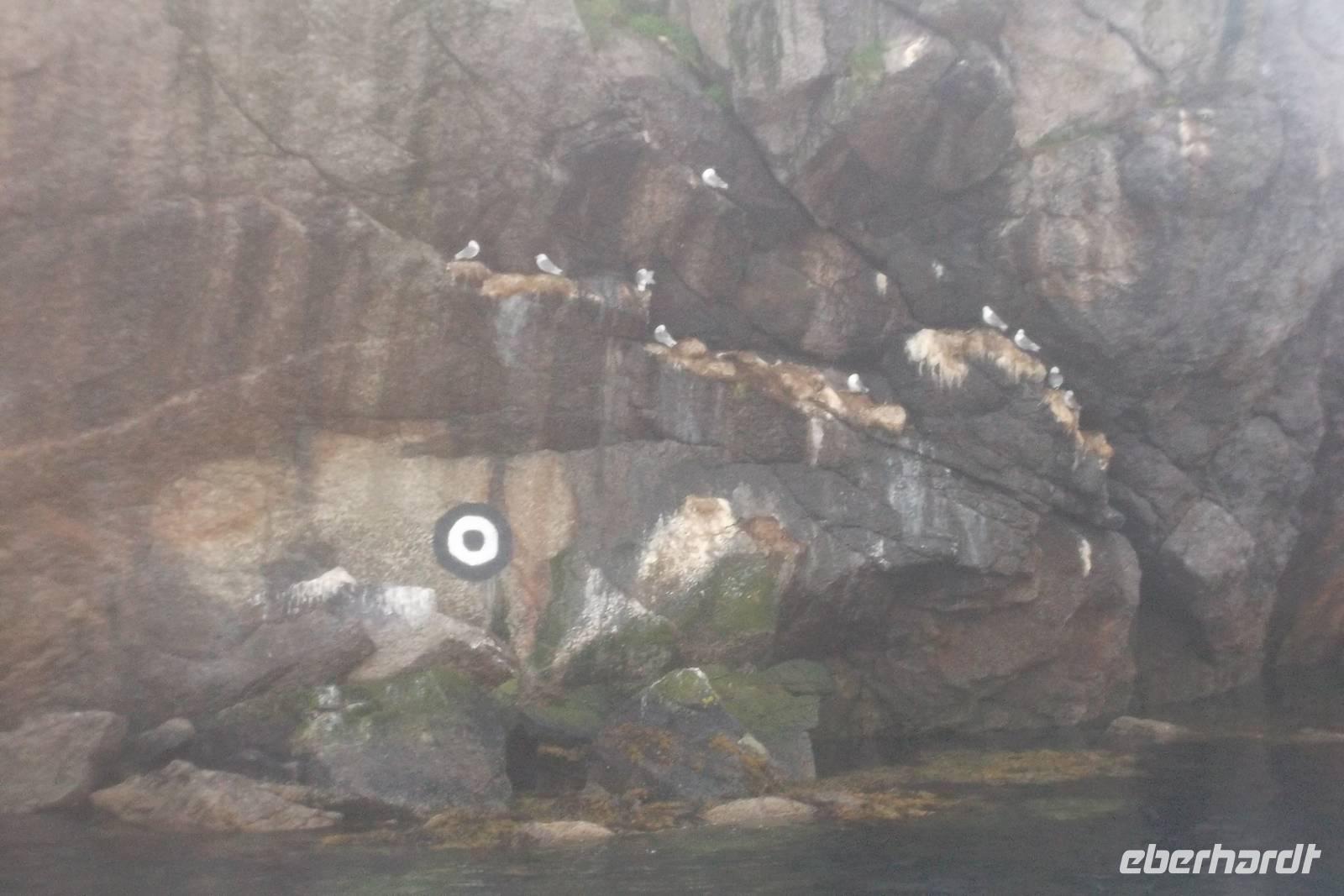 Allerdings erzählte ich unseren Reisegästen die hübsche Sage über das Gebirge, das wir nicht sahen: Hestmannen, der ungehorsame Sohn eines Trollkönigs, lebte nahe einem König, der sieben Töchter hatte. Da sie alle kaum zu bändigen waren, schickte der König sie in die Lehre zur ehrbaren Jungfrau Lekamøya. Aber Trollprinz Hestmannen sah, wie Lekamøya ein Bad im Fjord nahm und entbrannte in Liebe zu ihr. In voller Rüstung raste er über den Vestfjord und trieb alle Mädchen in die Flucht. Die sieben Schwestern, die Hestmannen recht attraktiv fanden, hielten alle in der Flucht inne und hockten sich nebeneinander, damit er sie sähe und vielleicht zur Frau begehre. Aber der Trollprinz hatte nur Augen für Lekamøya, nahm schließlich seinen Bogen und schoss einen Pfeil auf sie ab, um ihre Flucht zu stoppen. Dem König von Sømna - einer Halbinsel, die wir durchquerten - ging dies zu weit und er warf seinen Hut, um den Pfeil aufzuhalten. Auf der Insel Torgar blieb der Hut durchschossen liegen und bildet heute den Torghatten, einen Felsen mit Loch als markante Landmarke. Leider haben wir all das wegen des miesen Wetters nur hinter Nebelbänken vermuten können. Denn laut der Norweger-Sage vergaßen alle Beteiligten die Kürze der nordischen Sommernächte und versteinerten dort, wo sie gerade saßen, als die Sonne aufging. Der Hutberg Torghatten, der Gebirgszug „Sieben Schwestern" bei Sandnessjøen und der Berg Lekamøya auf der Insel Leka, sind bis heute zu sehen. .