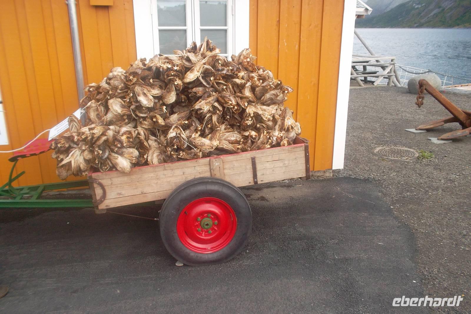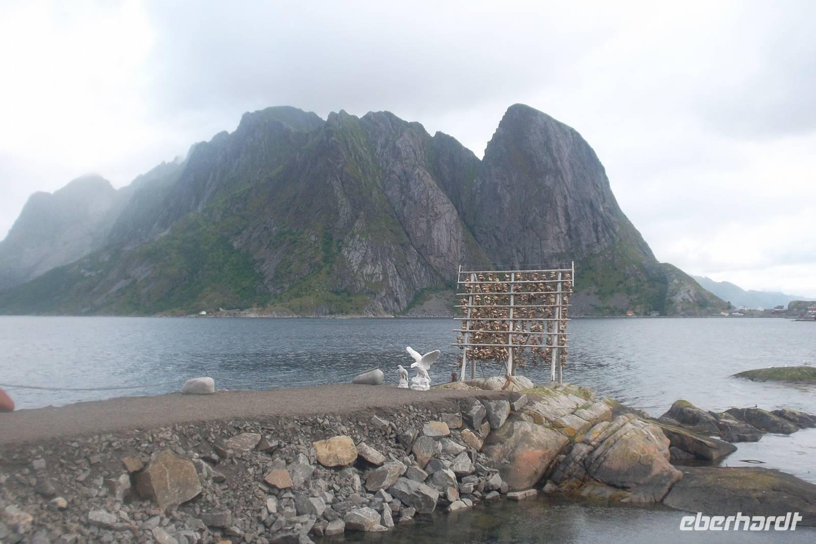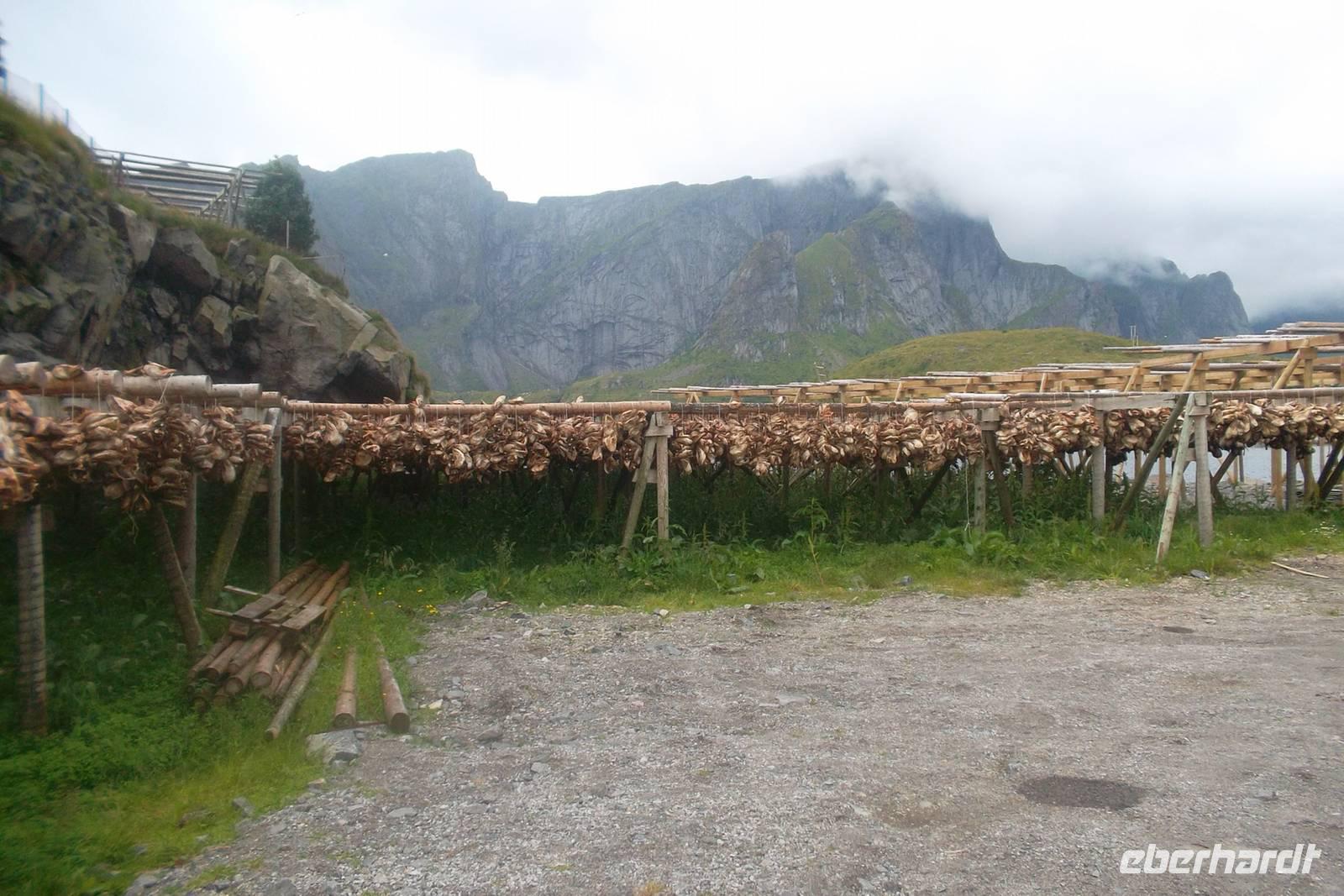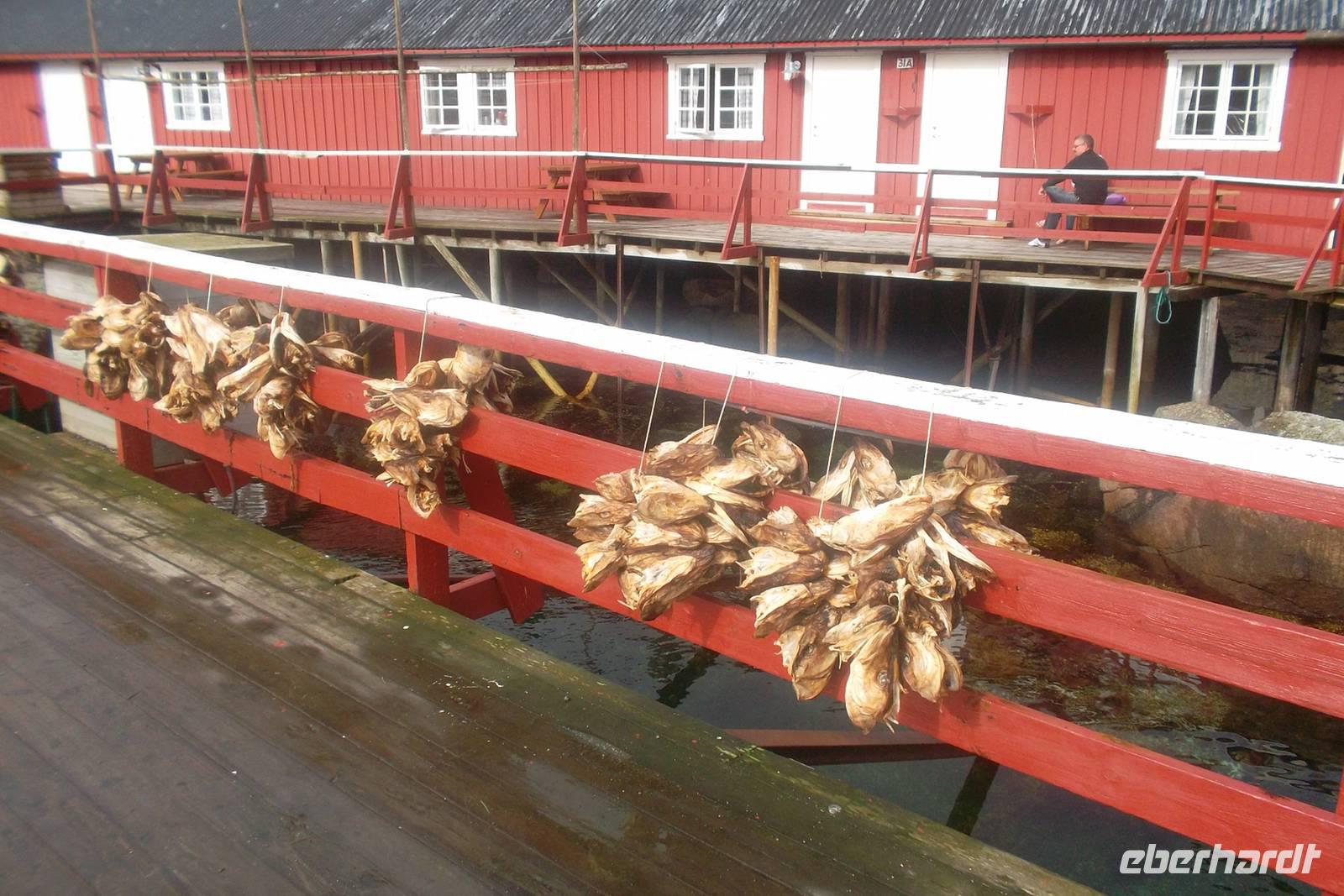 Zum Abendessen zurück in unseren Rorbuer hielt deren Chefin Brigitte einen hervorragenden Vortrag über den Stockfisch, das „Gold der Lofoten". Sie berichtete über die zahllosen Dorsch-Schwärme die hier im Winter an den Lofoten vorbeiziehen und über die Tradition der Fischerei und Haltbarmachung seit Jahrhunderten. Das besondere Klima der Lofoten leistet dem Trocknen der getöteten und ausgeweideten Kabeljaue gute Dienste - nach drei Monaten Trocknung sind sie für Jahrzehnte haltbar. Die Köpfe werden extra getrocknet und zu Fischmehl verarbeitet oder als Suppengrundlage nach Afrika verkauft. Stockfische kann man Jahrzehnte aufbewahren und getrocknet und in Brösel geschlagen (mit dem Hammer oder über die Tischkante) isst man sie in Norwegen als Snack (wie gesalzene Erdnüsse). Werden sie wieder aufgeweicht und zubereitet, kann man ein „normales" Fischgericht daraus machen. Die ergiebigen Stockfischvorräte Nordnorwegens, dienten - vermittelt über die Hanse - dazu, um das christliche Europa in der Fastenzeit zu ernähren. Hanse und die Stadt Bergen - die sich stets von der Hanse distanzierte - sind damit reich geworden.