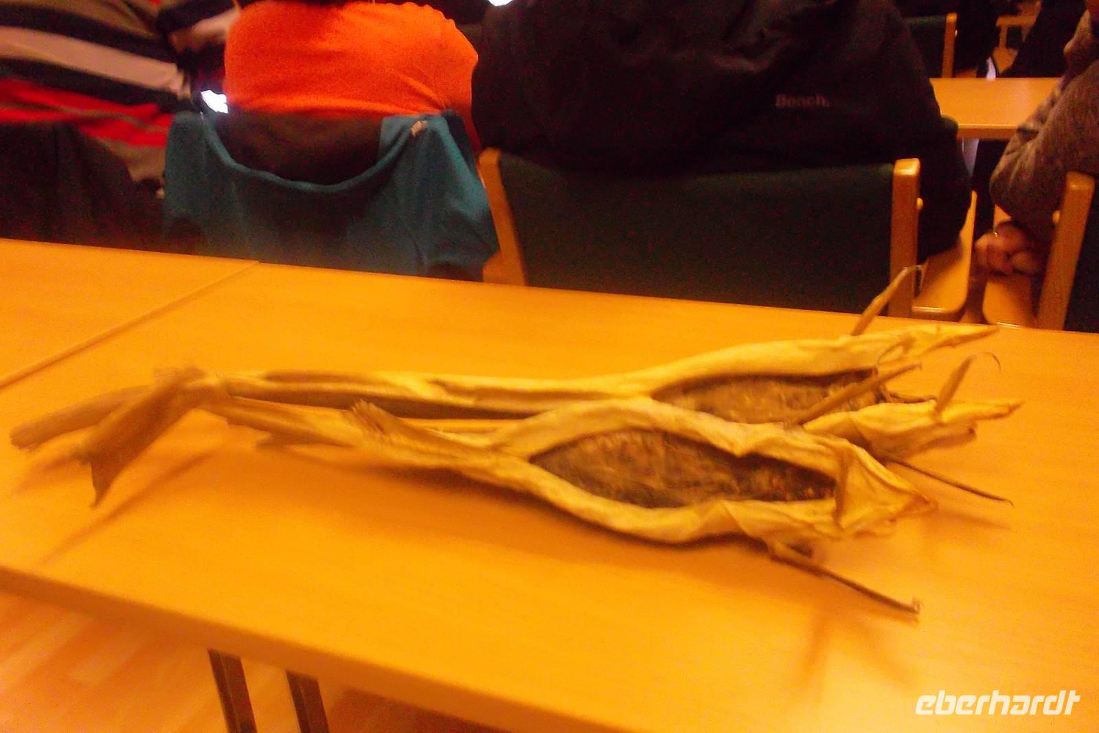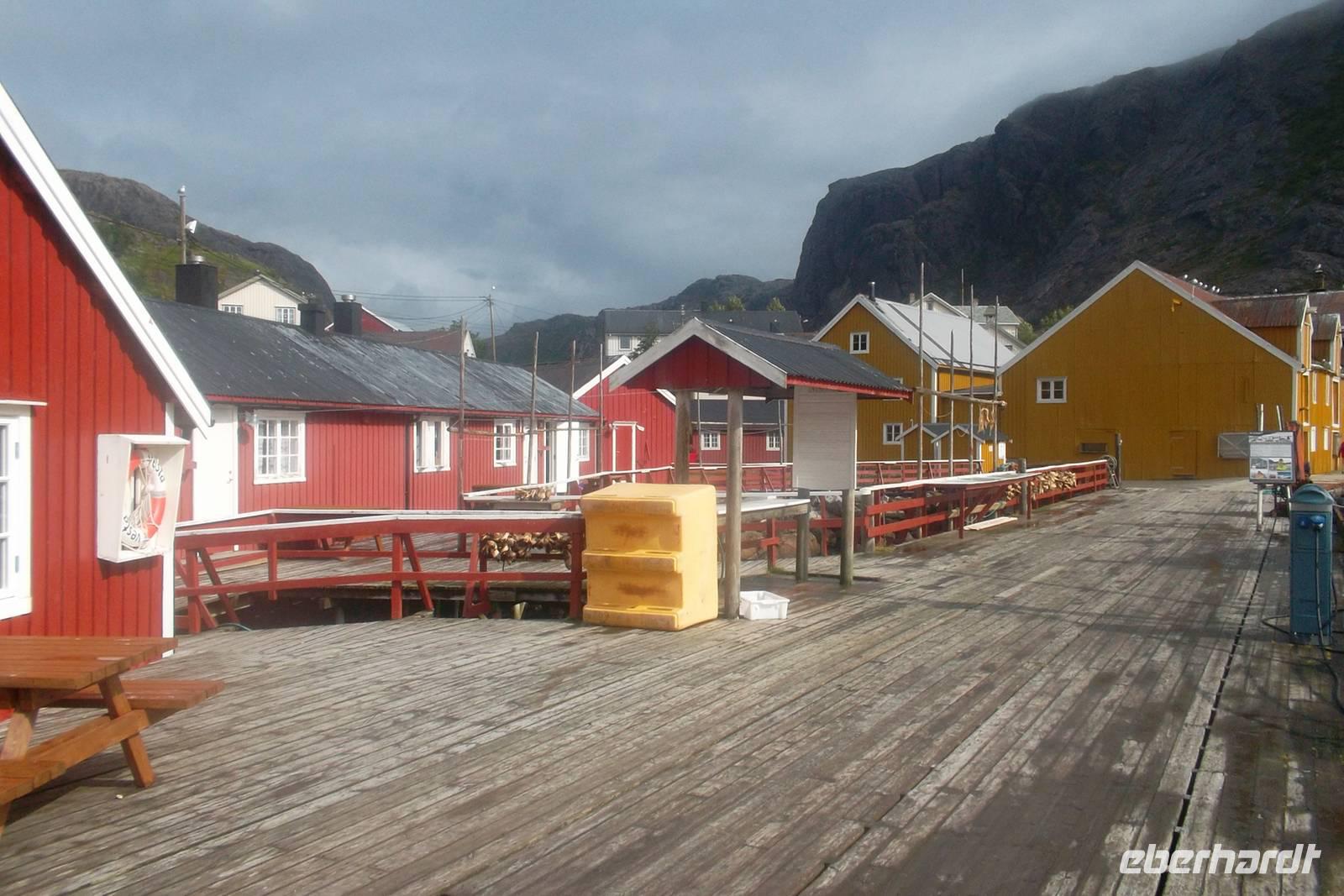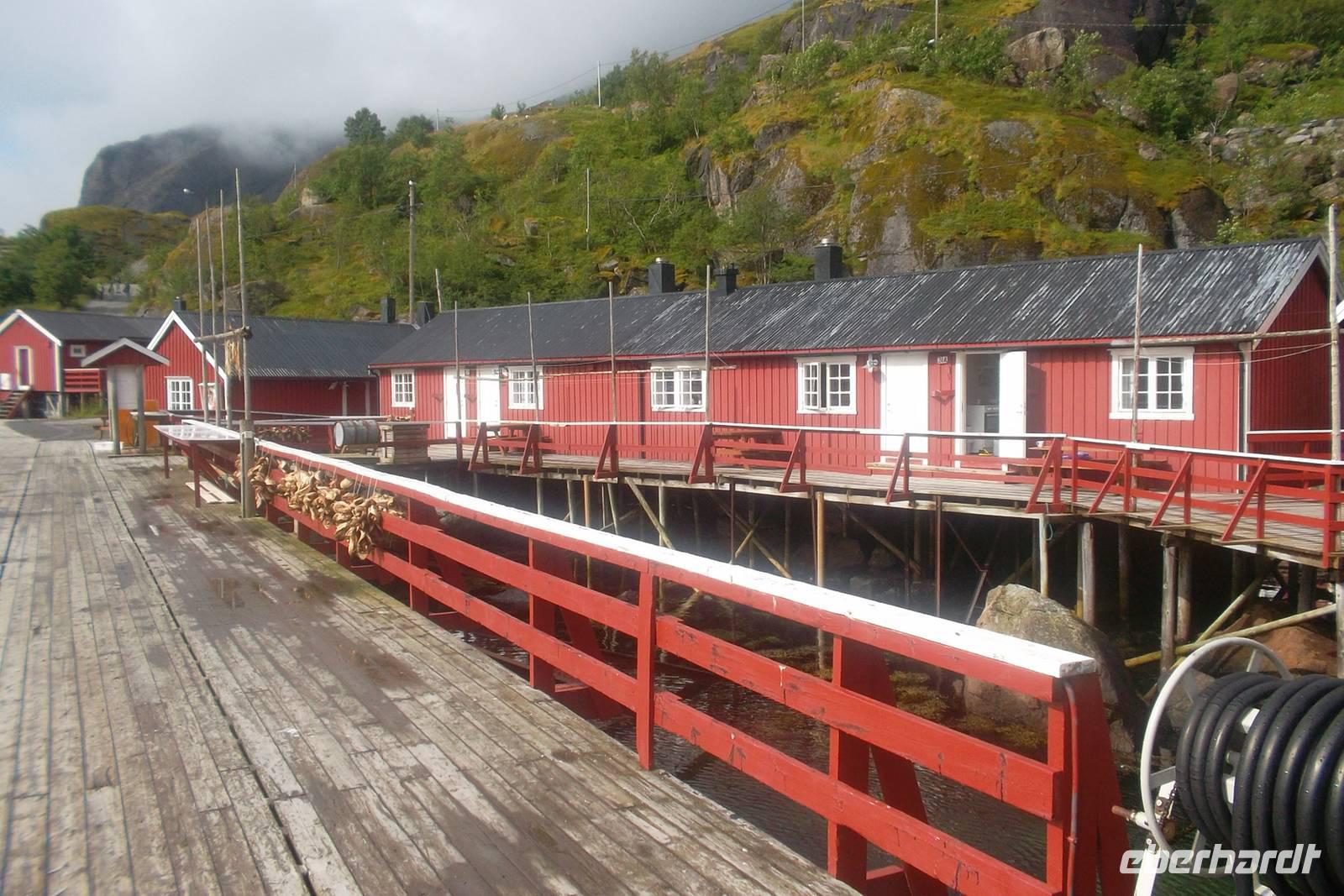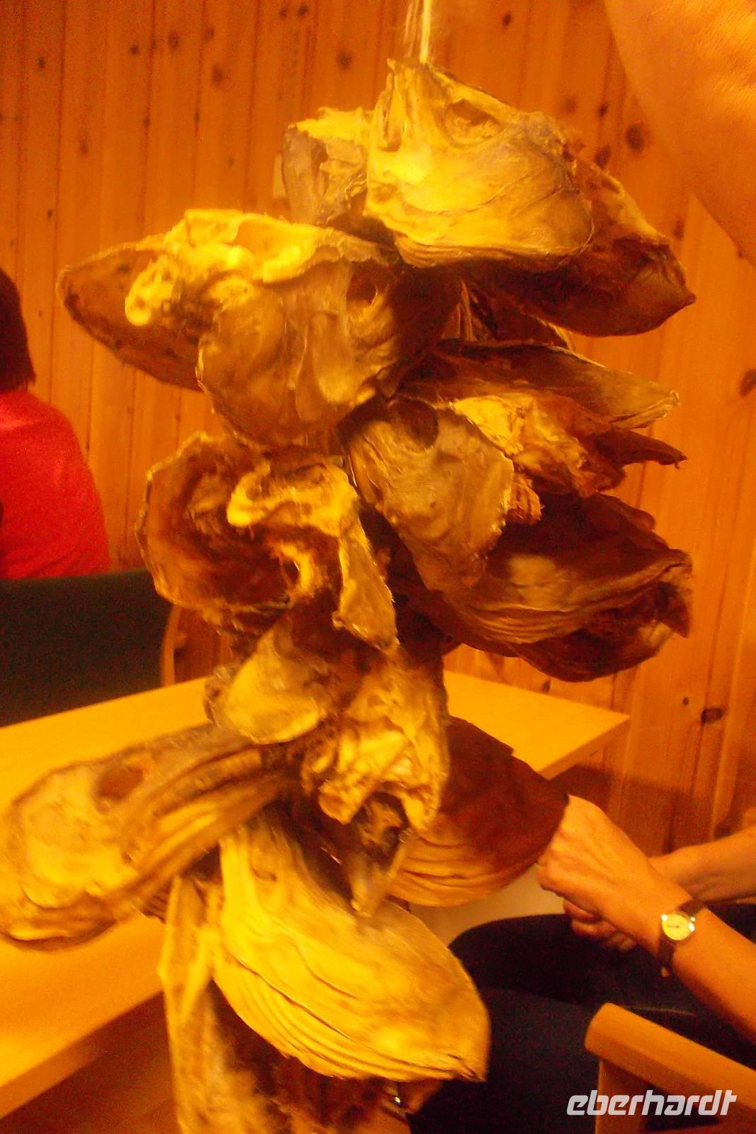 Zum Abendessen zurück in unseren Rorbuer hielt deren Chefin Brigitte einen hervorragenden Vortrag über den Stockfisch, das „Gold der Lofoten". Sie berichtete über die zahllosen Dorsch-Schwärme die hier im Winter an den Lofoten vorbeiziehen und über die Tradition der Fischerei und Haltbarmachung seit Jahrhunderten. Das besondere Klima der Lofoten leistet dem Trocknen der getöteten und ausgeweideten Kabeljaue gute Dienste - nach drei Monaten Trocknung sind sie für Jahrzehnte haltbar. Die Köpfe werden extra getrocknet und zu Fischmehl verarbeitet oder als Suppengrundlage nach Afrika verkauft. Stockfische kann man Jahrzehnte aufbewahren und getrocknet und in Brösel geschlagen (mit dem Hammer oder über die Tischkante) isst man sie in Norwegen als Snack (wie gesalzene Erdnüsse). Werden sie wieder aufgeweicht und zubereitet, kann man ein „normales" Fischgericht daraus machen. Die ergiebigen Stockfischvorräte Nordnorwegens, dienten - vermittelt über die Hanse - dazu, um das christliche Europa in der Fastenzeit zu ernähren. Hanse und die Stadt Bergen - die sich stets von der Hanse distanzierte - sind damit reich geworden.