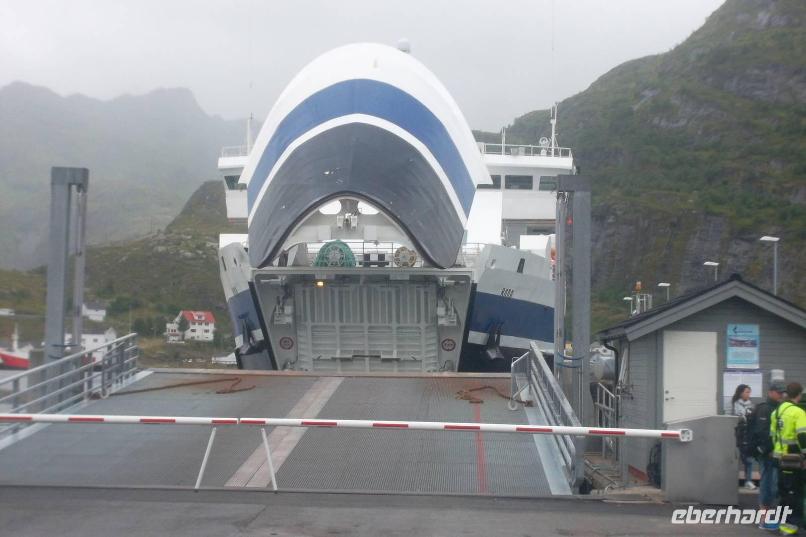 Die Fähre zum norwegischen Festland fährt von Moskenes am südlichen Ende der Lofotenkette ab. So mußten wir früh aufbrechen, hatten aber Zeit für einen Fotostopp im pittoresken Ort Sarisøya und noch einmal nahe dem malerischen Fischerdörfchen Reine. Pünktlich erreichten wir die Fähre nach Bodø, auf die man mit allen Passagieren im Bus hinauffährt. Fast dreieinhalb Stunden dauert die Überfahrt , bei der man den gewaltigen Moskenes-Straumen kreuzt. Nach dem bei Bodø gelegenen Saltstraumen ist er einer der gewaltigsten Gezeitenströme der Welt, bei dem durch Ebbe bzw. Flut zweimal pro Tag hunderte Millionen Kubikmeter Wasser durch die relativ enge Wasserstraße zwischen der Inselkette der Lofoten und dem Festland gepresst werden. Ein nicht durch Motorkraft angetriebenes Boot oder Schiff kann dieser Naturgewalt kaum etwas entgegensetzen - genau das beschreibt der Schriftsteller Edgar Allan Poe in seiner Gruselgeschichte „Im Mahlstrom".