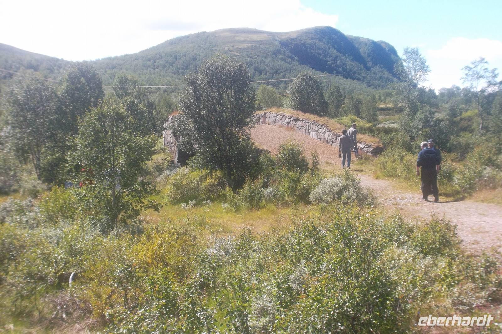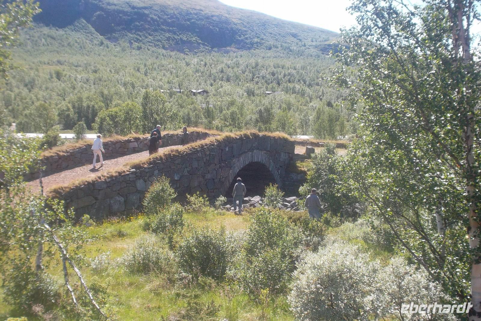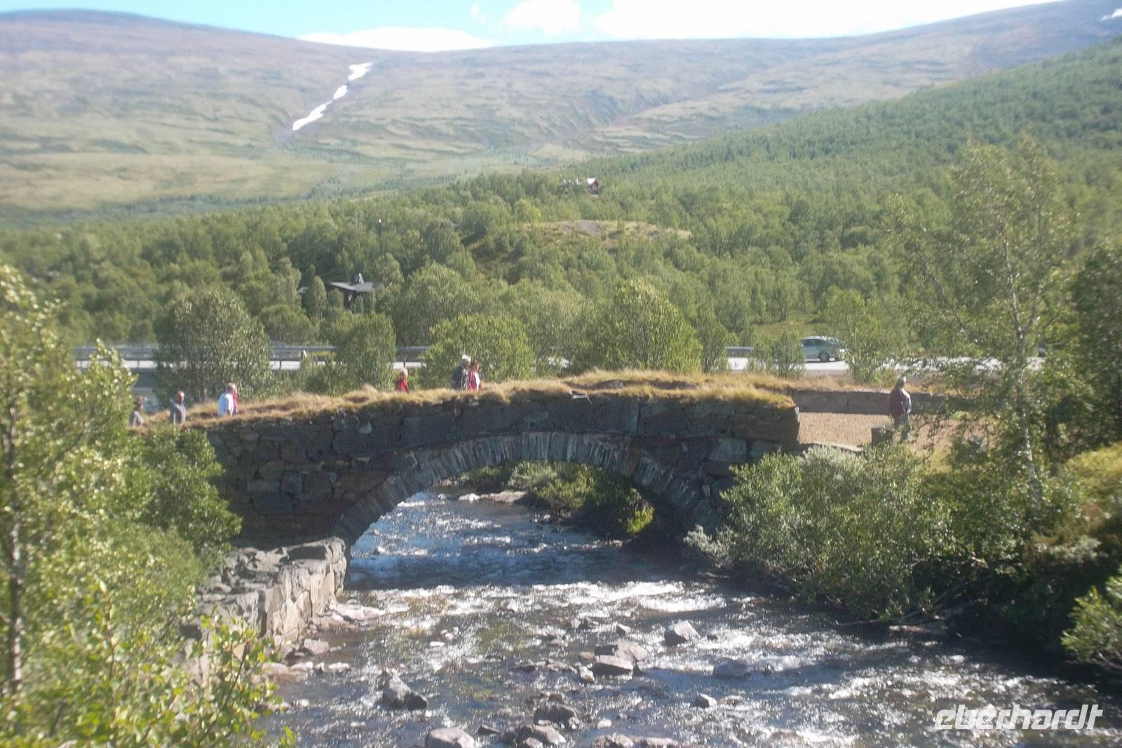 Bei herrlichem Wetter fuhren wir sodann über das Oppdal und das Drivatral zum das Dovrefjell. Hier muss man die Gäste vor den Umtrieben der gefährlichen Trolle warnen - überall hausend sind sie hinterhältig, zauberkräftig und zwischen fünfzig Zentimetern und zwölf Metern groß. Sie sind sehr selten dem Menschen freundlich gesonnen, aber einige - beispielsweise die durchtriebenen weiblichen Huldra - sehen oft hübsch aus, blond und aufreizend und sind sehr durchtrieben. Gefährlich sind alle Trolle, aber etwas Spaß hatten unsere Gäste schon an den Erklärungen und Souvenir-Trolle haben die meisten auch gekauft. Für Norweger aber sind sie wichtig, die Geschichten, Sitten und Gebräuche, die mit den Trollen in ihrem Land zusammenhängen. Die Überquerung des trollgefährdeten Dovrefjells, einer wilden und unwirtlichen Hochfläche, gereichte uns zur Ehre. Wir fanden uns sogar zum Fotostopp nach Dovregubbens Hall ein. Dies ist die Unterkunft des gefährlichsten und wohl auch größten aller Trolle. Da er nicht zu Hause war, konnten wir seine historische Brücke und den ihm zugesprochenen Hof fotografieren. Früher war dieser Ort - Brücke und Gehöft - Bestandteil des historischen Königsweges Trondheim bis Bergen, Stavanger bis Oslo.