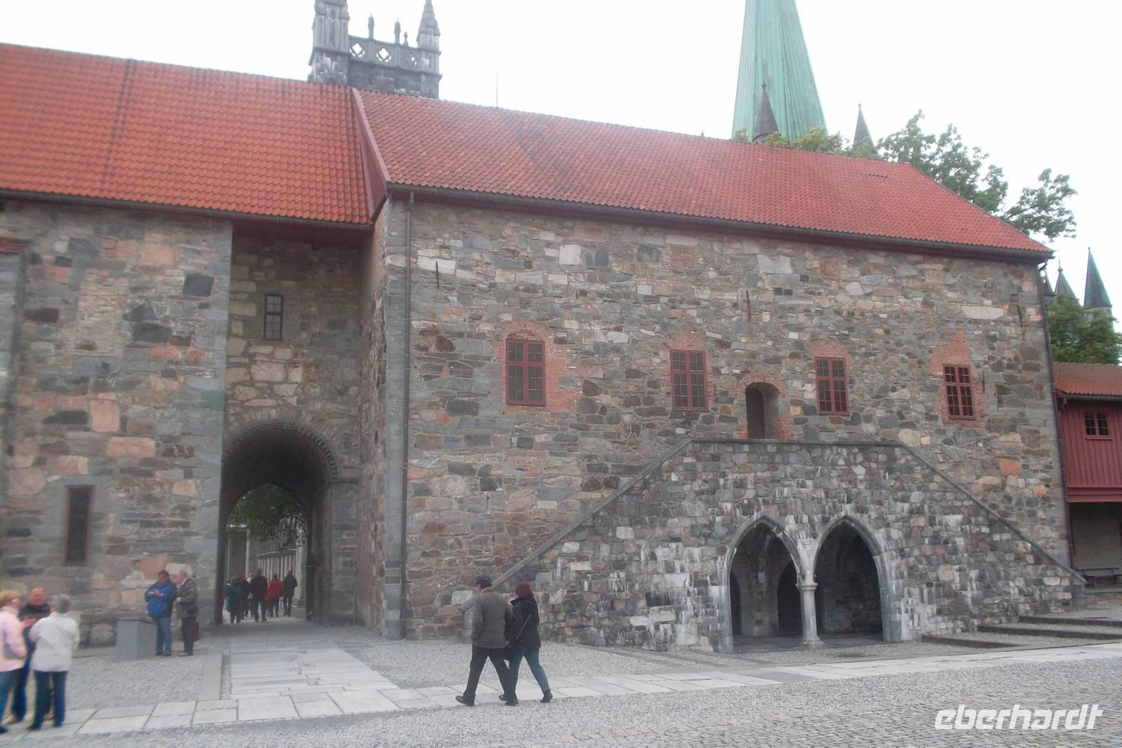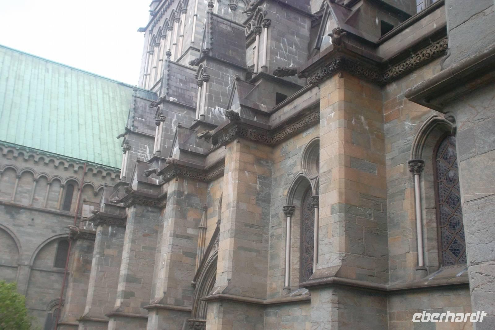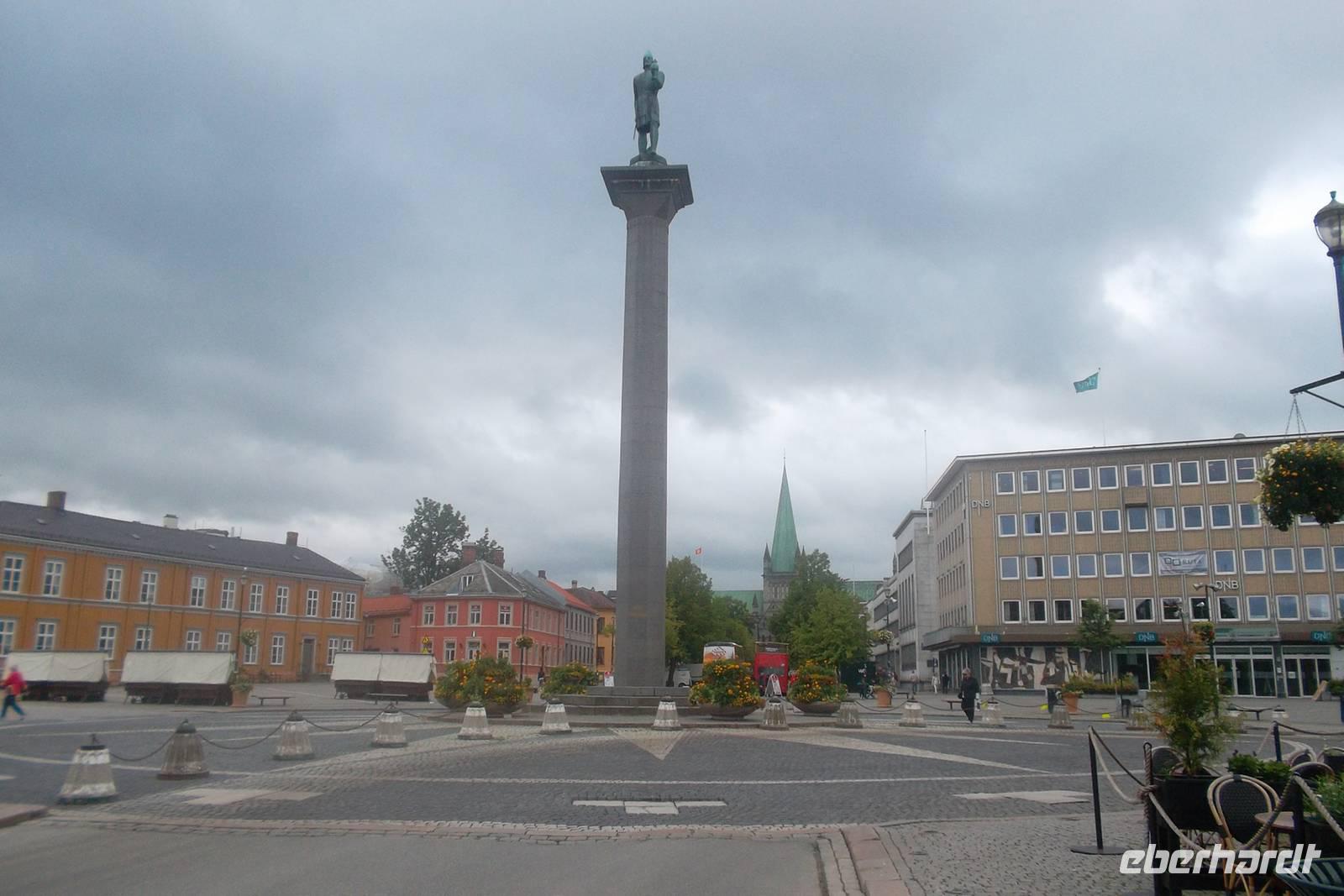 Das Wetter war uns heute gnädiger gesonnen. Beim ersten Tagesziel, der alten Krönungsstadt Trondheim, konnte der Bus neben dem Dom parken. Auf einer Mini-Stadttour gönnten wir uns zunächst eine kleine Brückenbesichtigung der historischen „Dahls-Altstadtbrücke". Von hier gibt es den einmaligen Blick auf das UNESCO-Welterbe, die historische Speicherstadt am Nidelv. Gleich daneben finden sich das Stadtzentrum und der Dom. Eine kurze Außenbesichtigung des berühmten Nidarosdomes, - des größten und bekanntesten Sakralbaues in Skandinavien - gestatteten wir uns, bevor wir den Erzbischofspalast als ältestes Profangebäude Skandinaviens ansahen. Ein Eingangstor aus dem 12. Jh. Ist hier zu sehen, den Ort beherrscht aber der Dom. Imposant am Nidelven aus grünem Seifenstein erbaut, prunkt der seit 1865 wiedererstandene und in Kleinarbeit zusammengefügte Dom mit seiner herrlichen Westfassade, als Schirmfassade zur Schau erbaut. Seit dem 11. Jahrhundert mit zahlreichen Umbauten über dem ehemaligen Grab des Heiligen Olav, der einst das Christentum in Norwegen einführte, errichtet, ist der Dom eines der wichtigsten Bauwerke in Skandinavien. Zudem besahen wir das nahebeiliegende Bischofspalais, von dem noch einige mittelalterliche Reste sowie moderne Anbauten erhalten sind. In der Freizeit in Trondheim konnten die Gäste selbst einen kleinen Abstecher in den Dom kurz vor dem Gottesdienst machen oder eine kleinen Bummel im Stadtzentrum mit Olavs-Säule.