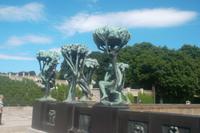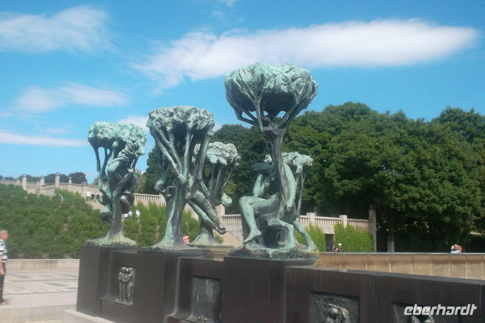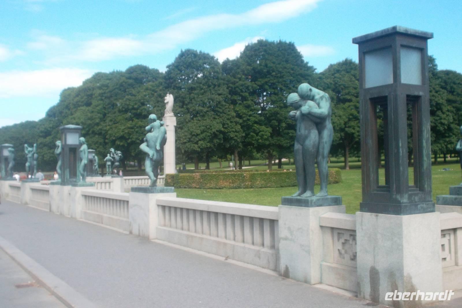 Die Hauptattraktion Oslos ist aber wohl der Vigelandpark, der eigentlich „Frognerpark" heißt. Mit fast 300 Hektar ist er der größte Park Norwegens und wurde zwischen 1907 und 1942 gestaltet. Die Ideen und Bildwerke nur eines einziges Künstlers, Gustav Vigeland (1869 - 1943), des bedeutendsten Bildhauers Norwegens schmücken im heute nach ihm genannten Park hunderte Stein- und Bronzefiguren, die alle dem „Zyklus des Lebens" gewidmet sind. Der Kreislauf des menschlichen Lebens, Kämpfe mit Begierde und Schwierigkeiten, Zusammenleben und Auseinandersetzungen zwischen den Generationen aber auch zwischen Mann und Frau sind das Thema, das im Park immer wieder mit zahlreichen Figurengruppen behandelt wird. Zentraler Punkt des Parks ist der auf einem Hügel stehende sogenannte „Monolith", auf dem in bewegten Reliefs mit 131 Figuren die Entwicklung vom Embryo über das Kindheit und alle weiteren Lebensstadien dargestellt sind. Nach Ende der Parkführung durch Stig wartete der Bus auf uns. Wir verließen Oslo nach weiterem Toilettenstopp an der Oper, um die noch zahlreichen Kilometer zu unserer Fähre in Göteborg In Angriff zu nehmen. Nach Kurzem Mittagsstopp an der Reichsgrenze nahe dem Svinesund verließen wir Norwegen. Pünktlich zum Check in erreichten wir die Fähre und freuten uns auf das tolle Abendbuffet auf der „Stena Germanica".