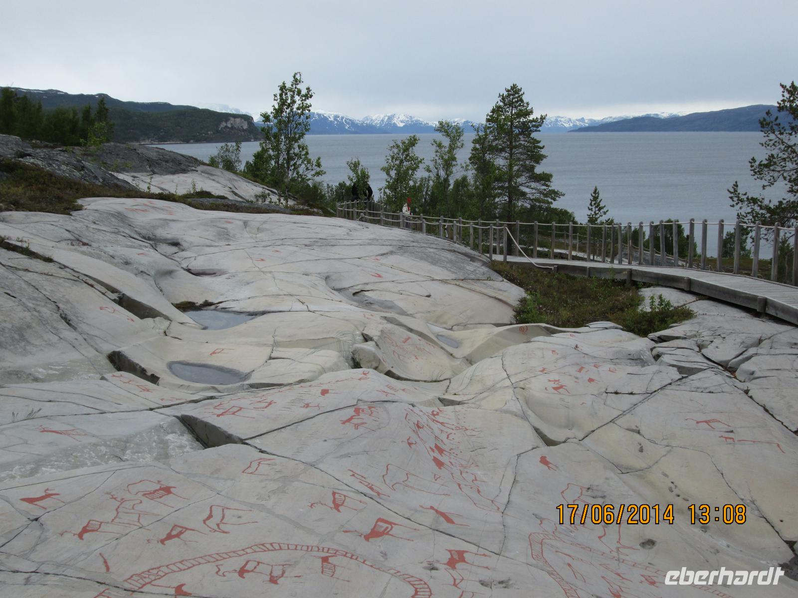 Vor ca. 6200 Jahren hatten Menschen auf Steinen Zeichnungen von Rentieren, Walen u.a. aufgetragen, die später zufällig gefunden wurden und heute die besondere Sehenswürdigkeit in Alta darstellen. Als Weltkulturerbestätte haben wir uns die Felszeichnungen angeschaut. In Oteren wurden wir nach einem langen Reisetag mit einem vorzüglichen Abendmahl am offenen Kamin verwöhnt.