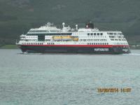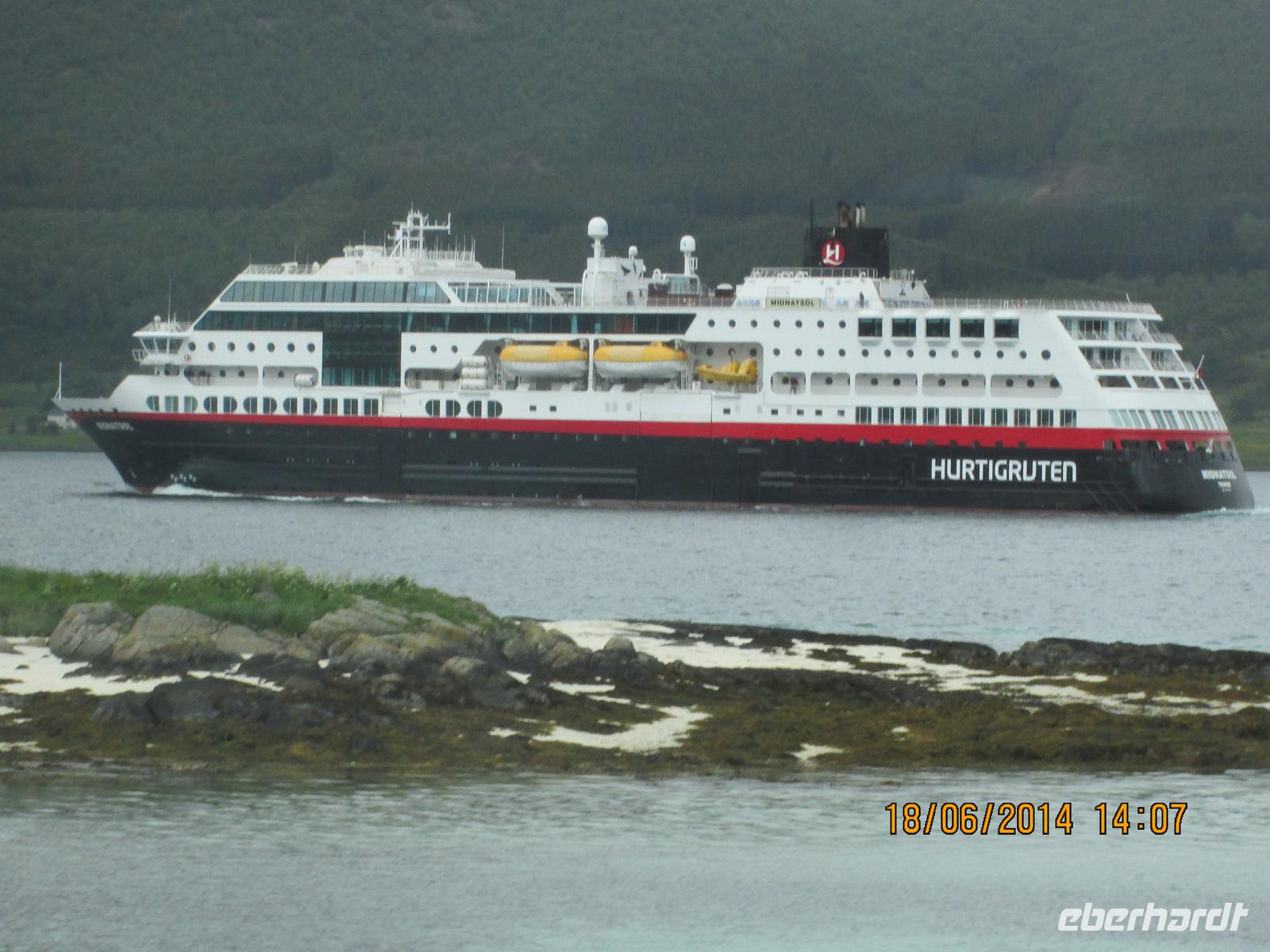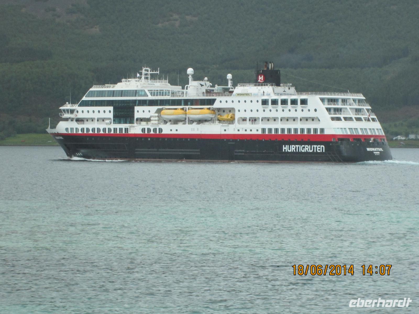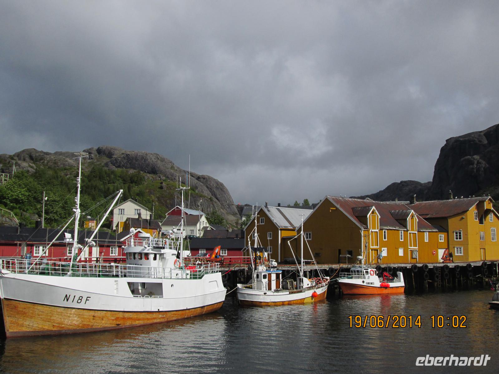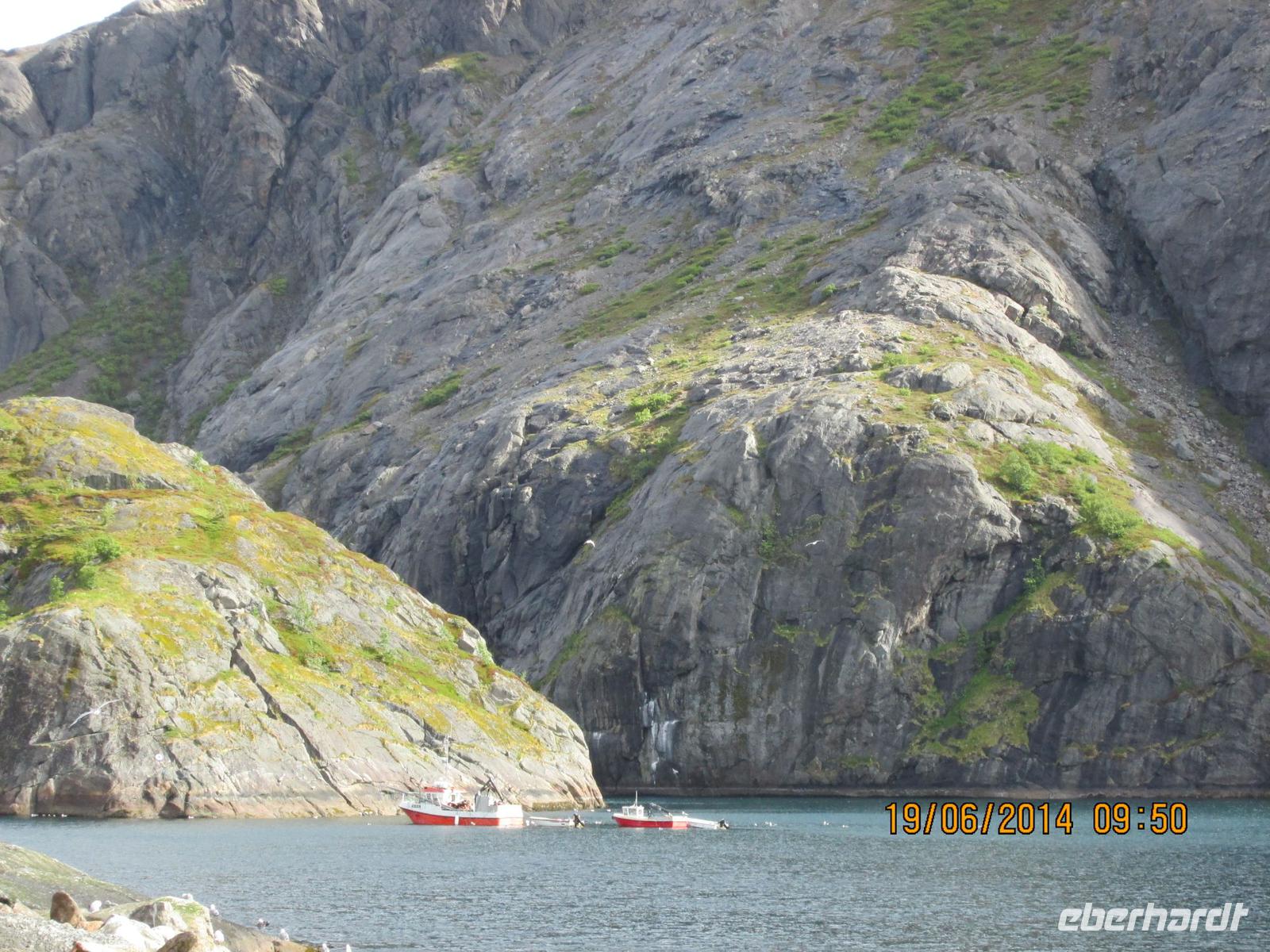 Die Provinzen Troms und Nordland mit ihren vielen Fjorden und Seen begleiteten uns Richtung Inselgruppe Vesteralen. Wer hauste in den Wäldern, unter Wasserfällen oder in einem See? Die Trolle. Unsere Reiseleiterin Heike machte uns auch mit diesen fabelhaften Wesen vertraut. So verging die Zeit trotz Regen recht schnell und ein weiterer Höhepunkt der Reise kündigte sich an: Die Hurtigruten-Passage von Stokmarknes auf den Vesteralen bis Svolvaer auf den Lofoten. Aufgrund technischer Probleme an der „Midnatsol“ konnten wir leider nicht direkt in den Trollfjord hinein fahren, der Kapitän gewährte jedoch ausreichend Zeit am schmalen felsigen Eingang, um Fotos zu machen. Eine besondere Abwechslung waren die kommenden zwei Übernachtungen in Fischerhütten, genannt Robuer, auf den Lofoten und diesmal sogar mit Mitternachtssonne.