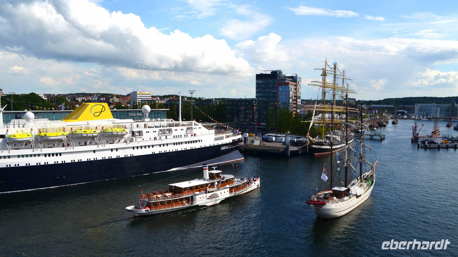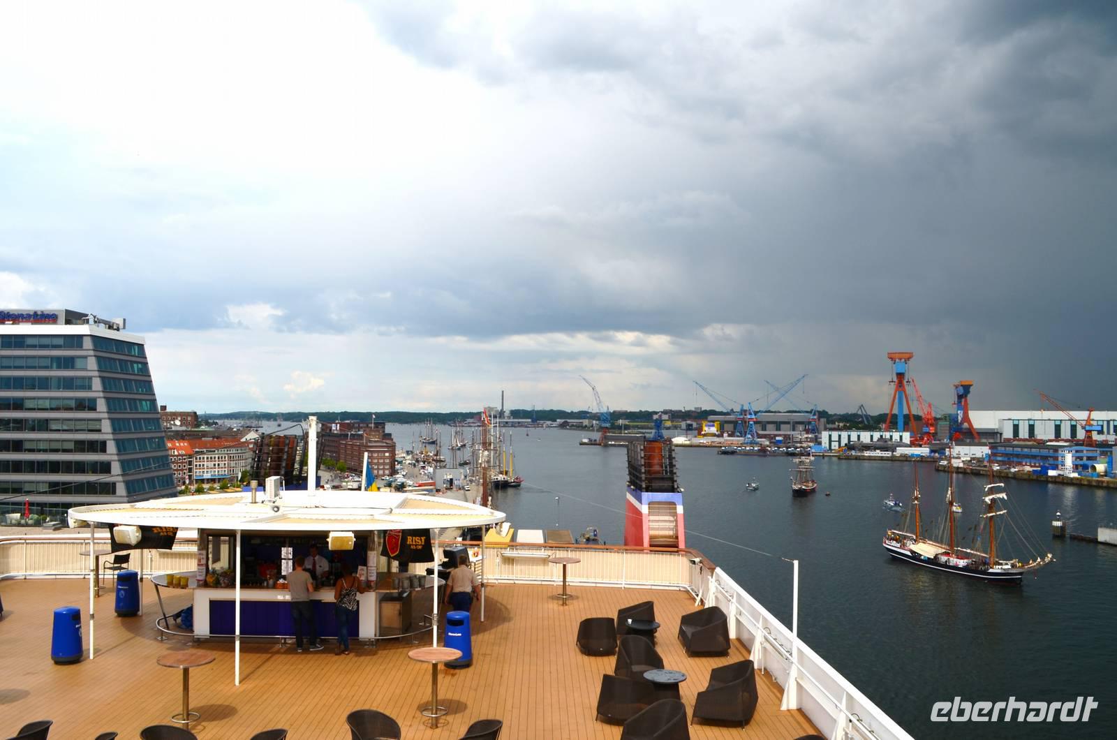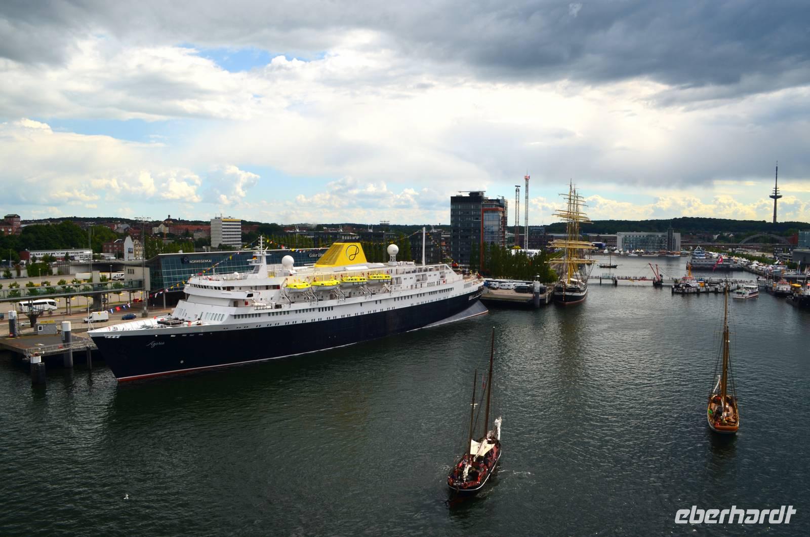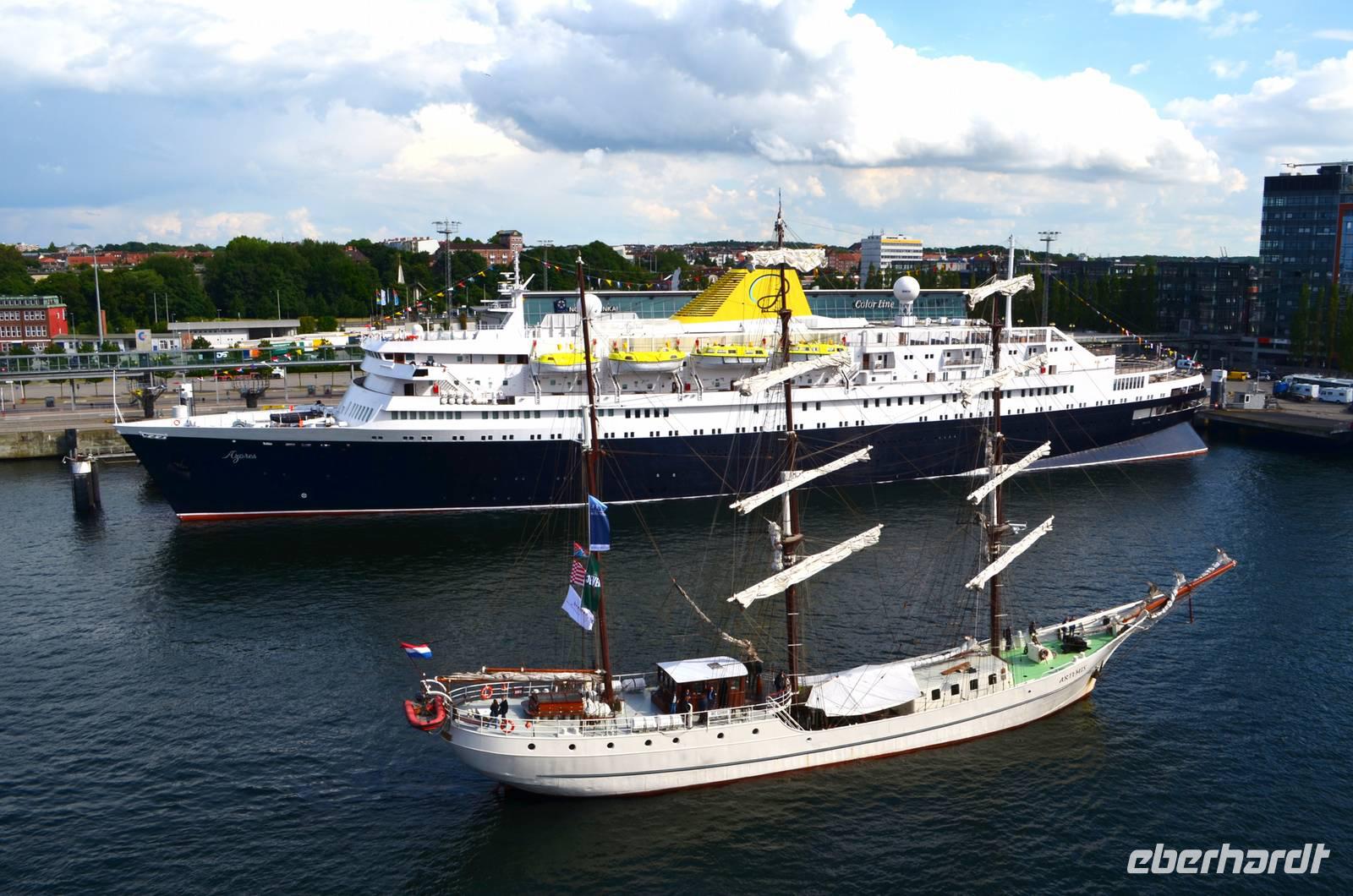 Die Weiterfahrt verläuft zügig und am frühen Nachmittag erreichen wir die Hafenstadt Kiel, wo die Stenaline-Fähre „Skandinavika" am neuen Schwedenkai schon auf uns wartet. Wir können das Schiff in Ruhe erobern und unsere Kabinen beziehen. Die gerade stattfindende Kieler Woche macht die Szenerie besonders interessant, auch wenn hier ein paar Gewitter vorbeiziehen.