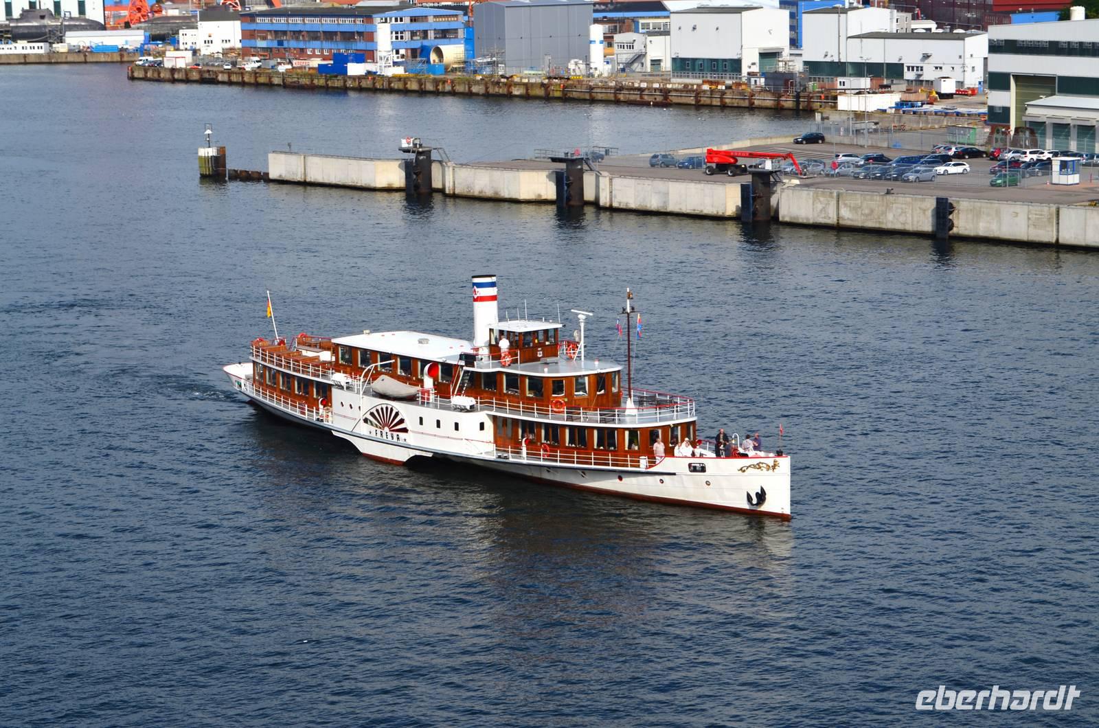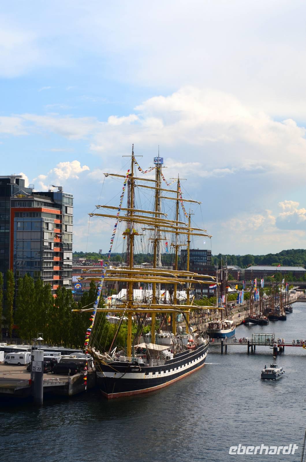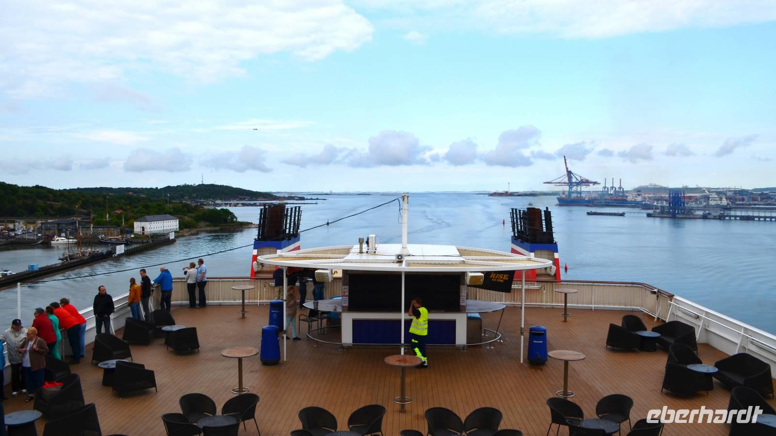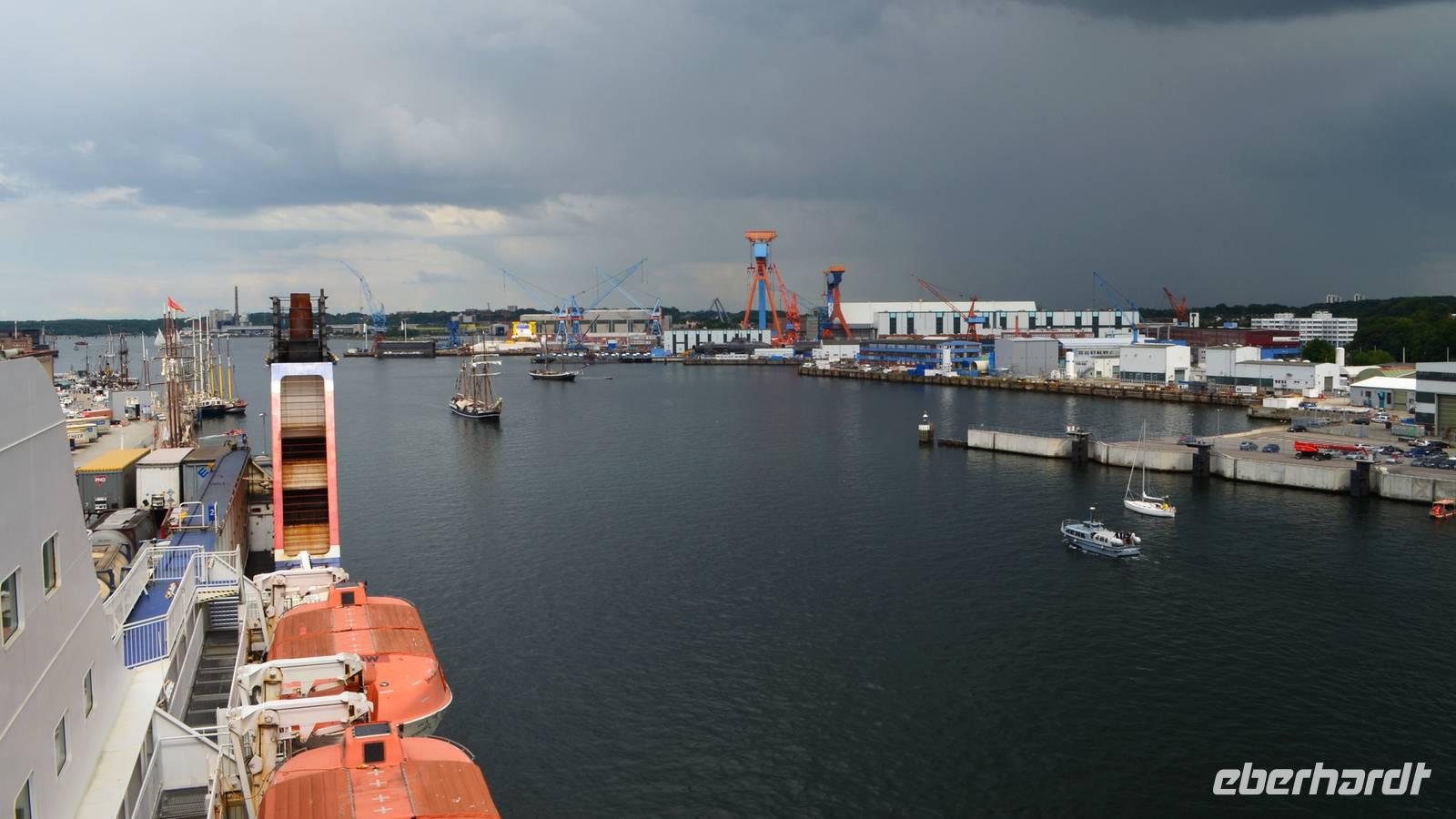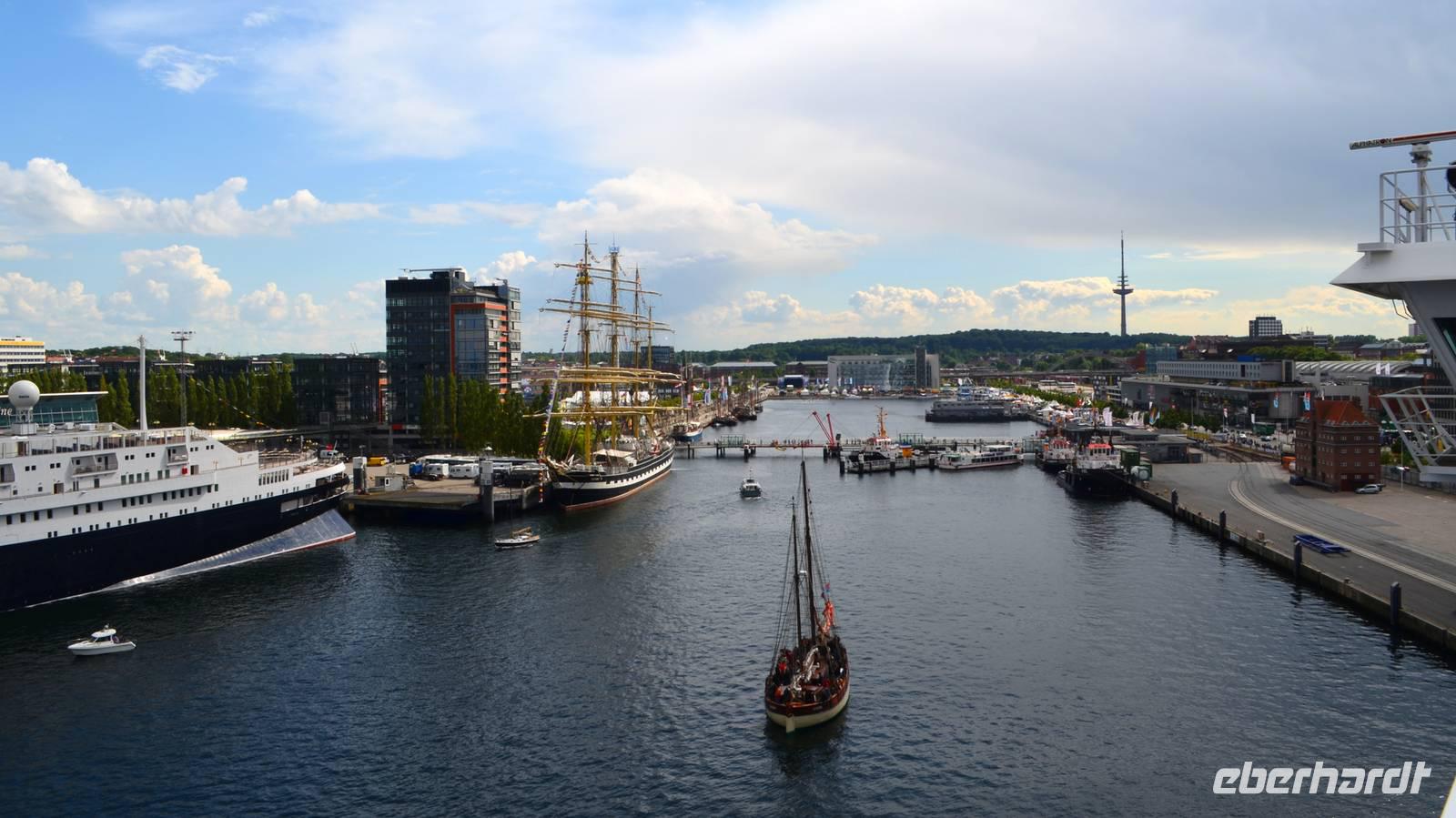 Die Weiterfahrt verläuft zügig und am frühen Nachmittag erreichen wir die Hafenstadt Kiel, wo die Stenaline-Fähre „Skandinavika" am neuen Schwedenkai schon auf uns wartet. Wir können das Schiff in Ruhe erobern und unsere Kabinen beziehen. Die gerade stattfindende Kieler Woche macht die Szenerie besonders interessant, auch wenn hier ein paar Gewitter vorbeiziehen.