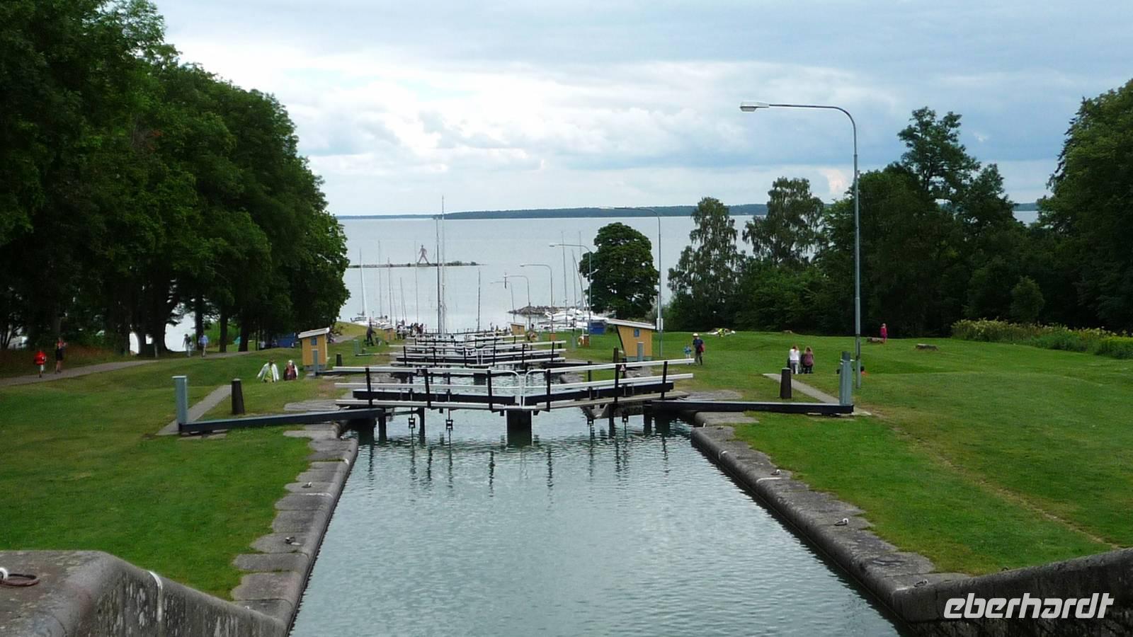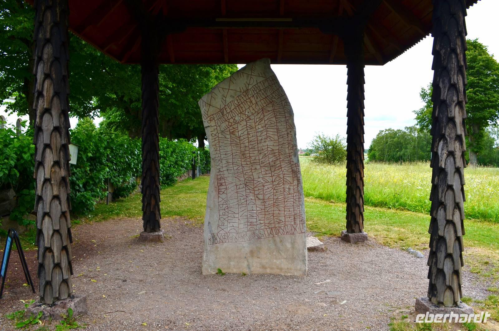 Weiter geht es dann mit unserem Bus - quer durch Göteborg und hinaus in die Landschaft des sommerlichen Südschwedens. Blühende Lupinen säumen den Straßenrand. Granitfelsen, dichte Wälder und Seen. Mancher scheint einen Elch im Wald zu entdecken. Über Jönköping, den alten Handelsplatz am Südzipfel des Vätternsees, wo die Streichhölzer erfunden wurden, geht es weiter zur Kirche von Rök. Daneben steht der berühmte Runenstein von Rök, der Stein mit der längsten Runenschrift der Welt. Nach dem Mittag geht es weiter Richtung Linköping, entlang dem Götakanal, mit Besuch der Schleusenstufen bei Berg. Immer wieder beeindrucken die technischen und arbeitsmäßigen Leistungen der Menschen, die diesen Kanal in Handarbeit aushoben.