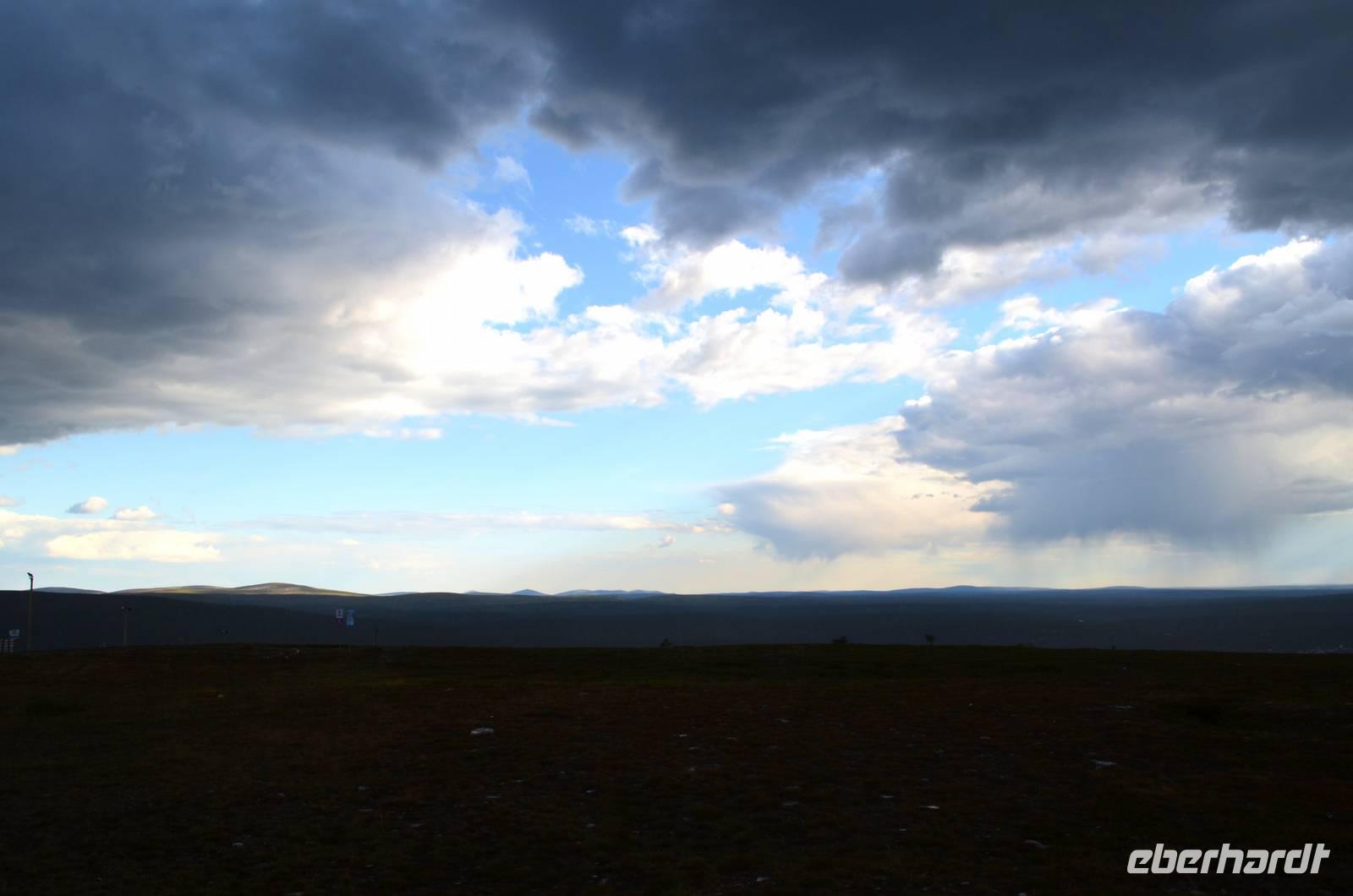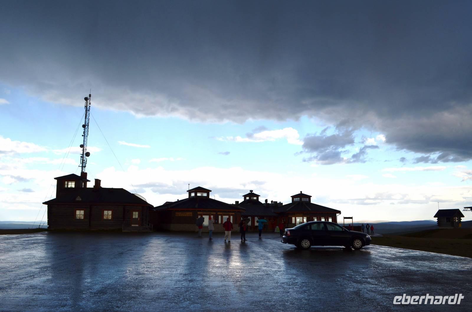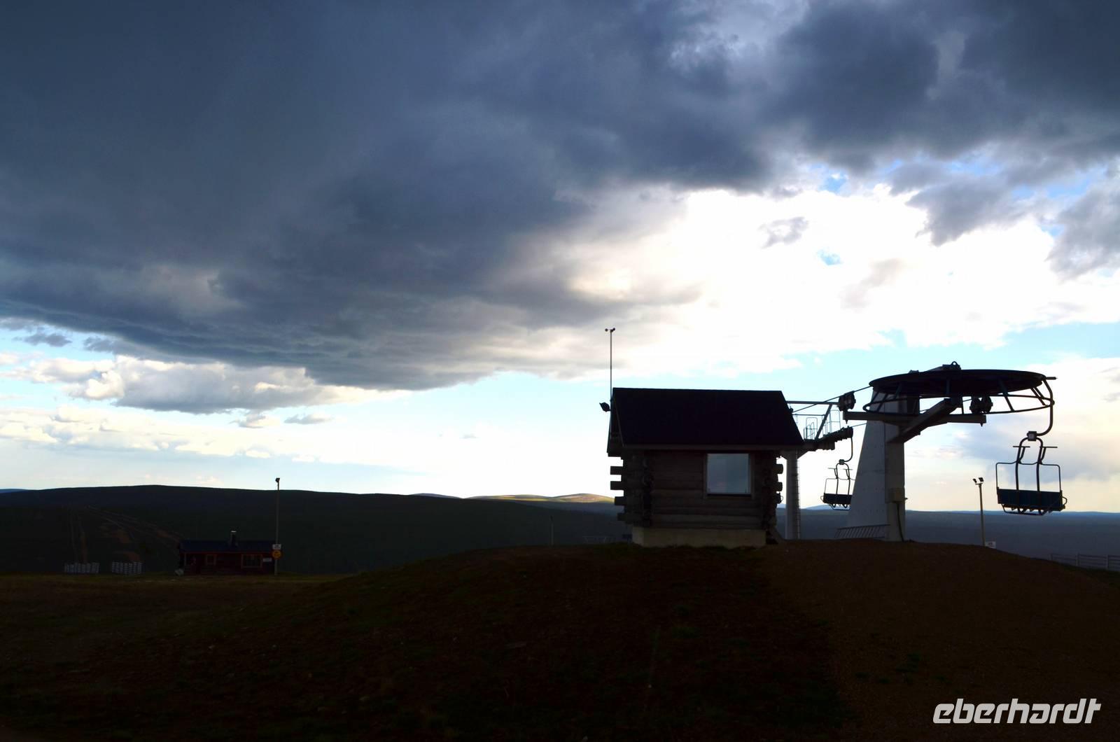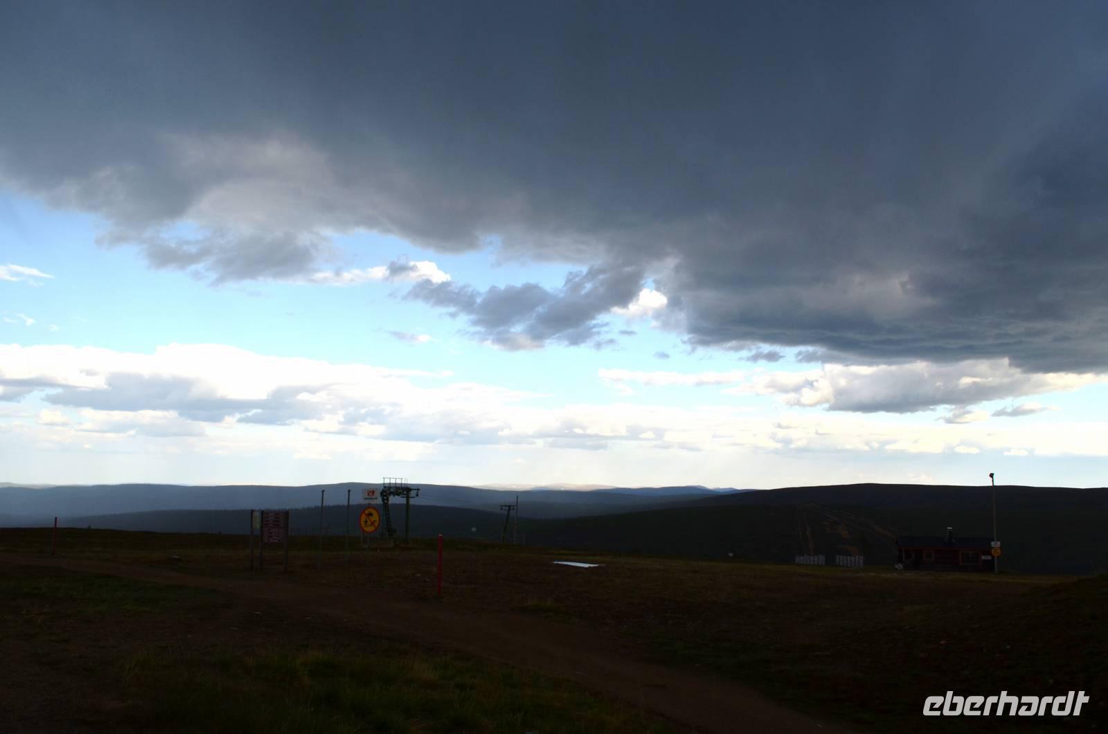 Als wir am Abend das Lappland Hotel in den Bergen von Saariselkä erreichen, geht ein Gewitterschauer auf uns nieder. Das hindert uns aber nicht daran vor dem Abendessen noch auf den nahen Aussichtsberg zu fahren.