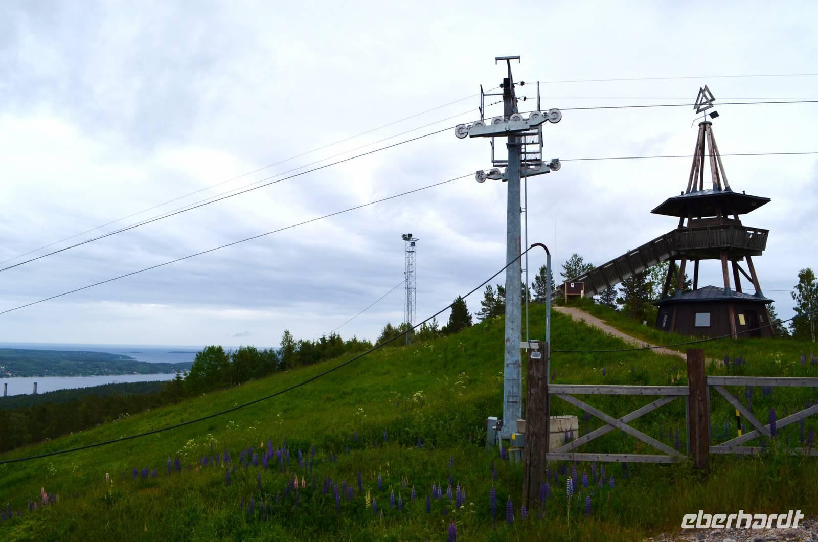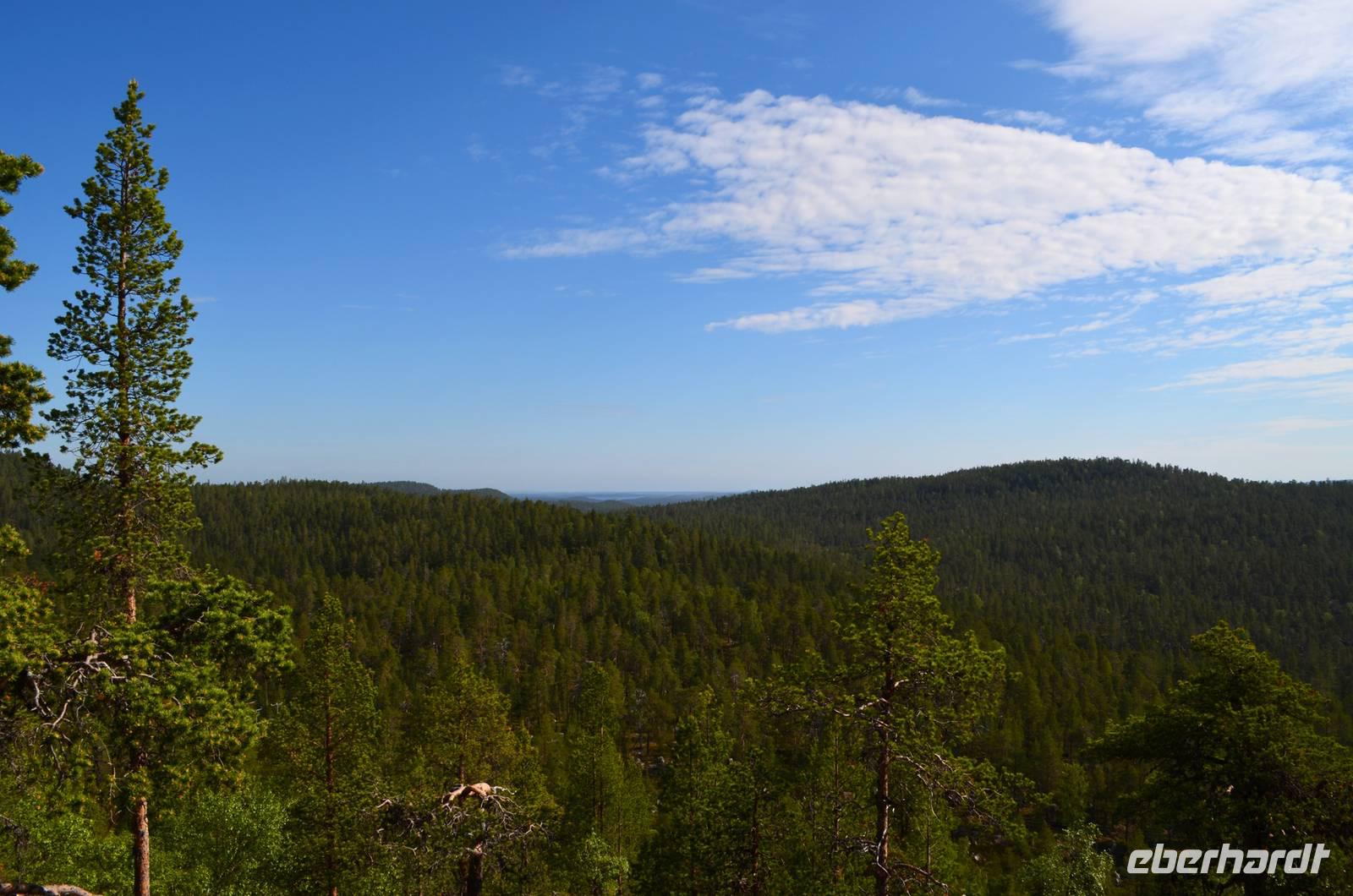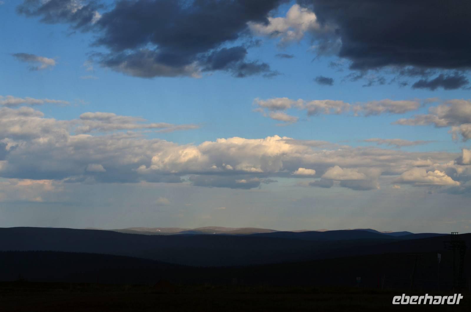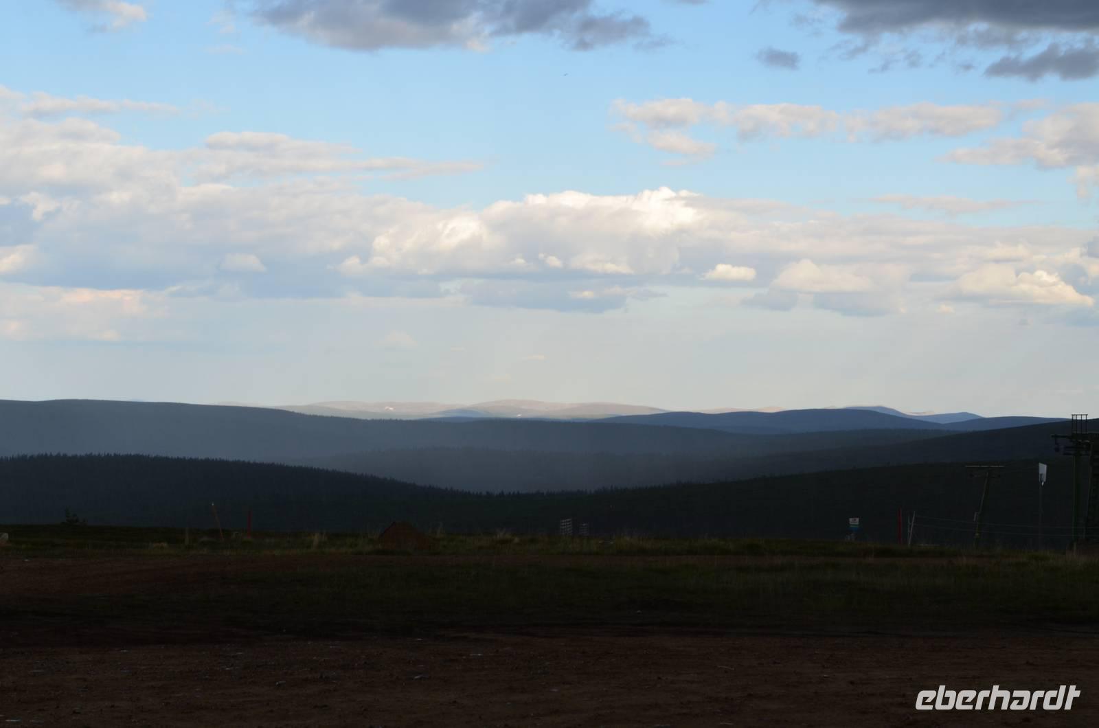 Als wir am Abend das Lappland Hotel in den Bergen von Saariselkä erreichen, geht ein Gewitterschauer auf uns nieder. Das hindert uns aber nicht daran vor dem Abendessen noch auf den nahen Aussichtsberg zu fahren.