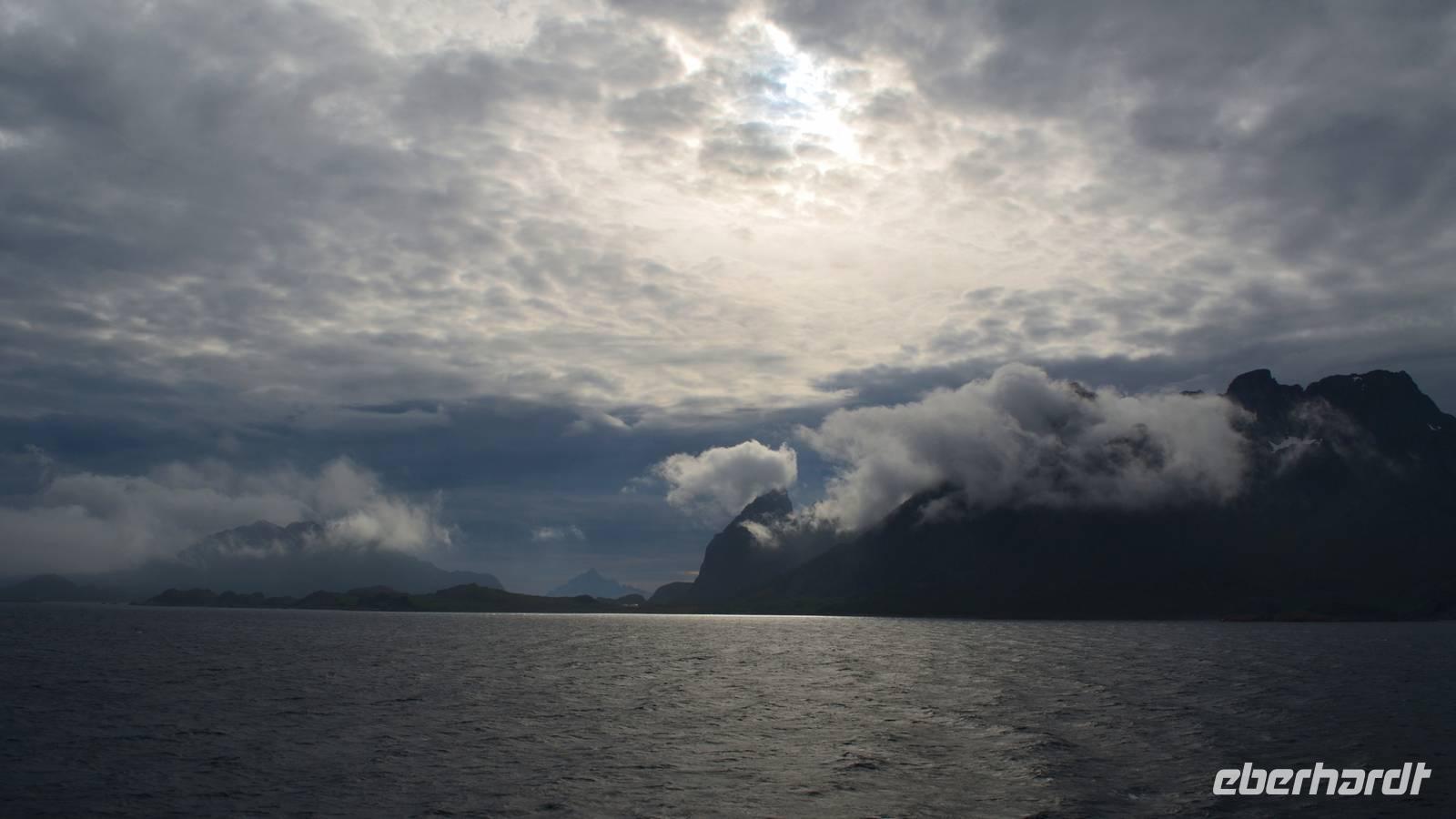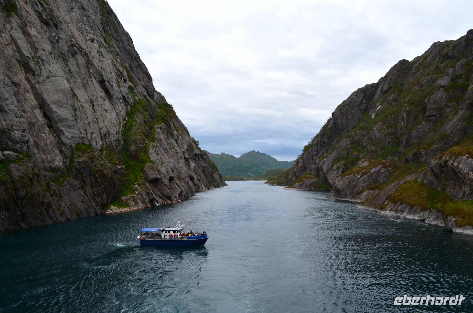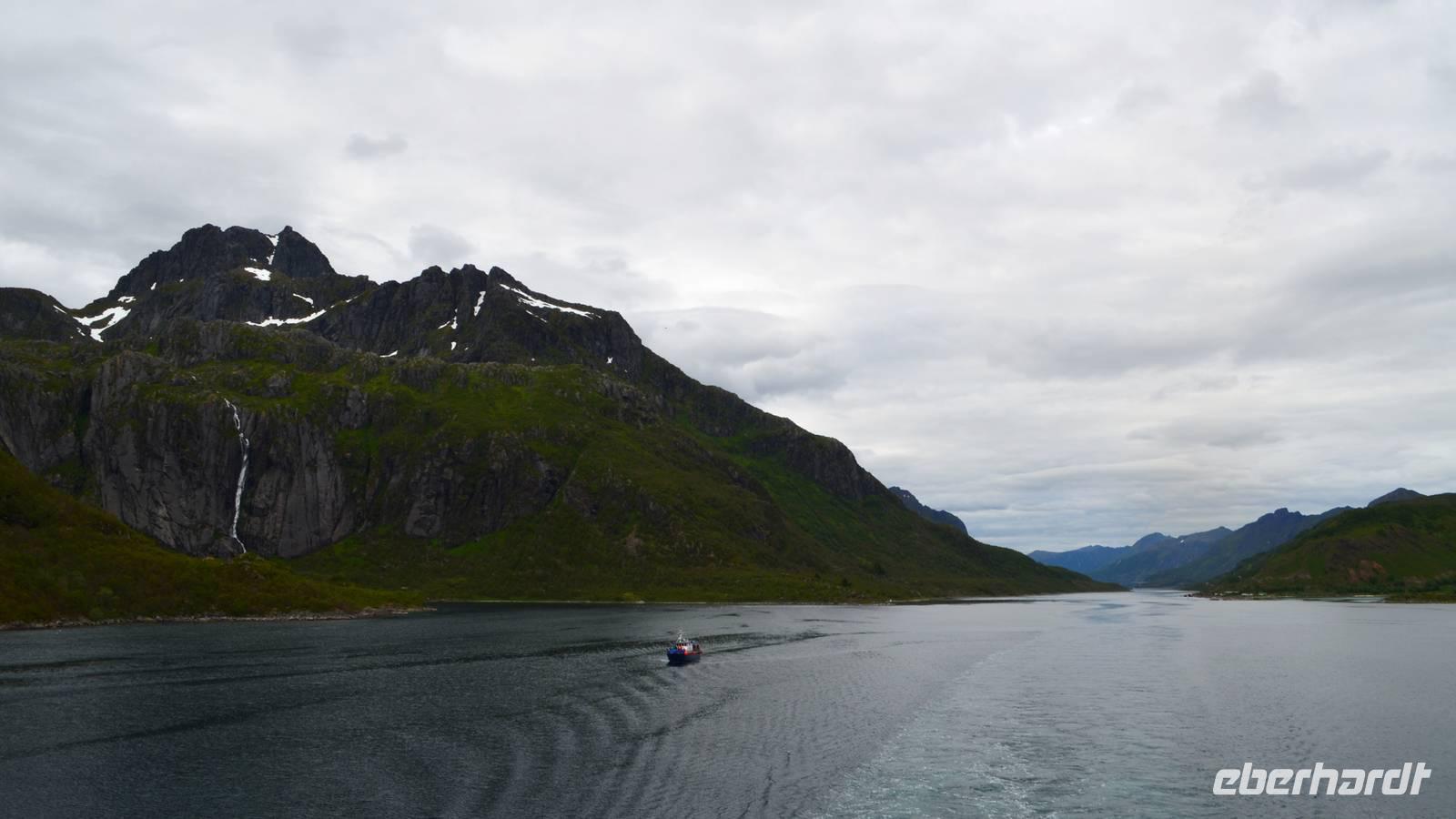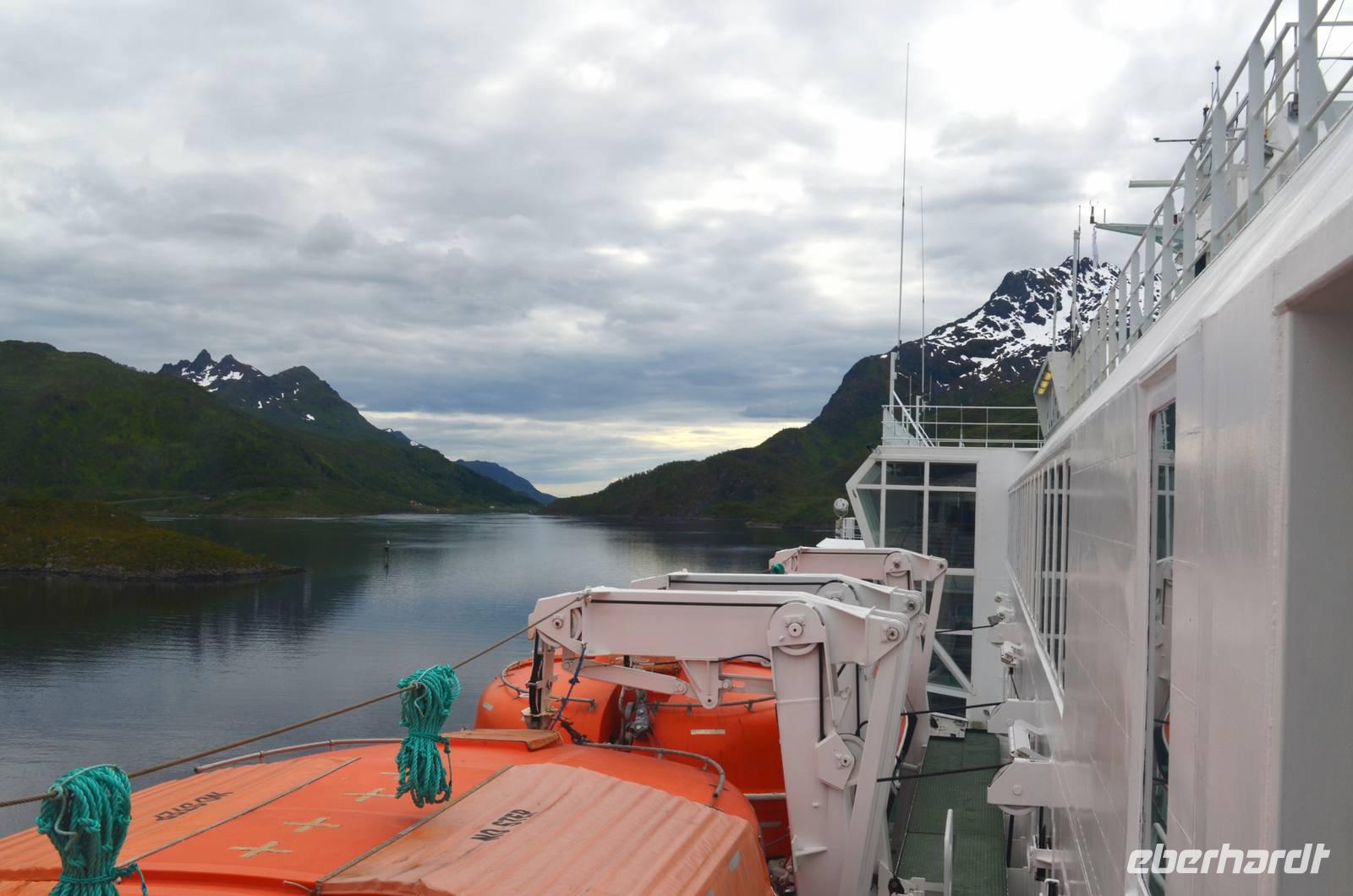 Am Morgen etwas leichter Regen - aber die Sicht auf die grandiose Bergwelt ist frei. Wir fahren am Balsfjord vorbei, weiter durch die Berge und über die Fjelle von Troms, machen Halt am schönen Blick in Gratvangen, dann gegenüber von Narvik am Ofotfjord und erreichen pünktlich die Vesteralen mit Stockmarknes. Vom Ort mit dem Hurtigrutenmuseum haben wir gute Sicht auf die Gipfelwelt der Vesteralen und der Lofoten. Unser Hurtigrutenschiff ist eines der modernen Flotte, die M/S „Polarlys" und sie hat schon im Hafen festgemacht. Somit steht der nächste Höhepunkt der Reise bevor - die schöne Fahrt durch den Raftsund, hinein in den engen Trollfjord und dann weiter durch die Inselwelt der Lofoten bis Svolvær. Eine einfach unbeschreiblich schöne Fahrt.