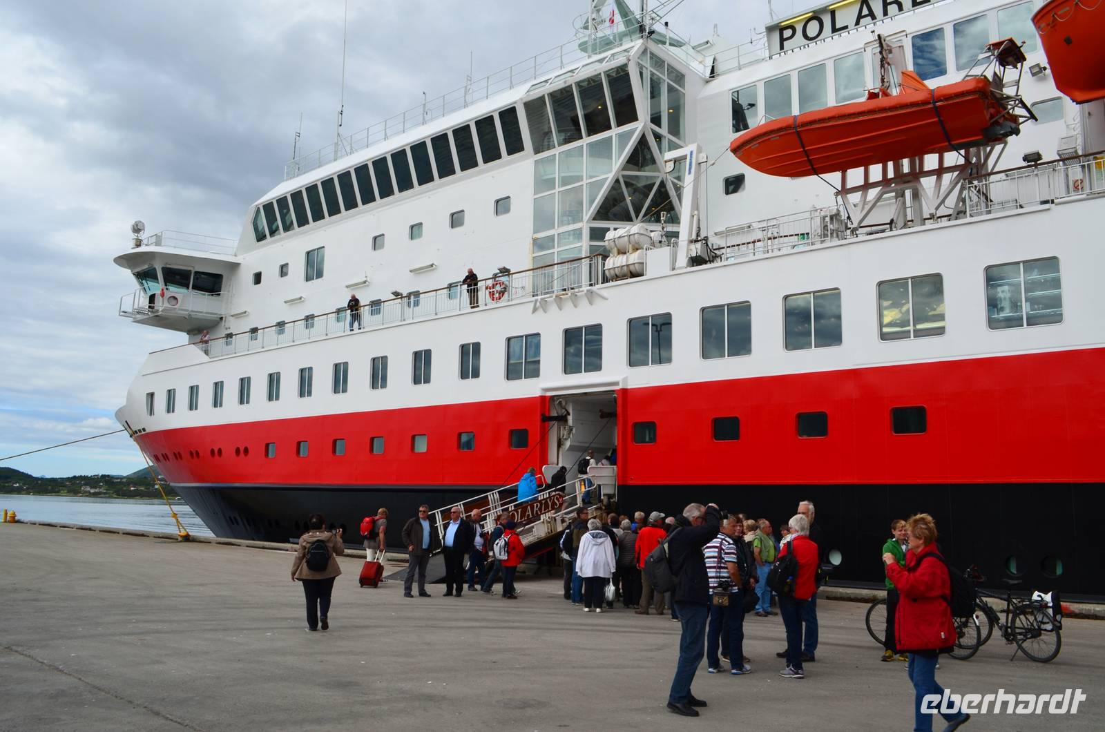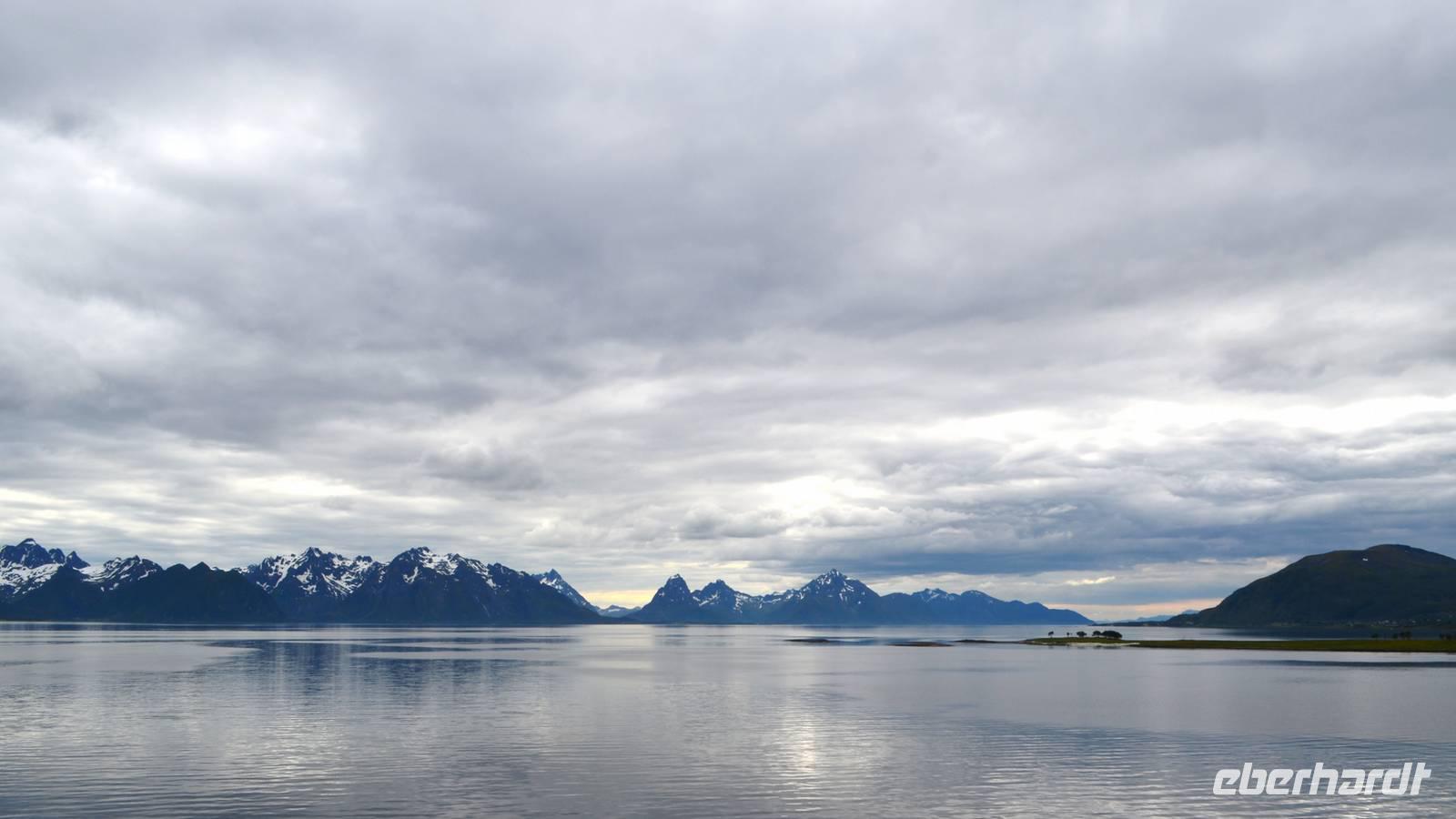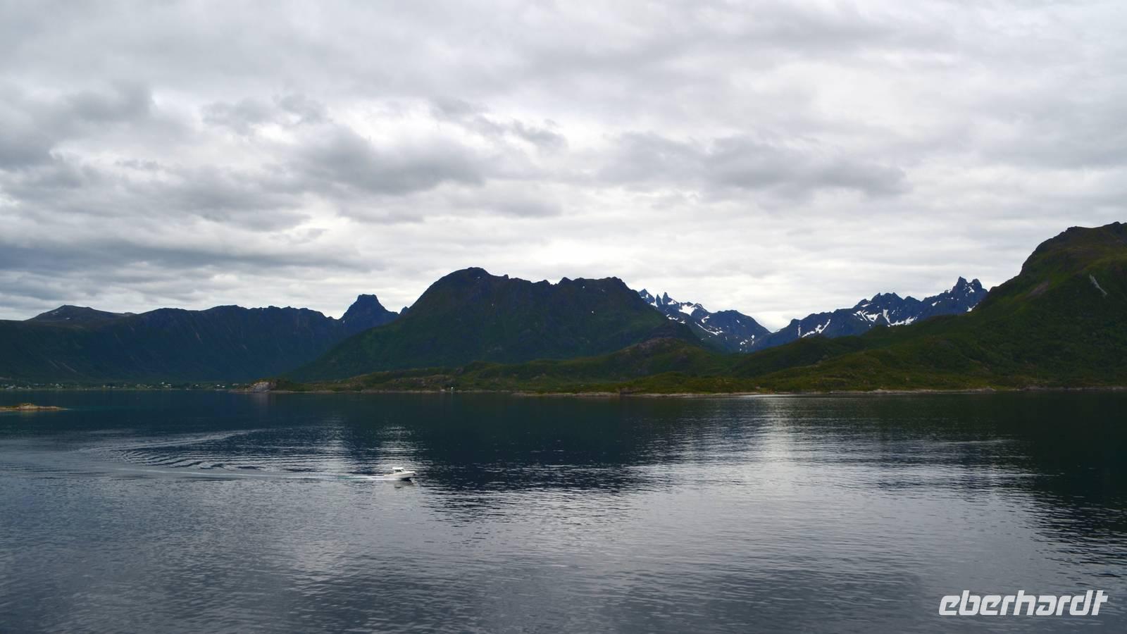 Am Morgen etwas leichter Regen - aber die Sicht auf die grandiose Bergwelt ist frei. Wir fahren am Balsfjord vorbei, weiter durch die Berge und über die Fjelle von Troms, machen Halt am schönen Blick in Gratvangen, dann gegenüber von Narvik am Ofotfjord und erreichen pünktlich die Vesteralen mit Stockmarknes. Vom Ort mit dem Hurtigrutenmuseum haben wir gute Sicht auf die Gipfelwelt der Vesteralen und der Lofoten. Unser Hurtigrutenschiff ist eines der modernen Flotte, die M/S „Polarlys" und sie hat schon im Hafen festgemacht. Somit steht der nächste Höhepunkt der Reise bevor - die schöne Fahrt durch den Raftsund, hinein in den engen Trollfjord und dann weiter durch die Inselwelt der Lofoten bis Svolvær. Eine einfach unbeschreiblich schöne Fahrt.