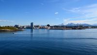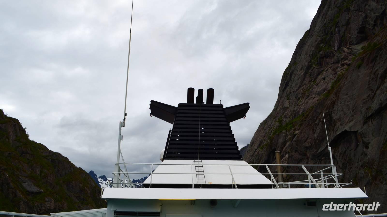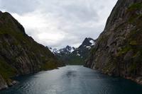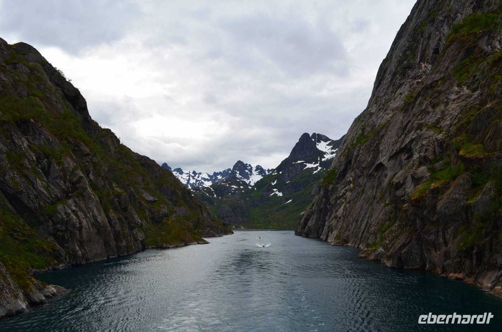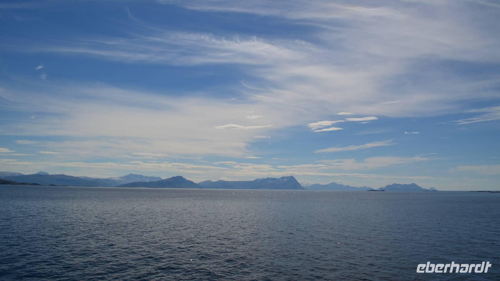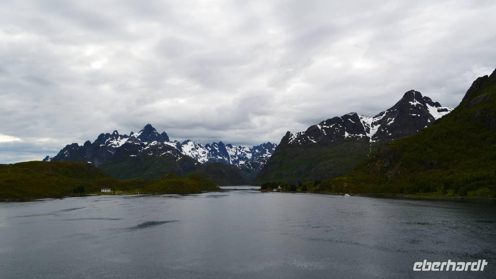 Am Morgen etwas leichter Regen - aber die Sicht auf die grandiose Bergwelt ist frei. Wir fahren am Balsfjord vorbei, weiter durch die Berge und über die Fjelle von Troms, machen Halt am schönen Blick in Gratvangen, dann gegenüber von Narvik am Ofotfjord und erreichen pünktlich die Vesteralen mit Stockmarknes. Vom Ort mit dem Hurtigrutenmuseum haben wir gute Sicht auf die Gipfelwelt der Vesteralen und der Lofoten. Unser Hurtigrutenschiff ist eines der modernen Flotte, die M/S „Polarlys" und sie hat schon im Hafen festgemacht. Somit steht der nächste Höhepunkt der Reise bevor - die schöne Fahrt durch den Raftsund, hinein in den engen Trollfjord und dann weiter durch die Inselwelt der Lofoten bis Svolvær. Eine einfach unbeschreiblich schöne Fahrt.