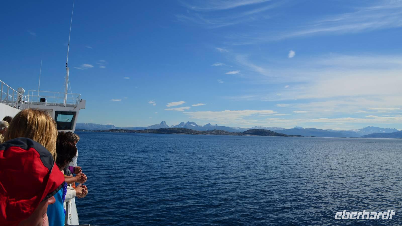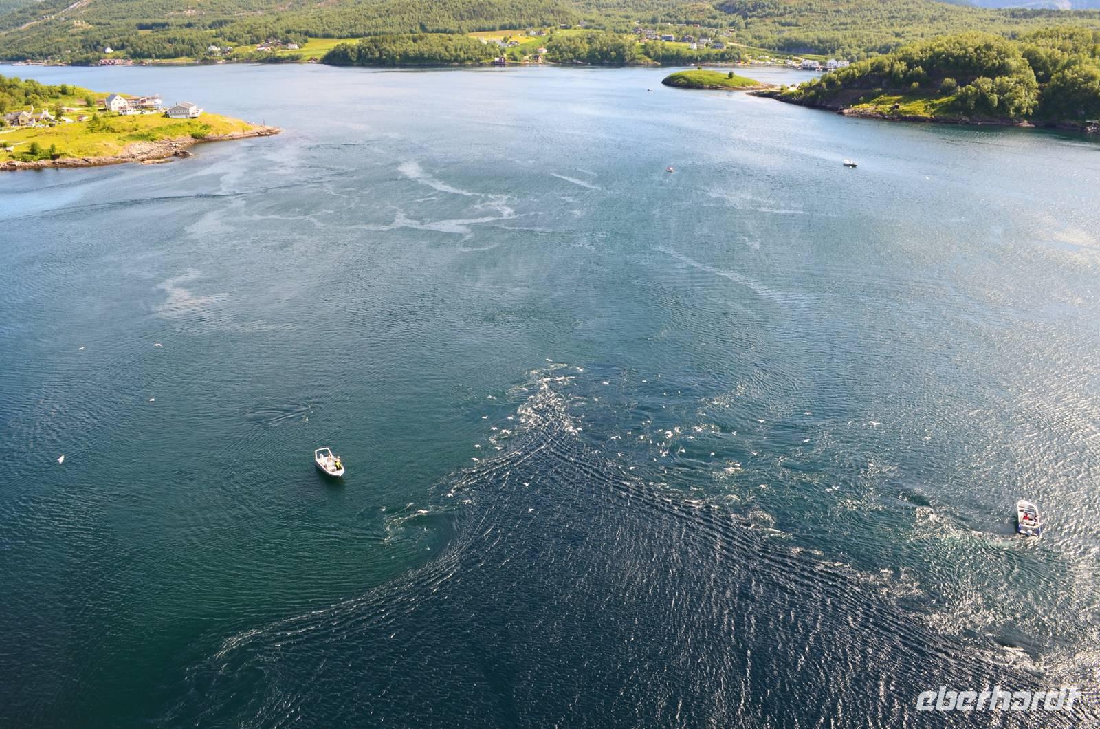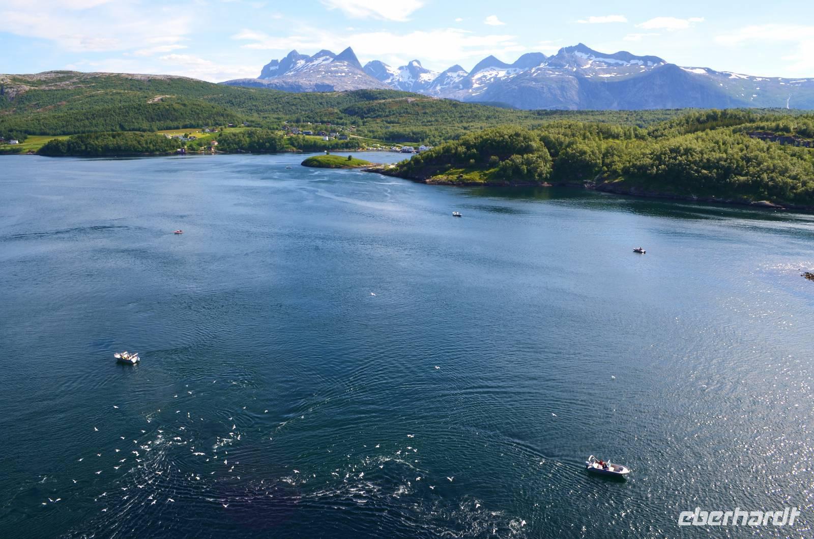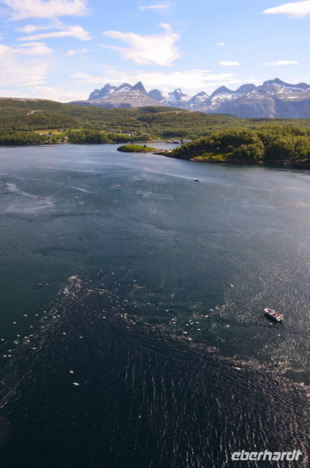 Die weitere Fahrt an den nächsten Tagen erfolgt abwechselnd mit Bus und Fähren entlang der Küste, zuerst die Überfahrt von Moskenes nach Bodø, die Fahrt mit unserem Reisebus hinüber zum Saltstraumen - dem größten Gezeitenstrom der Welt. Wir schauen in die reißende Strömung und die schäumenden Strudel, denn die Flut beginnt gerade.