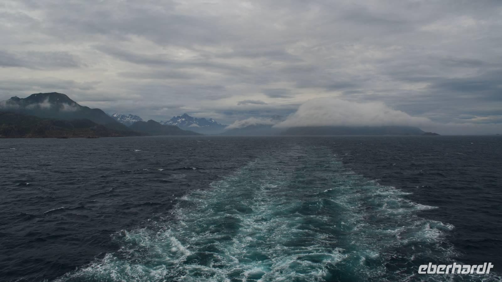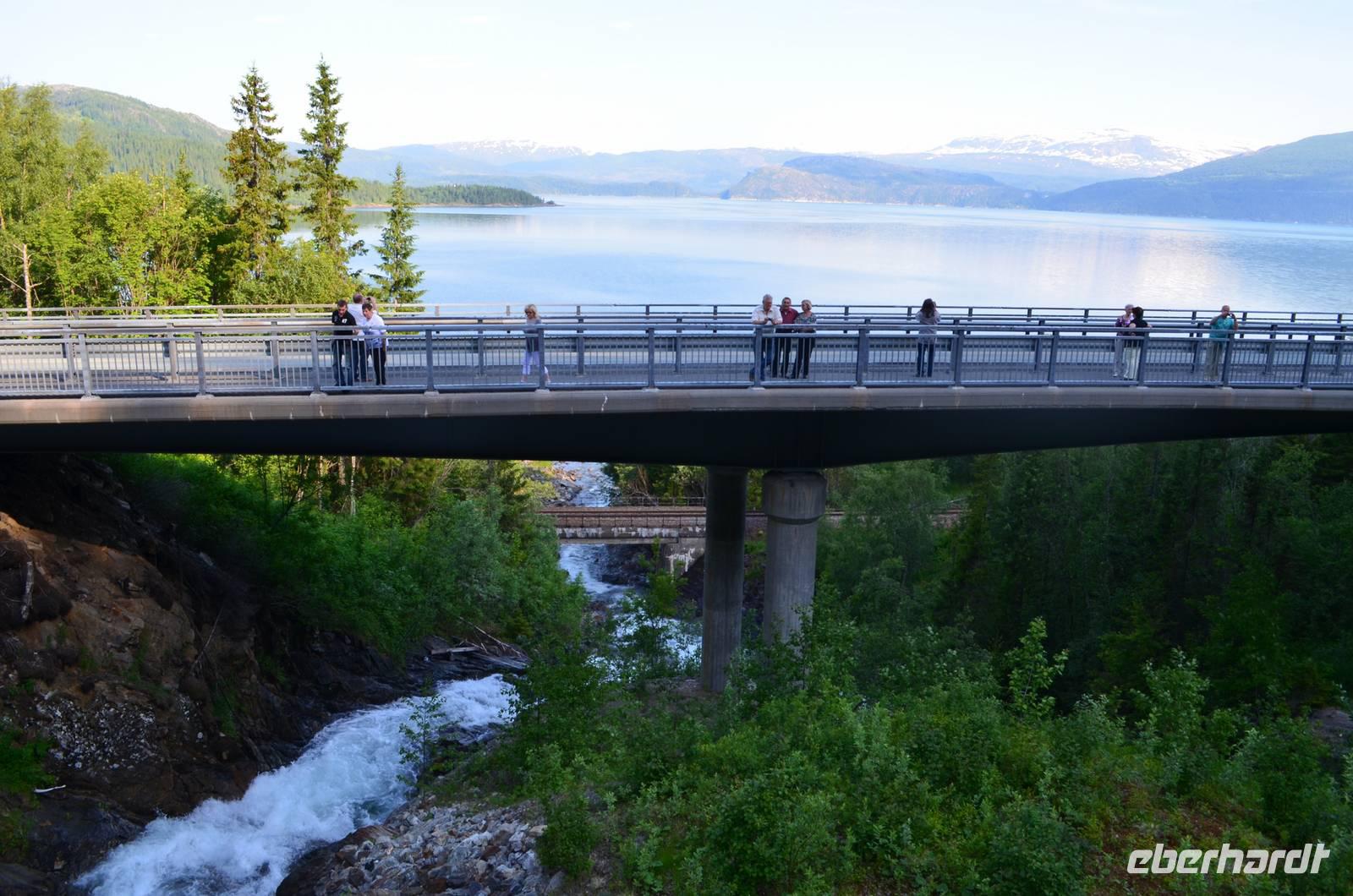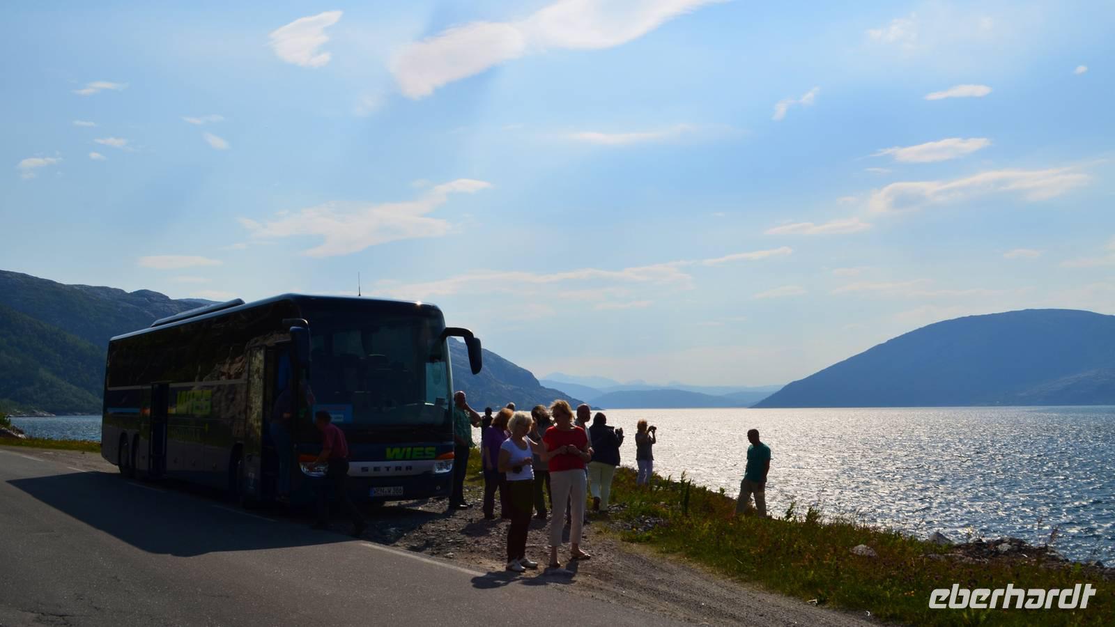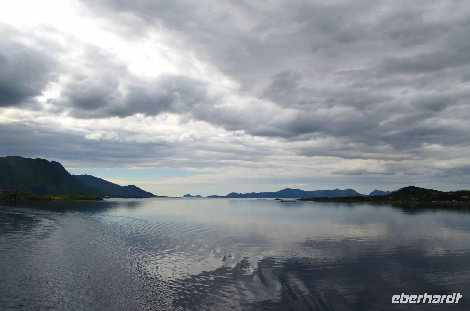Die weitere Fahrt an den nächsten Tagen erfolgt abwechselnd mit Bus und Fähren entlang der Küste, zuerst die Überfahrt von Moskenes nach Bodø, die Fahrt mit unserem Reisebus hinüber zum Saltstraumen - dem größten Gezeitenstrom der Welt. Wir schauen in die reißende Strömung und die schäumenden Strudel, denn die Flut beginnt gerade.