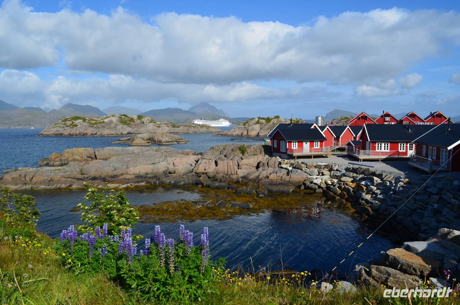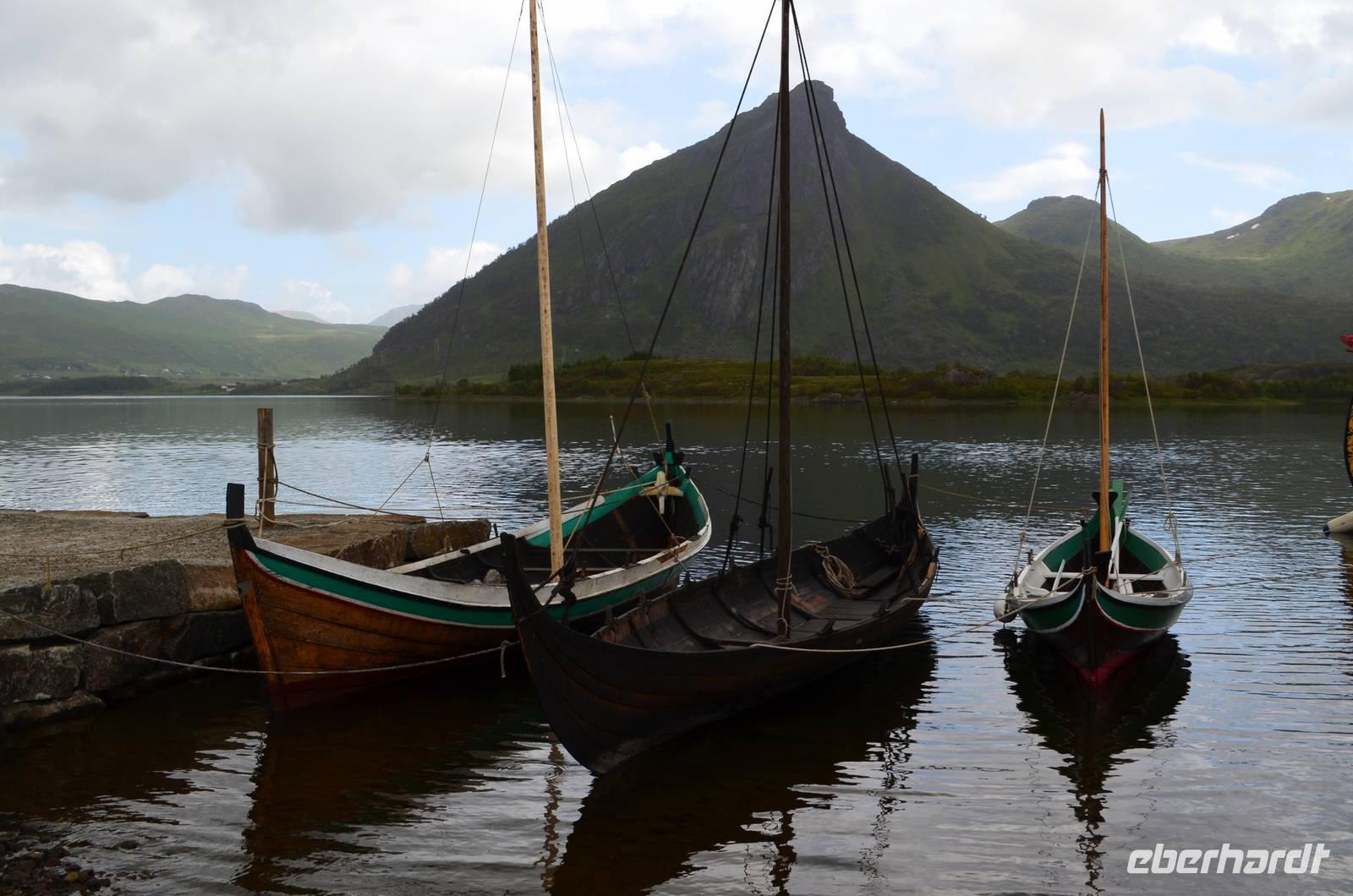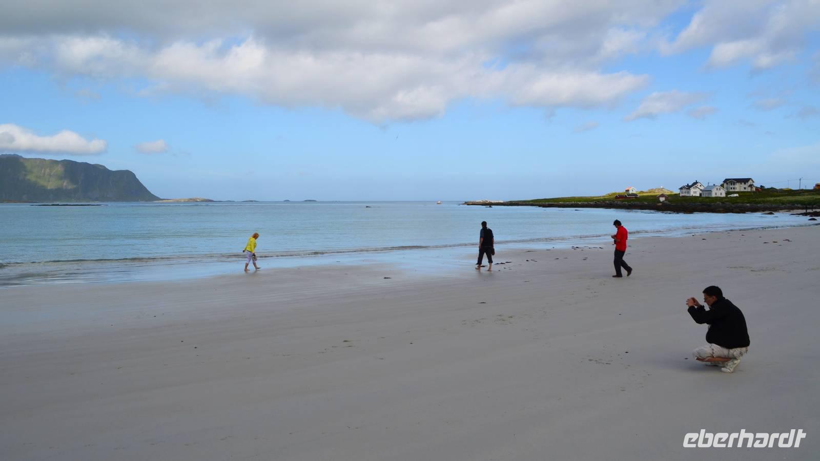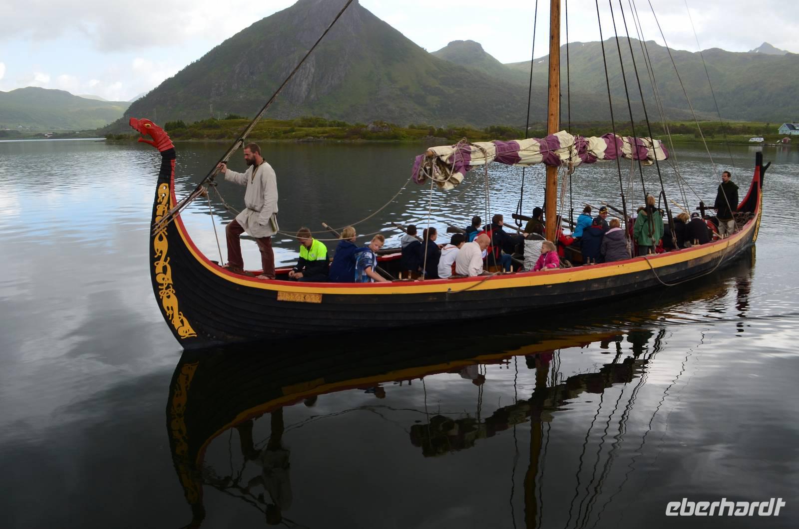 Den neuen Sonnentag lassen wir ruhig beginnen. Genießen ein schönes Frühstück und dann treffen wir uns zur Lofotenrundfahrt. Ein Kreuzfahrtschiff im Fjord ist das Fotomotiv an diesem Morgen. Wir fahren Richtung Flakstad, zur Kirche und dann weiter an den Traumstrand von Ramberg. Von hier geht es anschließend zum Wikingermuseum in Borg. Letzteres ist ein „Museum zum Anfassen". Hier essen wir nach unserer Führung mit Manfred eine leckere Wikingersuppe, die mit dem als eberhardt-WOW gereichten Met nochmal so gut mundet.