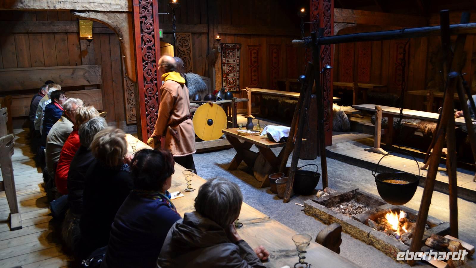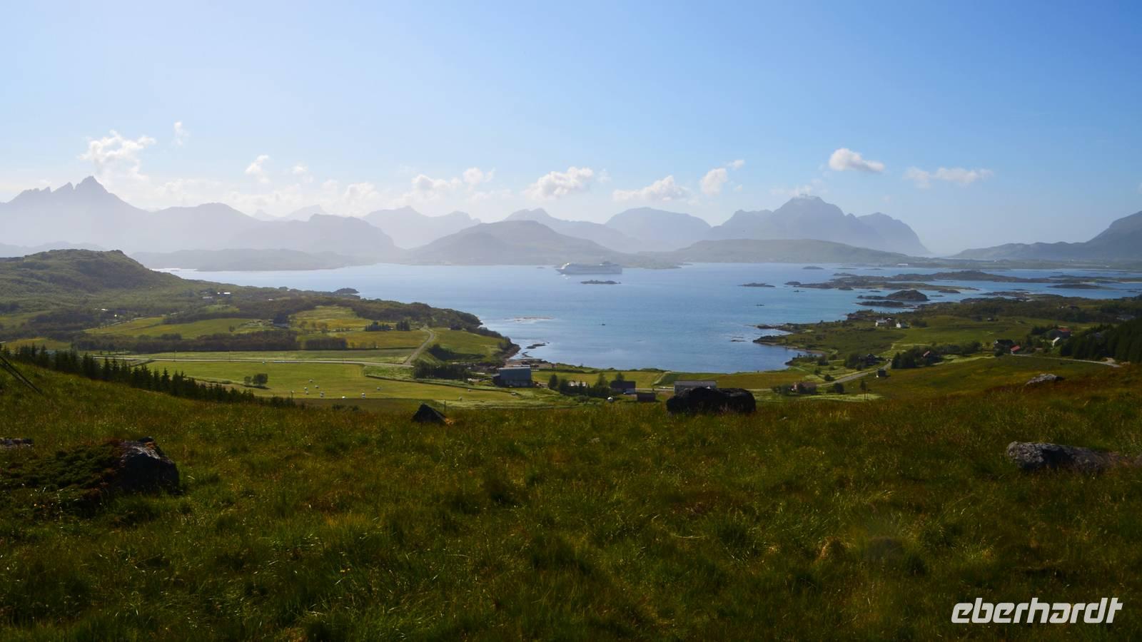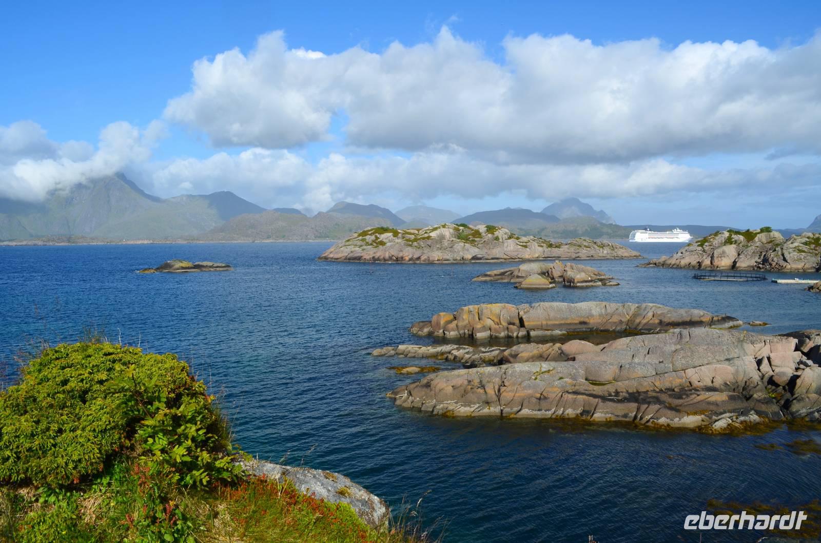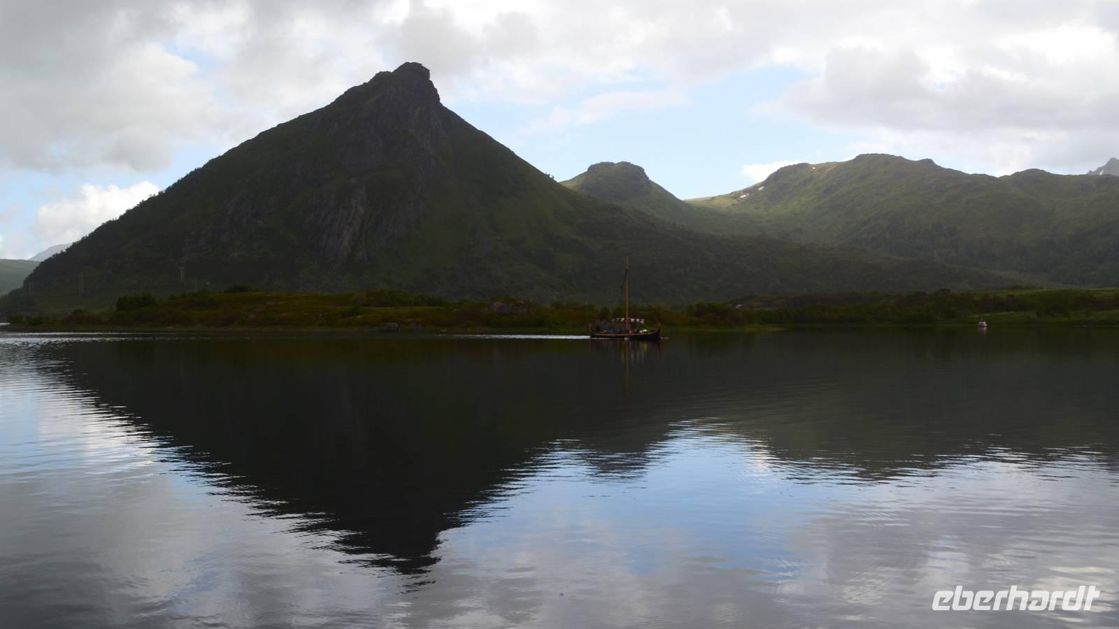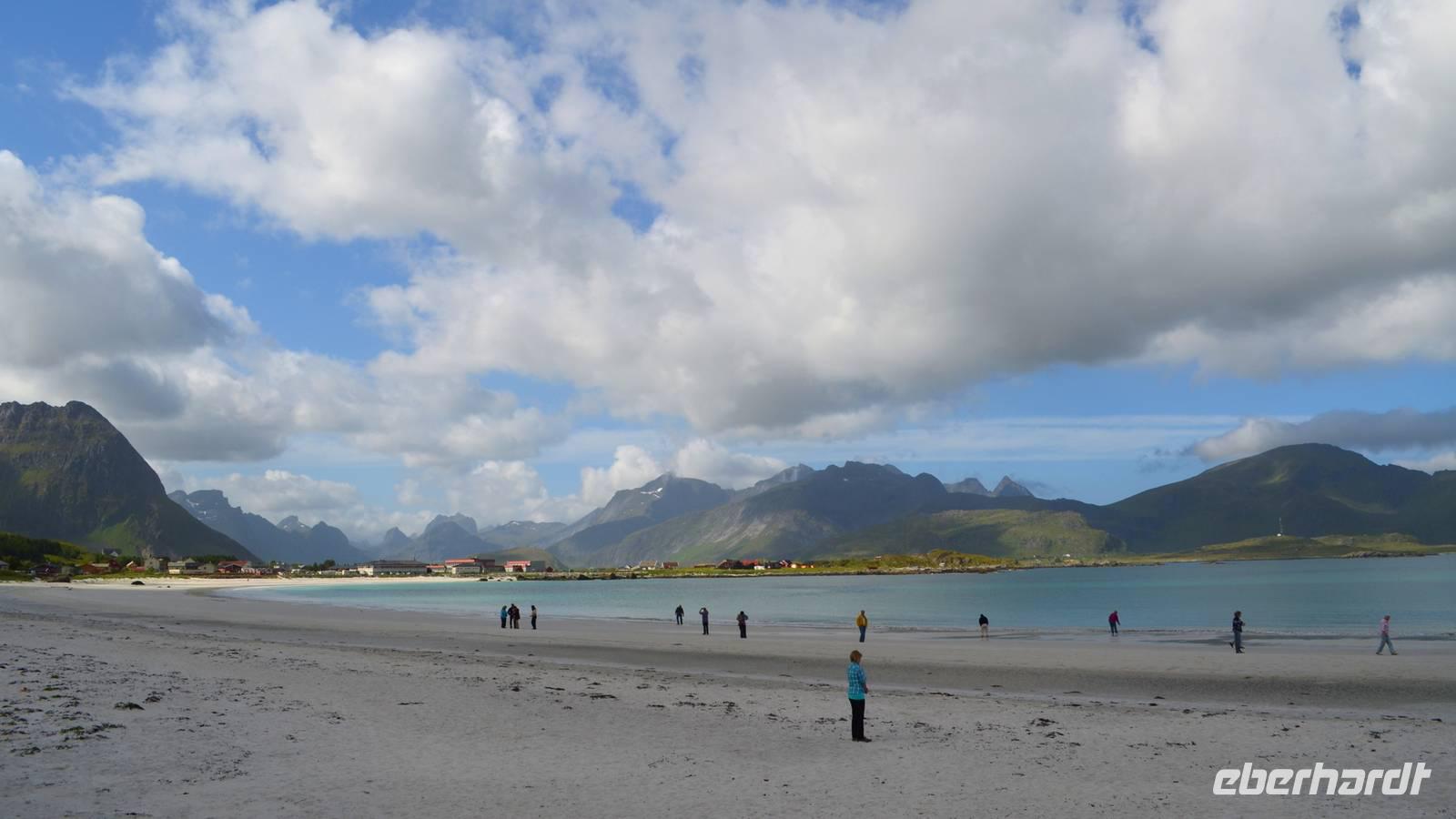 Den neuen Sonnentag lassen wir ruhig beginnen. Genießen ein schönes Frühstück und dann treffen wir uns zur Lofotenrundfahrt. Ein Kreuzfahrtschiff im Fjord ist das Fotomotiv an diesem Morgen. Wir fahren Richtung Flakstad, zur Kirche und dann weiter an den Traumstrand von Ramberg. Von hier geht es anschließend zum Wikingermuseum in Borg. Letzteres ist ein „Museum zum Anfassen". Hier essen wir nach unserer Führung mit Manfred eine leckere Wikingersuppe, die mit dem als eberhardt-WOW gereichten Met nochmal so gut mundet.