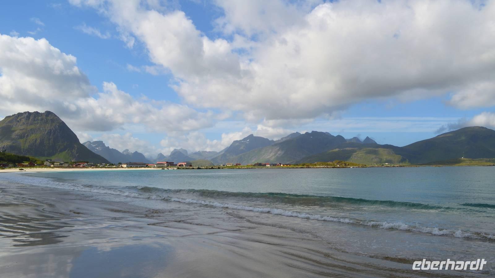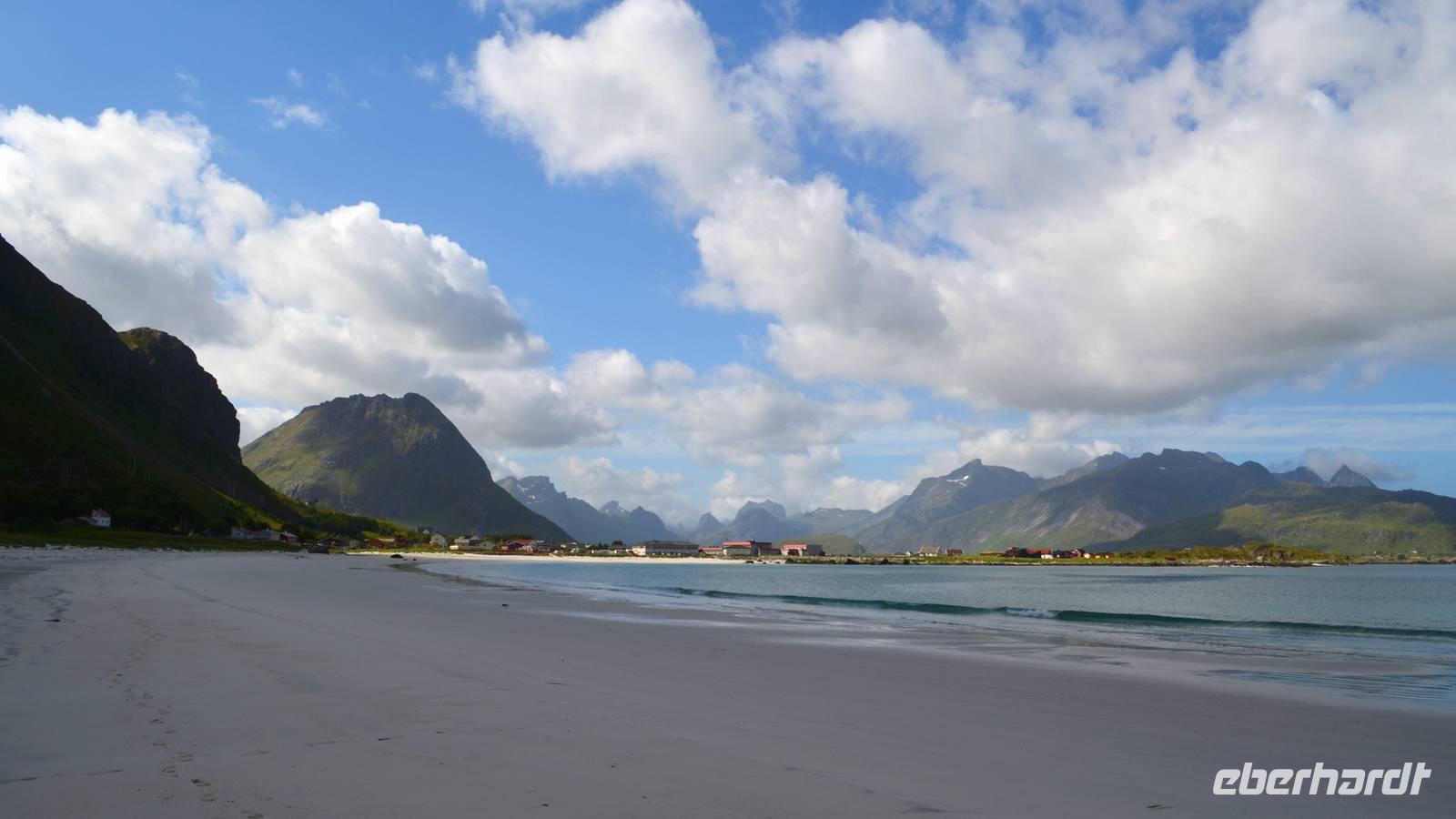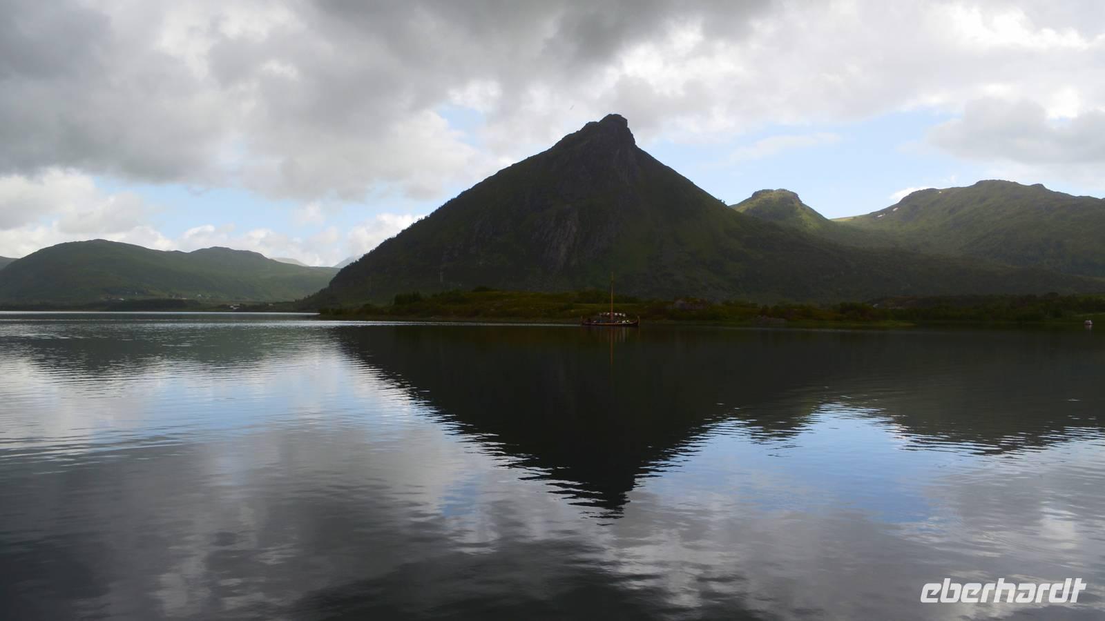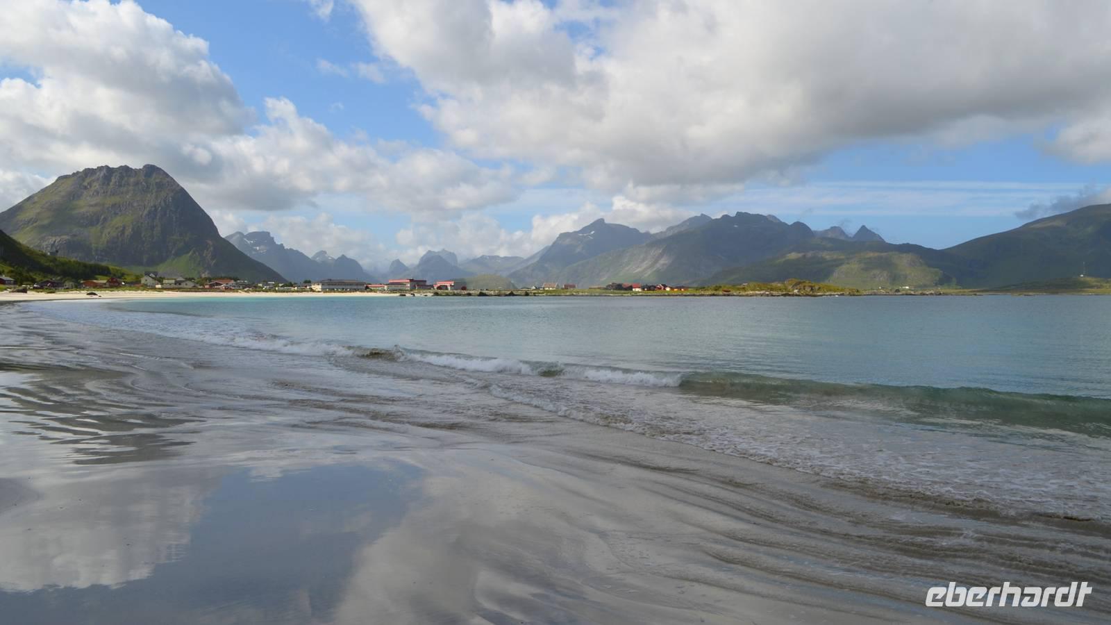 Den neuen Sonnentag lassen wir ruhig beginnen. Genießen ein schönes Frühstück und dann treffen wir uns zur Lofotenrundfahrt. Ein Kreuzfahrtschiff im Fjord ist das Fotomotiv an diesem Morgen. Wir fahren Richtung Flakstad, zur Kirche und dann weiter an den Traumstrand von Ramberg. Von hier geht es anschließend zum Wikingermuseum in Borg. Letzteres ist ein „Museum zum Anfassen". Hier essen wir nach unserer Führung mit Manfred eine leckere Wikingersuppe, die mit dem als eberhardt-WOW gereichten Met nochmal so gut mundet.
