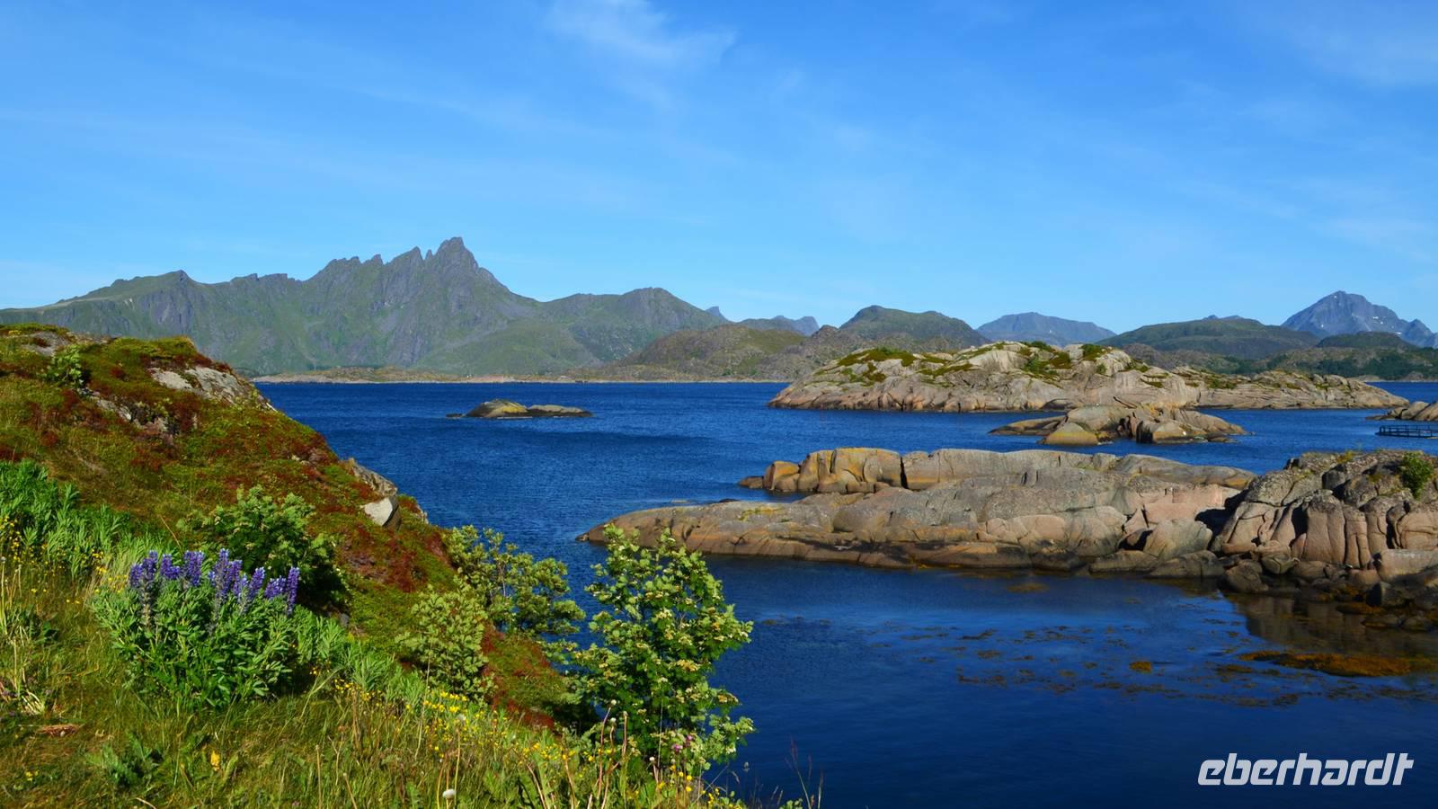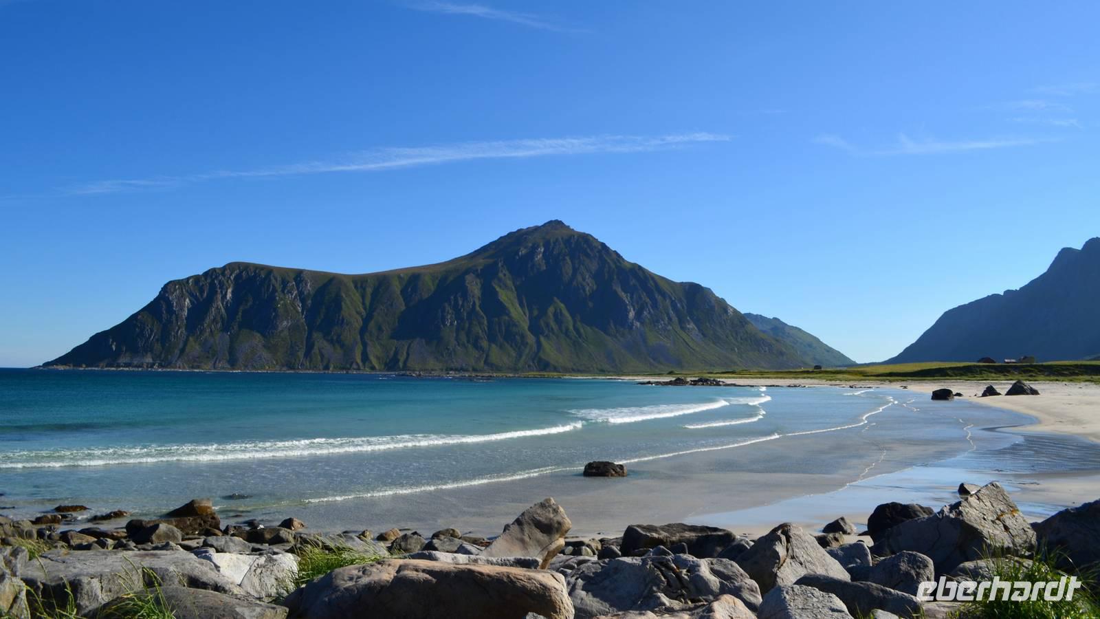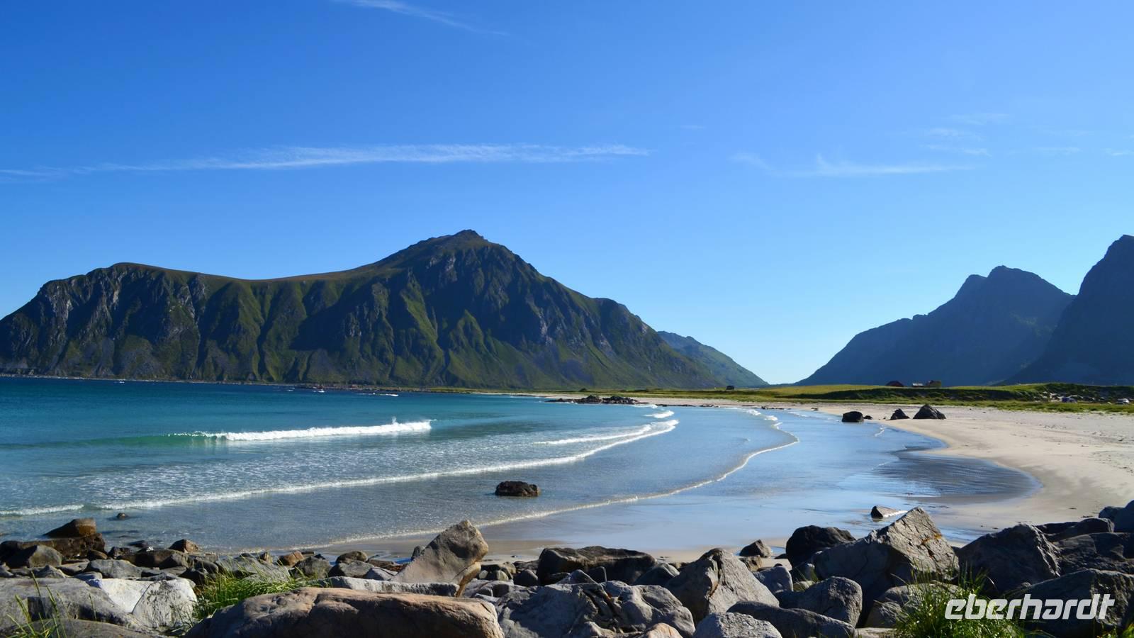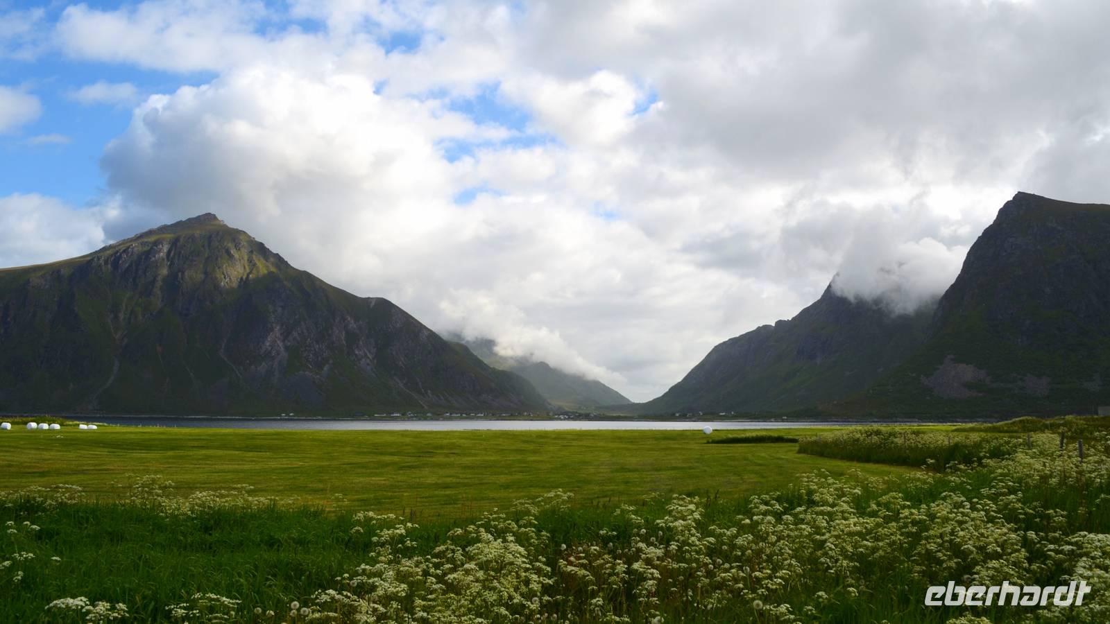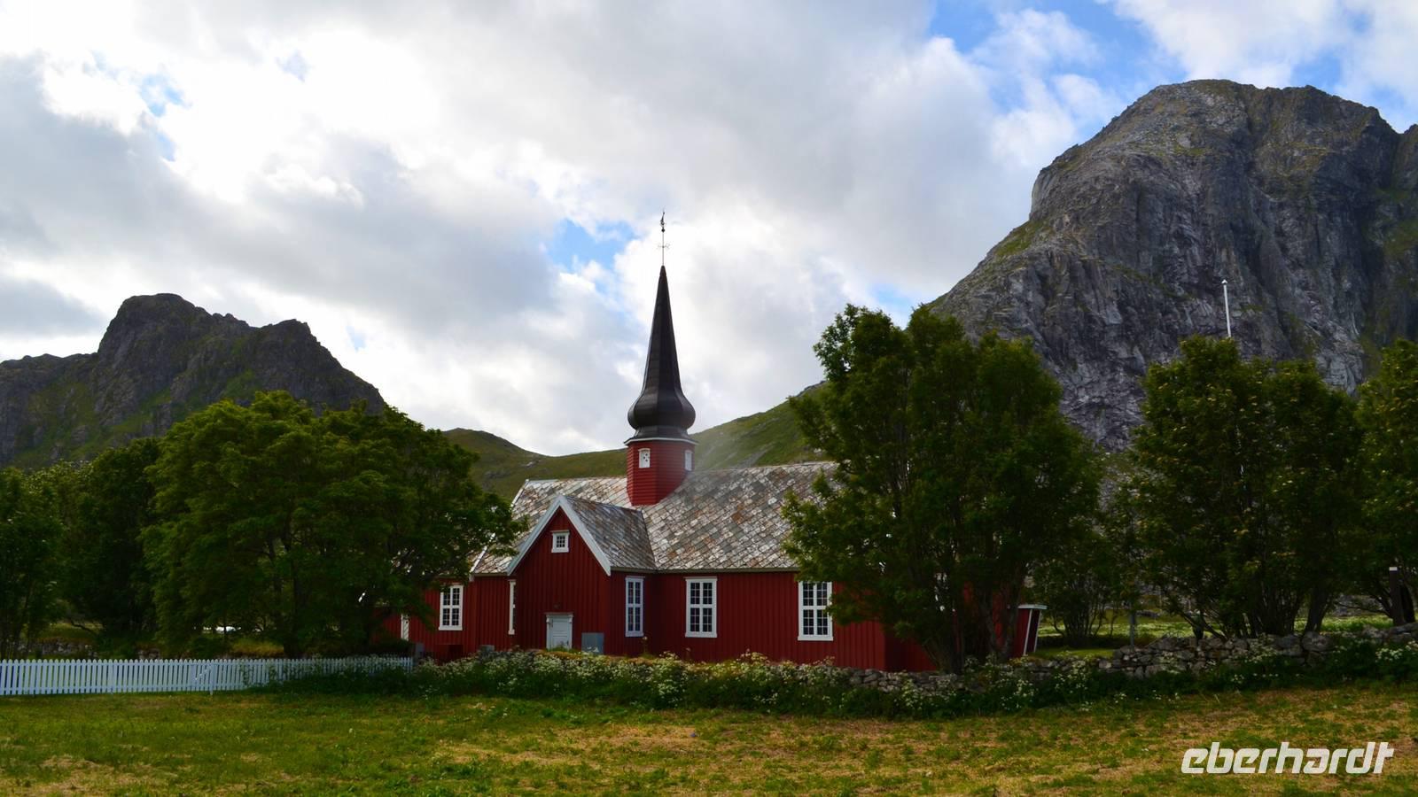 Den neuen Sonnentag lassen wir ruhig beginnen. Genießen ein schönes Frühstück und dann treffen wir uns zur Lofotenrundfahrt. Ein Kreuzfahrtschiff im Fjord ist das Fotomotiv an diesem Morgen. Wir fahren Richtung Flakstad, zur Kirche und dann weiter an den Traumstrand von Ramberg. Von hier geht es anschließend zum Wikingermuseum in Borg. Letzteres ist ein „Museum zum Anfassen". Hier essen wir nach unserer Führung mit Manfred eine leckere Wikingersuppe, die mit dem als eberhardt-WOW gereichten Met nochmal so gut mundet.