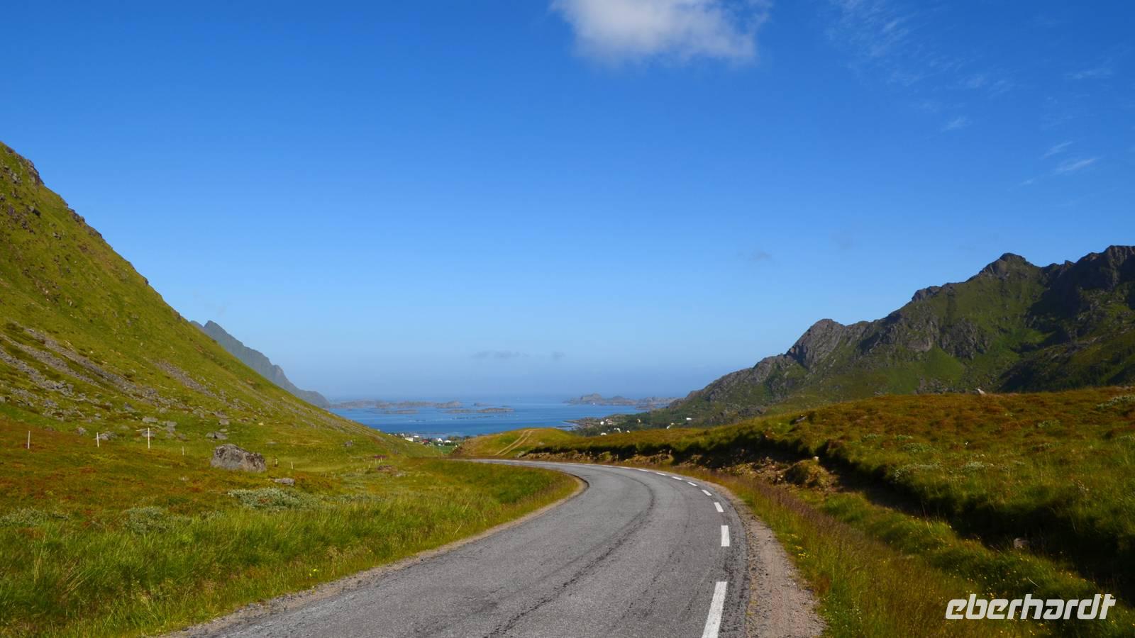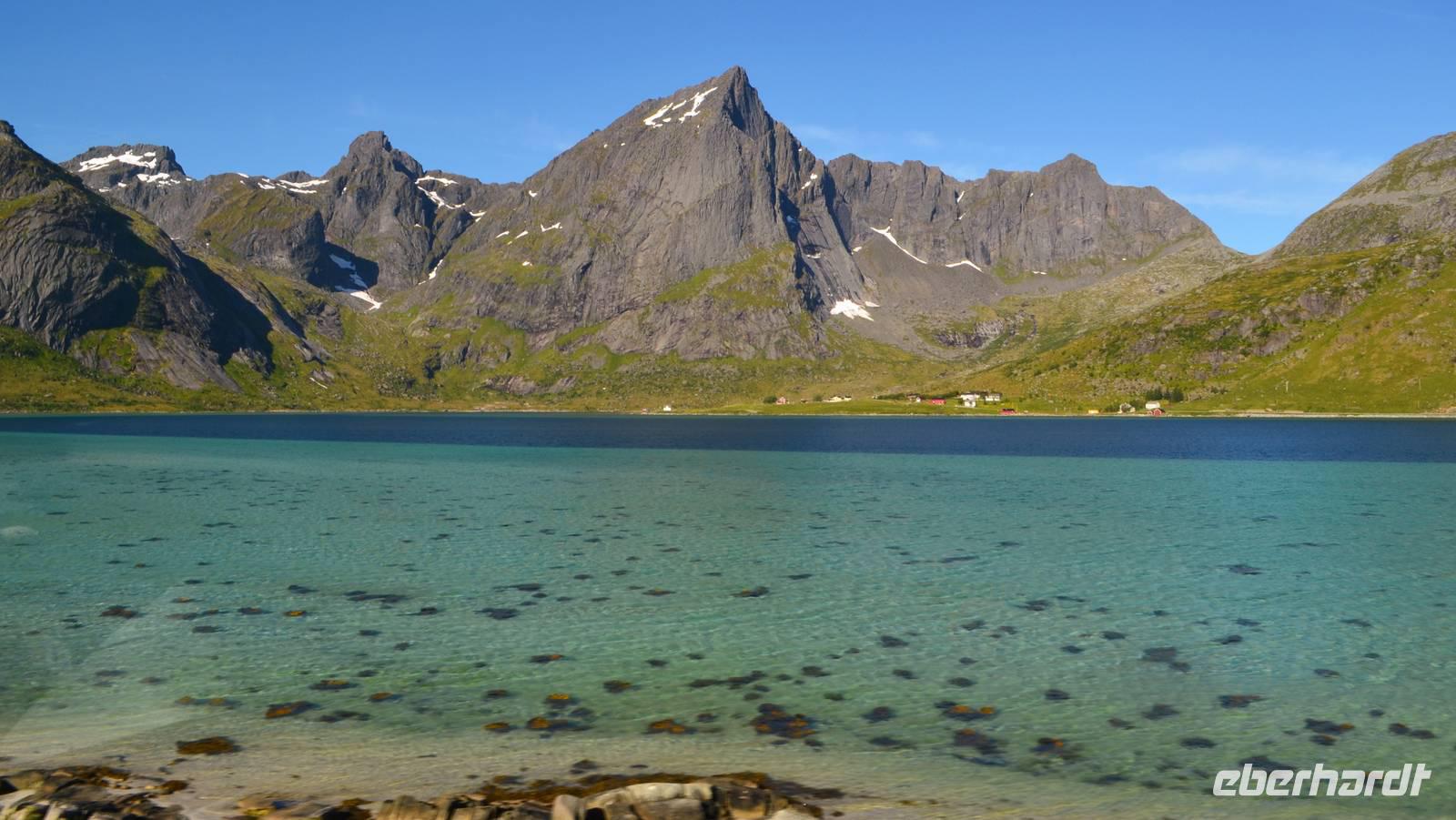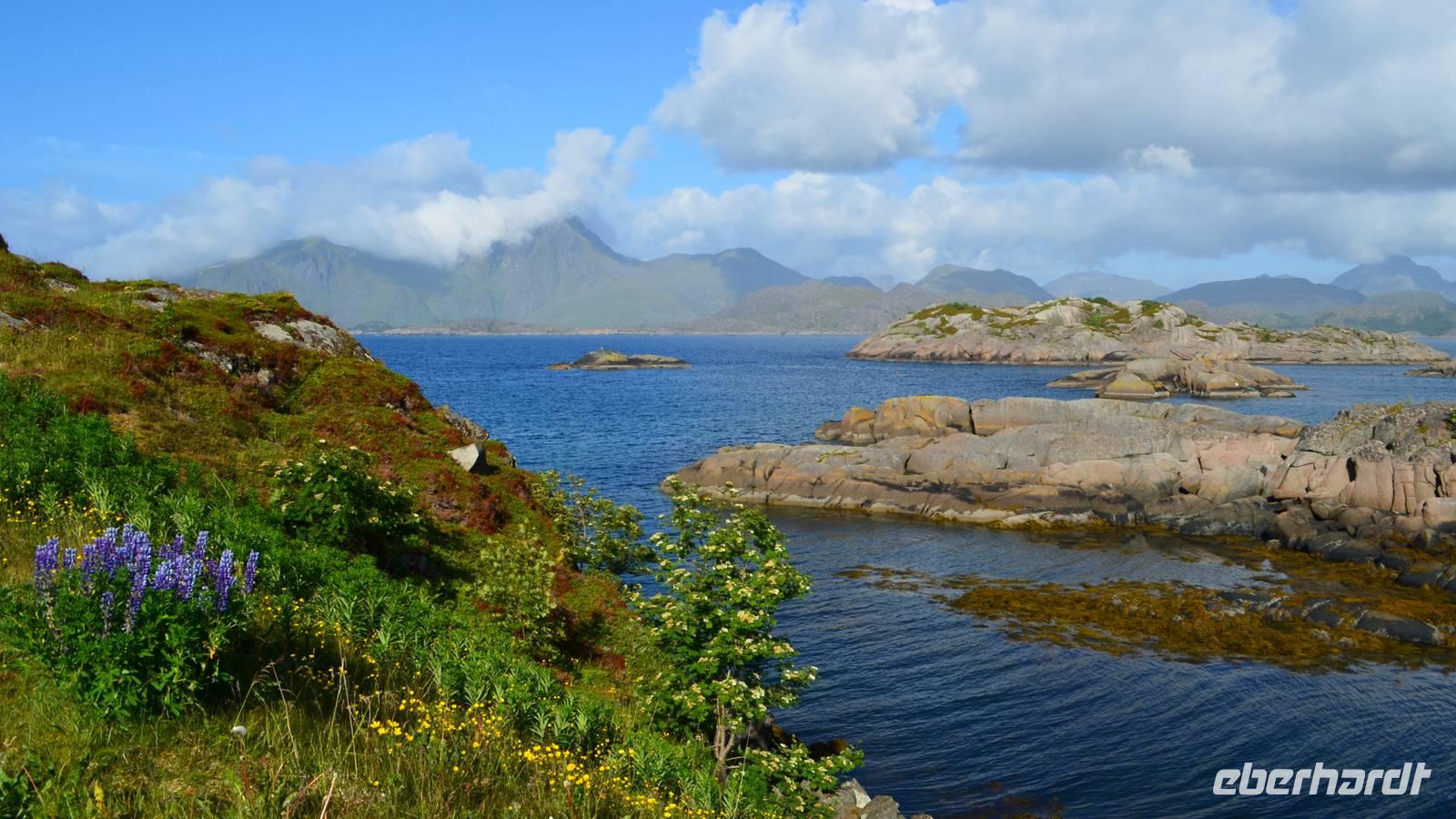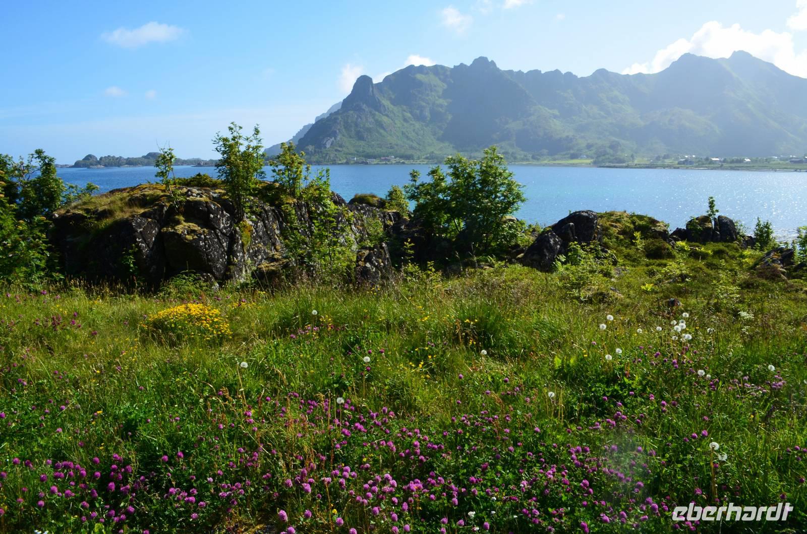 Den neuen Sonnentag lassen wir ruhig beginnen. Genießen ein schönes Frühstück und dann treffen wir uns zur Lofotenrundfahrt. Ein Kreuzfahrtschiff im Fjord ist das Fotomotiv an diesem Morgen. Wir fahren Richtung Flakstad, zur Kirche und dann weiter an den Traumstrand von Ramberg. Von hier geht es anschließend zum Wikingermuseum in Borg. Letzteres ist ein „Museum zum Anfassen". Hier essen wir nach unserer Führung mit Manfred eine leckere Wikingersuppe, die mit dem als eberhardt-WOW gereichten Met nochmal so gut mundet.