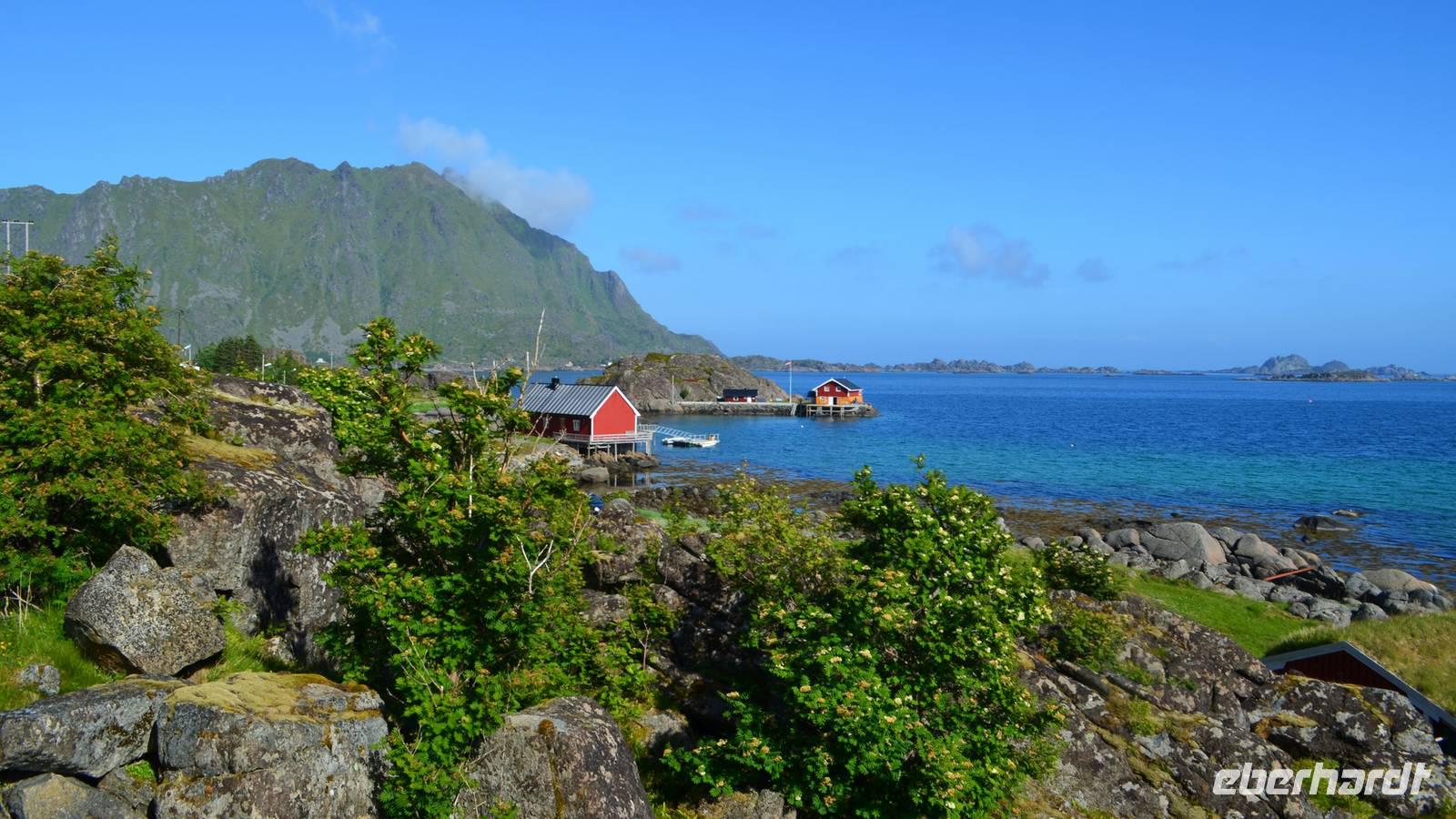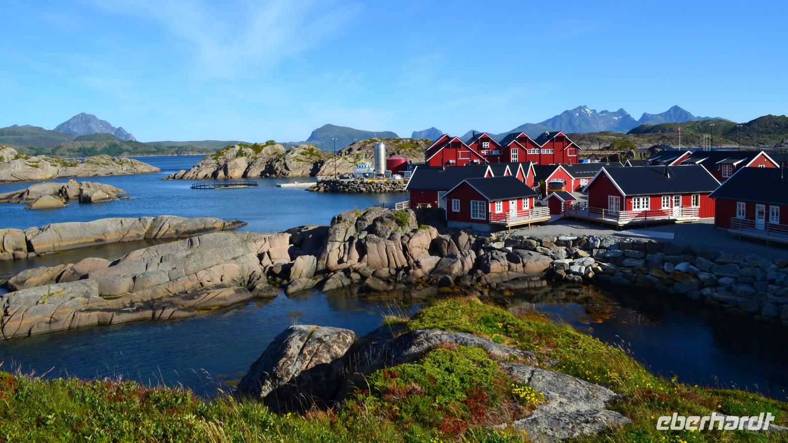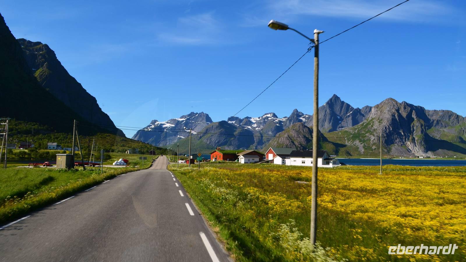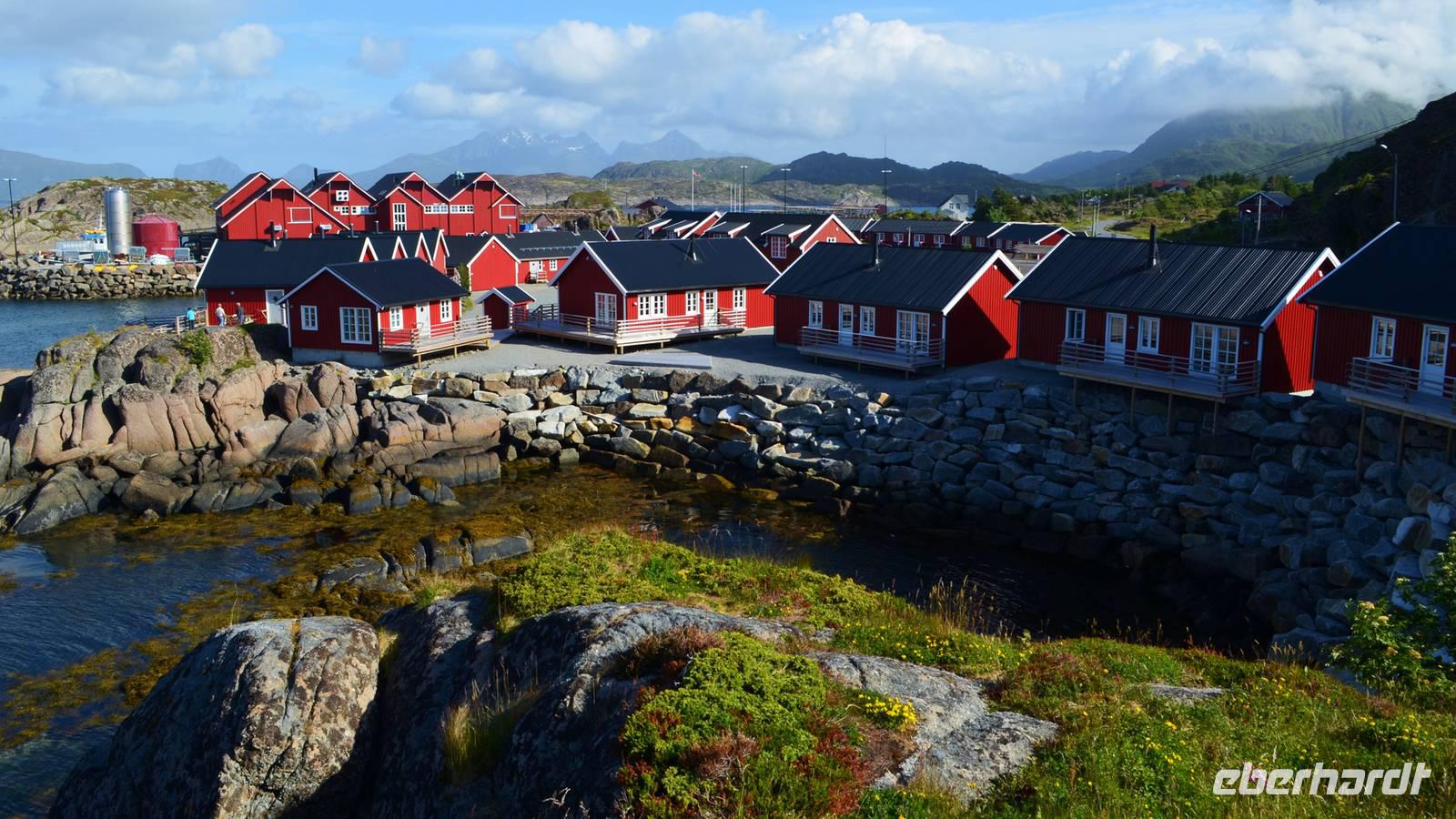 Die Lofoten sind ein weiterer, echter Höhepunkt der Reise, das zeigt sich auch als wir in Svolvaer wieder in unseren Reisebus steigen und zur Übernachtung zu den Rorbuhütten von Mortsund über die Inseln fahren. Die Häuschen mit allem Komfort und dazu die herzliche Begrüßung in Statles Robucenter. Uns fehlt es an Nichts und die Sonne taucht die Landschaft in wundervolles Licht und tolle Farben. An den Bergflanken aufziehende Wolken machen die Bilder noch reizvoller.