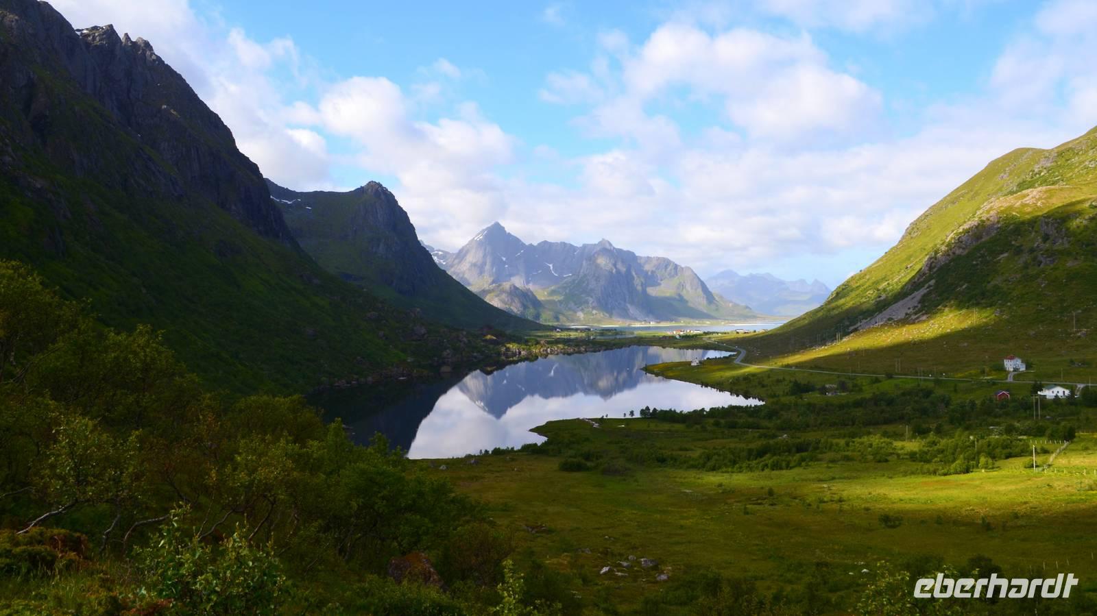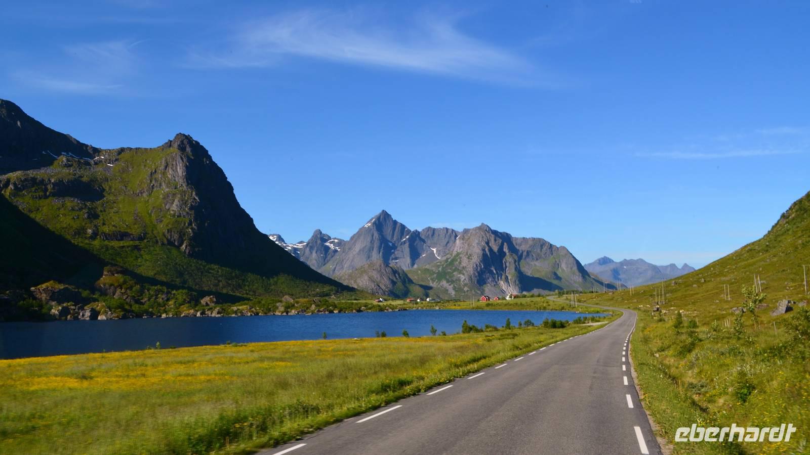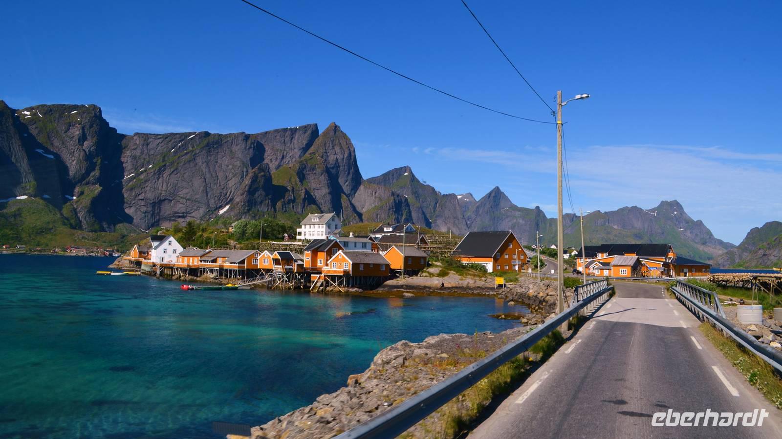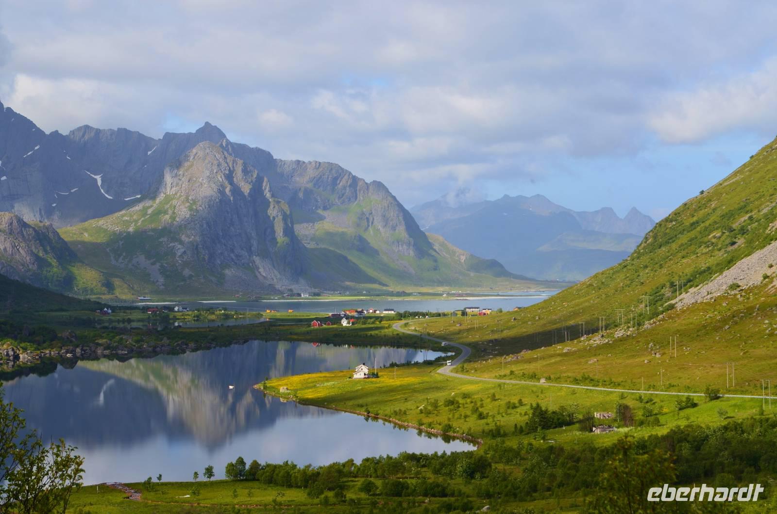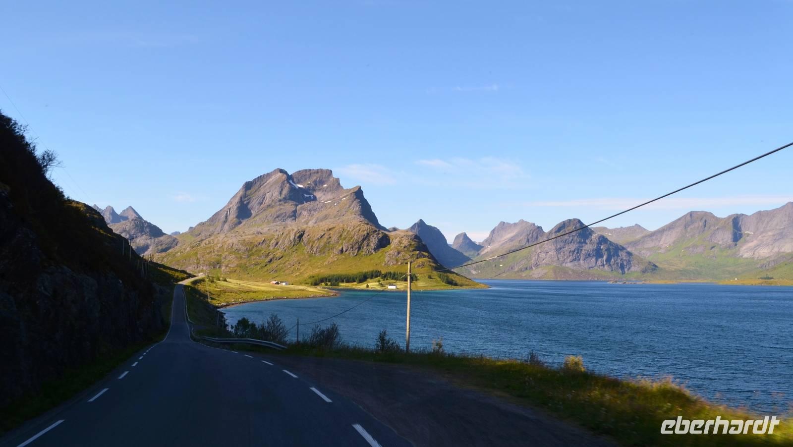 Die Lofoten sind ein weiterer, echter Höhepunkt der Reise, das zeigt sich auch als wir in Svolvaer wieder in unseren Reisebus steigen und zur Übernachtung zu den Rorbuhütten von Mortsund über die Inseln fahren. Die Häuschen mit allem Komfort und dazu die herzliche Begrüßung in Statles Robucenter. Uns fehlt es an Nichts und die Sonne taucht die Landschaft in wundervolles Licht und tolle Farben. An den Bergflanken aufziehende Wolken machen die Bilder noch reizvoller.