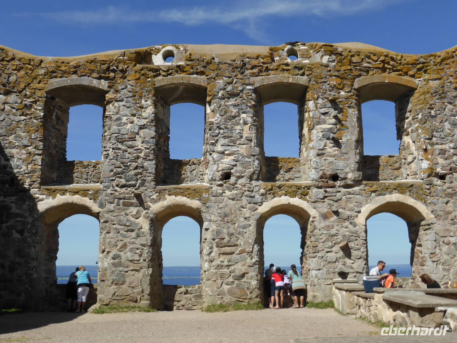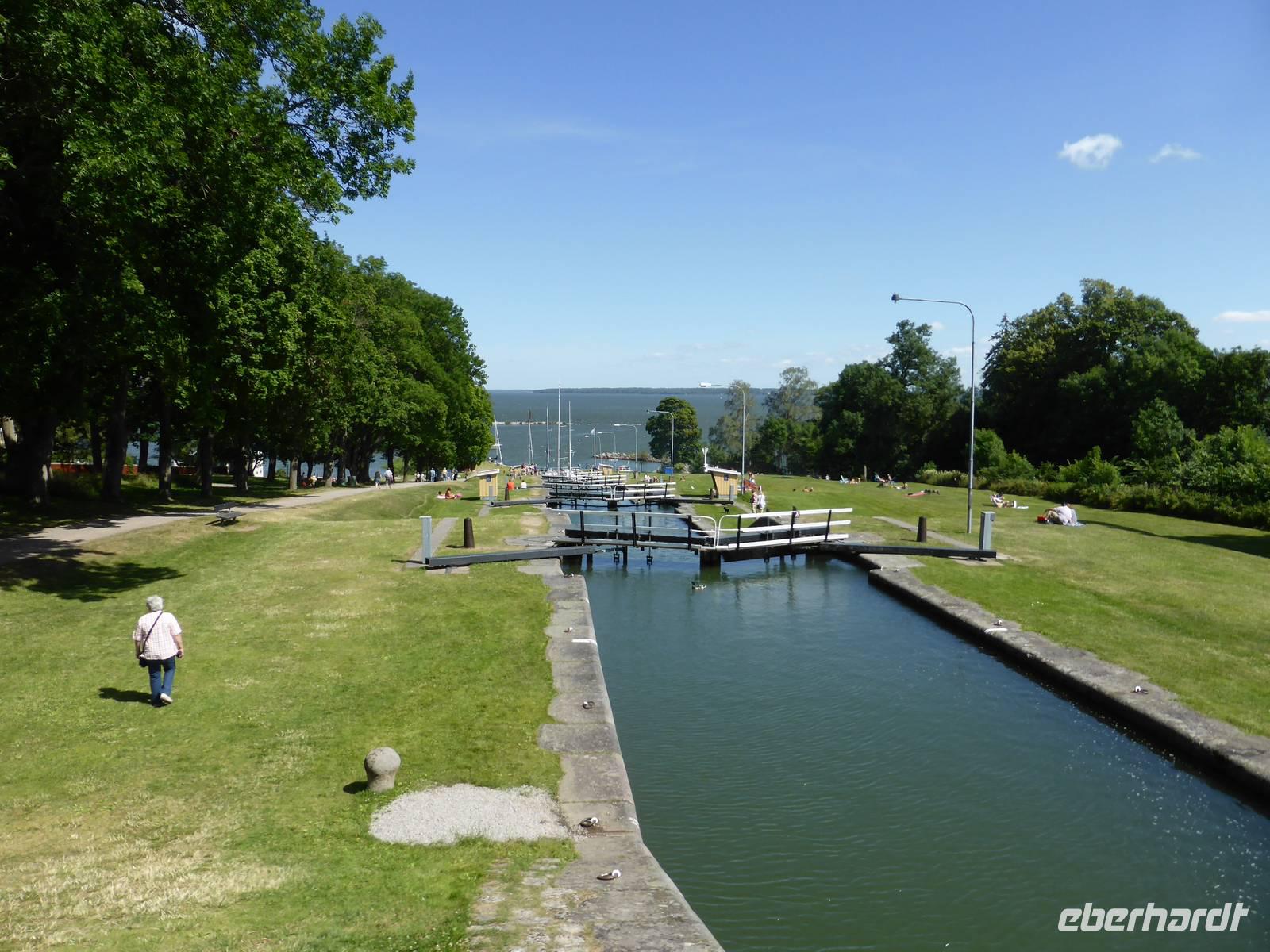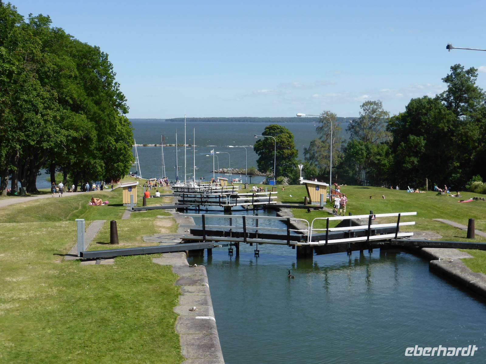 Am nächsten Morgen fuhren wir durch den Schärengürtel in den Hafen von Göteborg ein. Nach der Ankunft und dem Verlassen des Schiffes starteten wir in Richtung Boras und schwedische Seenplatte. Unseren ersten Halt legten wir am Rasthof Brahehus ein. Hier konnten wir die berühmten rot-weißen Zuckerstangen aus Gränna kaufen und hatten von der romantischen Schlossruine aus einen fantastischen Blick auf den Vätternsee. Von Gränna aus ging es nach Berg zur Schleusentreppe des Göta-Kanals. Hier sahen wir, wie die Schiffe in mehreren Schleusen einen Höhenunterschied von 10 - 15 Meter überwinden. Nahe dieser Schleusen befindet sich eine der schönsten ehemaligen Klosteranlagen Schwedens. Wir besichtigten die eindrucksvolle Klosterkirche in Vreta, das einzige, vollständig erhaltene Bauwerk des Klosterkomplexes. Im Außenbereich schließt sich der Klostergarten mit dem ehemaligen Kreuzgang an. Die ihn begrenzenden Gebäude sind leider nur noch als Ruinen erhalten. Anschließend fuhren wir weiter zu unserem Hotel „Skandic Talk" am Stockholmer Messegelände. Im Rica Hotel trafen wir zum Abendessen Andre, den Busfahrer unserer Rundreise. Er löste Günther ab, der uns bis Stockholm die ersten beiden Tage gefahren hatte und von dem wir uns am Abend verabschiedeten.