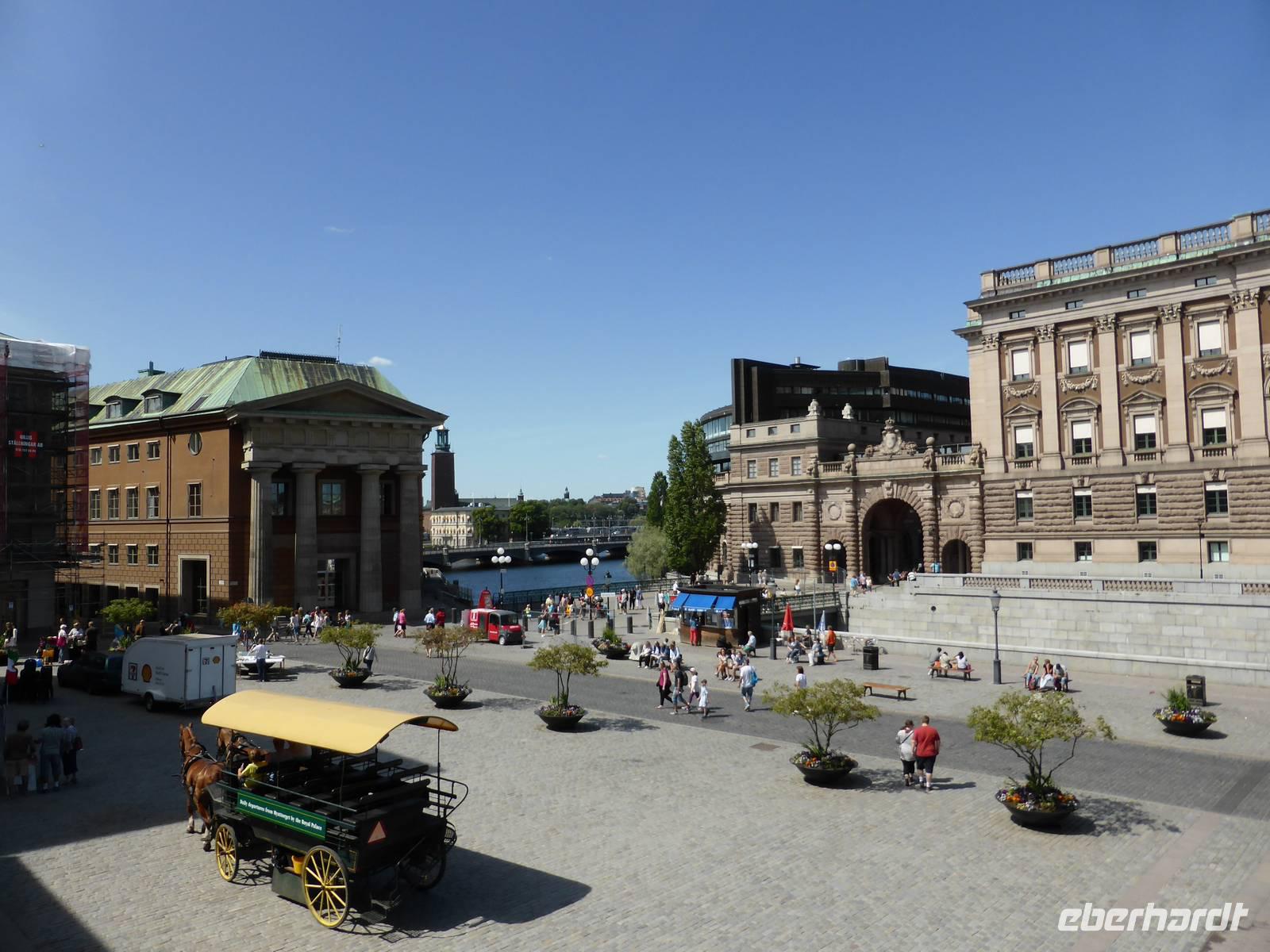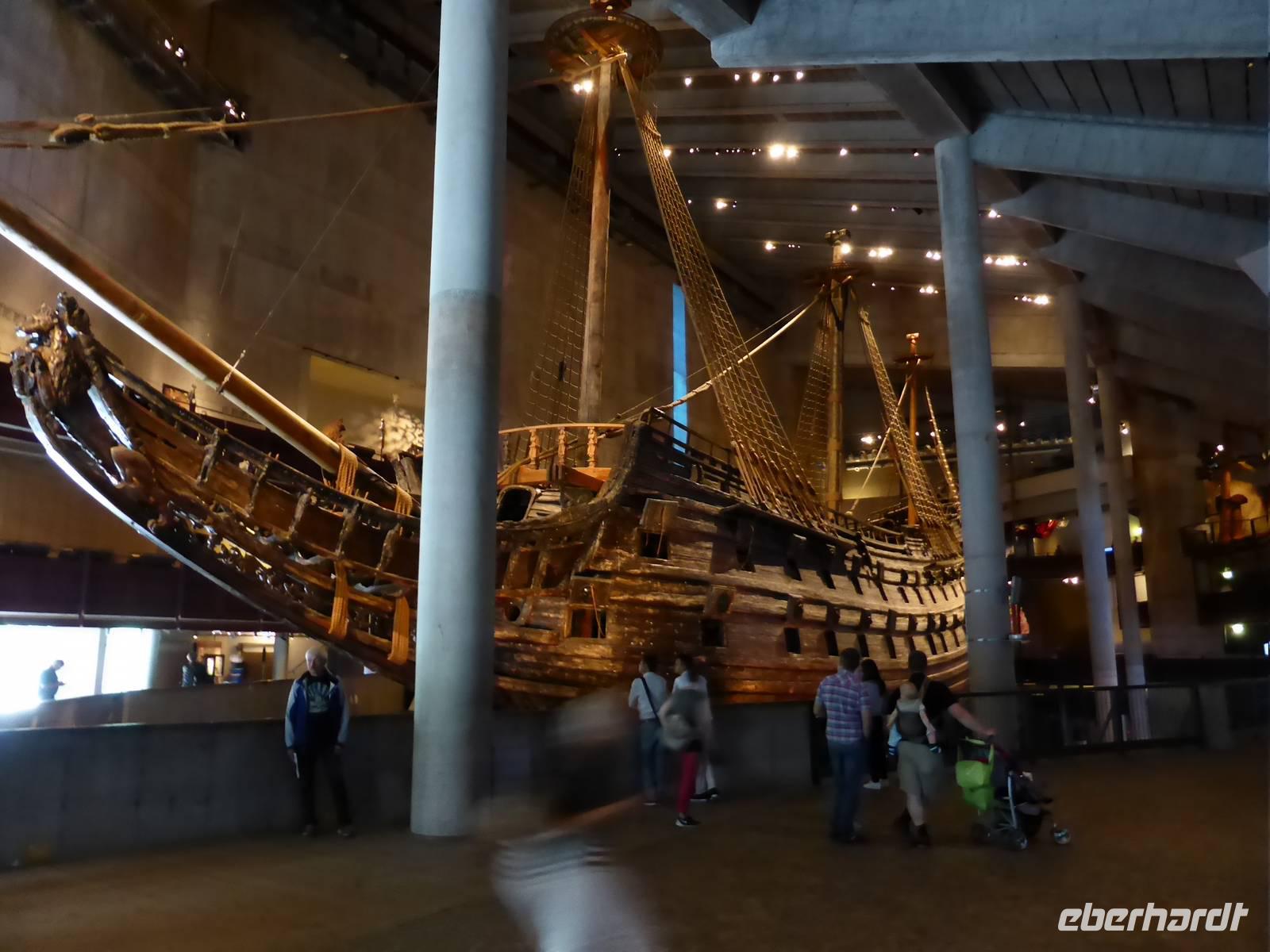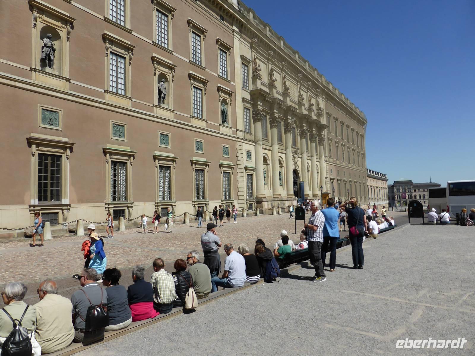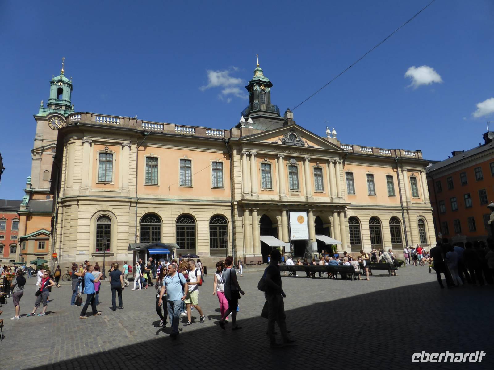 Nach dem Frühstück trafen wir uns mit unserem örtlichen Stadtführer David. Nach einem Rundgang vor dem Stadthaus fuhren wir zum Vasamuseum. Dieses gleich am frühen Morgen zu besichtigen war eine gute Entscheidung, denn bei unserer Ankunft war der Busparkplatz noch leer. Das Vasa-Museum ist vielleicht das schönste Schiffsmuseum der Welt. Das einzige ausgestellte Schiff ist das Kriegsschiff Vasa, welches beim Stapellauf im Jahre 1628 im Stockholmer Hafen versank. Als wir nach dem Museumsbesuch unsere Stadtrundfahrt fortsetzten, war der Parkplatz bereits voll. Es ging über die Skansen-Insel, vorbei an den ausländischen Botschaften und für einen Fotostopp auf die Insel „Söderholmen", von der aus wir einen grandiosen Blick auf die Stockholmer Altstadt hatten. Anschließend fuhren wir zur Altstadt hinüber und beendeten unsere Busrundfahrt vor dem Stockholmer Schloss. Gegen 12.10 Uhr paradierte die Kapelle zur Wachablösung an uns vorbei. Danach setzten wir unsere Stadtbesichtigung zu Fuß fort. Am Altstädter Markt beendete David die Stadtführung und bis zur Weiterfahrt um 13.00 Uhr hatten wir noch etwas Freizeit für eigene Erkundungen.