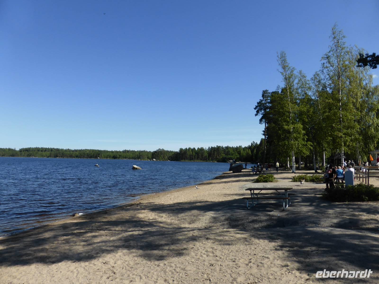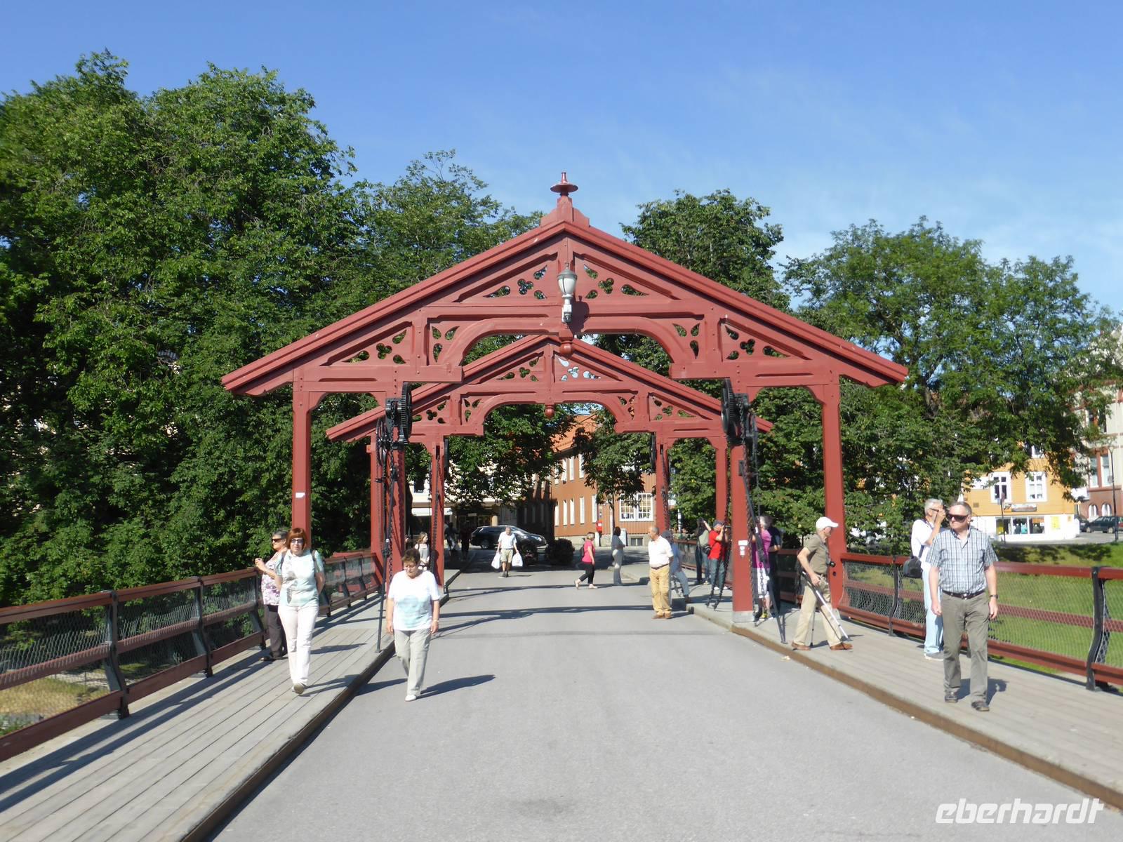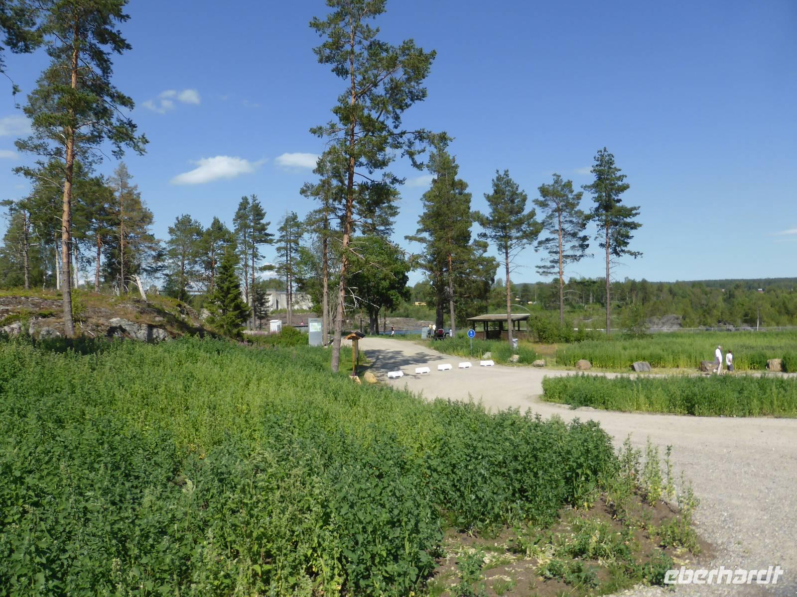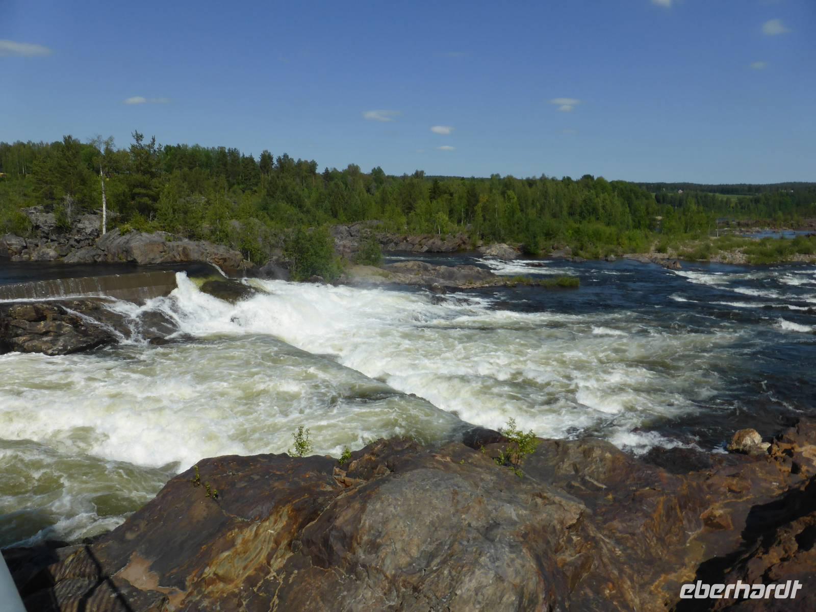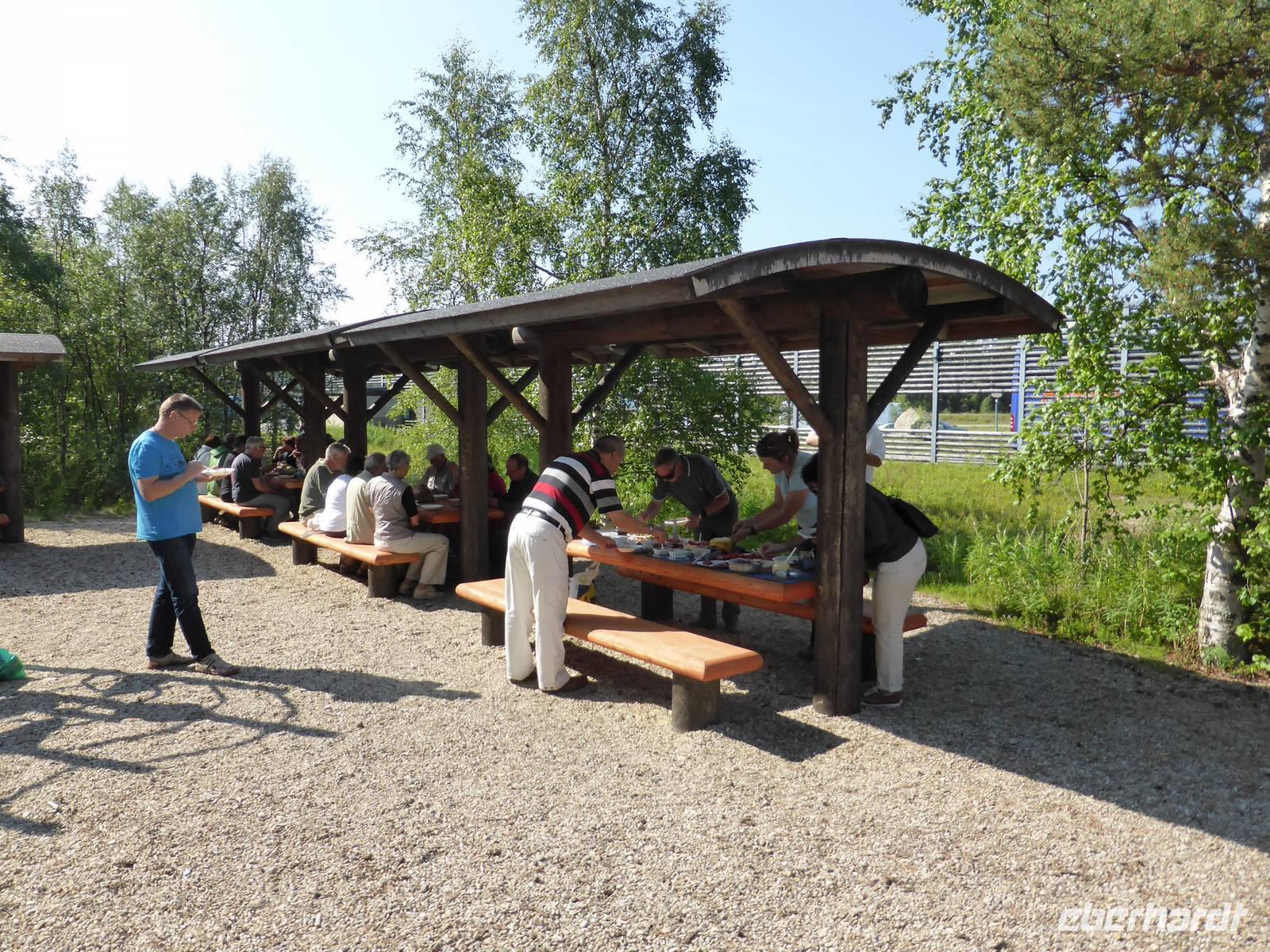 Unser heutiges Tagesziel hieß Lulea. Ein besonderes Erlebnis war unser Aufenthalt an der Högaküsten-Brücke. Sie ist die neuntlängste Hängebrücke der Welt und ein eindrucksvolles architektonisches Bauwerk. Von dort fuhren wir zur Olofsfors Eisenhütte, welche über 250 Jahre alt ist und heutzutage als technisches Museum besucht werden kann. Wer wollte, konnte die alten Produktionsstätten inspizieren oder in den grünen Außenanlagen spazieren gehen. Anschließend machten wir bei Umea einen Abstecher zur Lachstreppe und zu den Stromschnellen am Umeälf. Während alle Gäste auf der Suche nach den Lachsen waren, wurde in der Zwischenzeit von unserem Fahrer Andre und mir das Grill-Mittagessen vorbereitet. Es gab Bratwürste, obwohl Lachs sicherlich auch nicht schlecht geschmeckt hätte. Nach der Mittagspause fuhren wir weiter zum