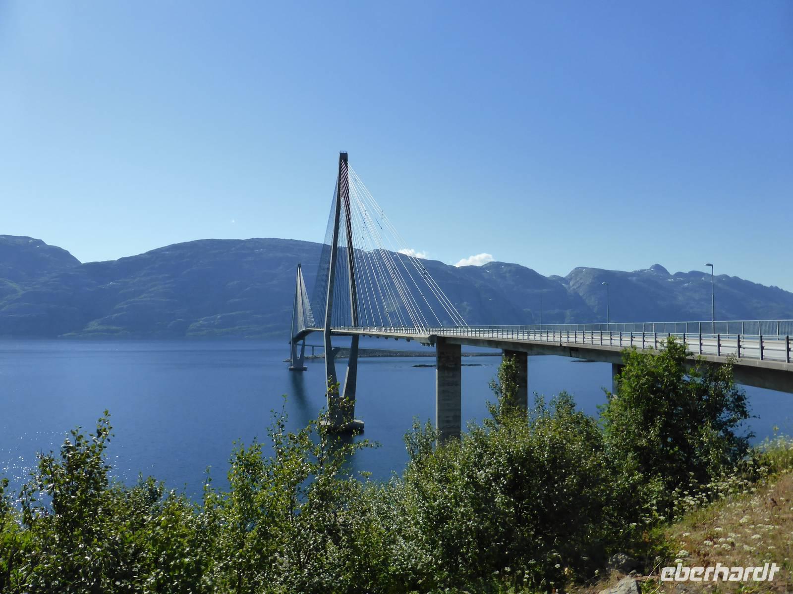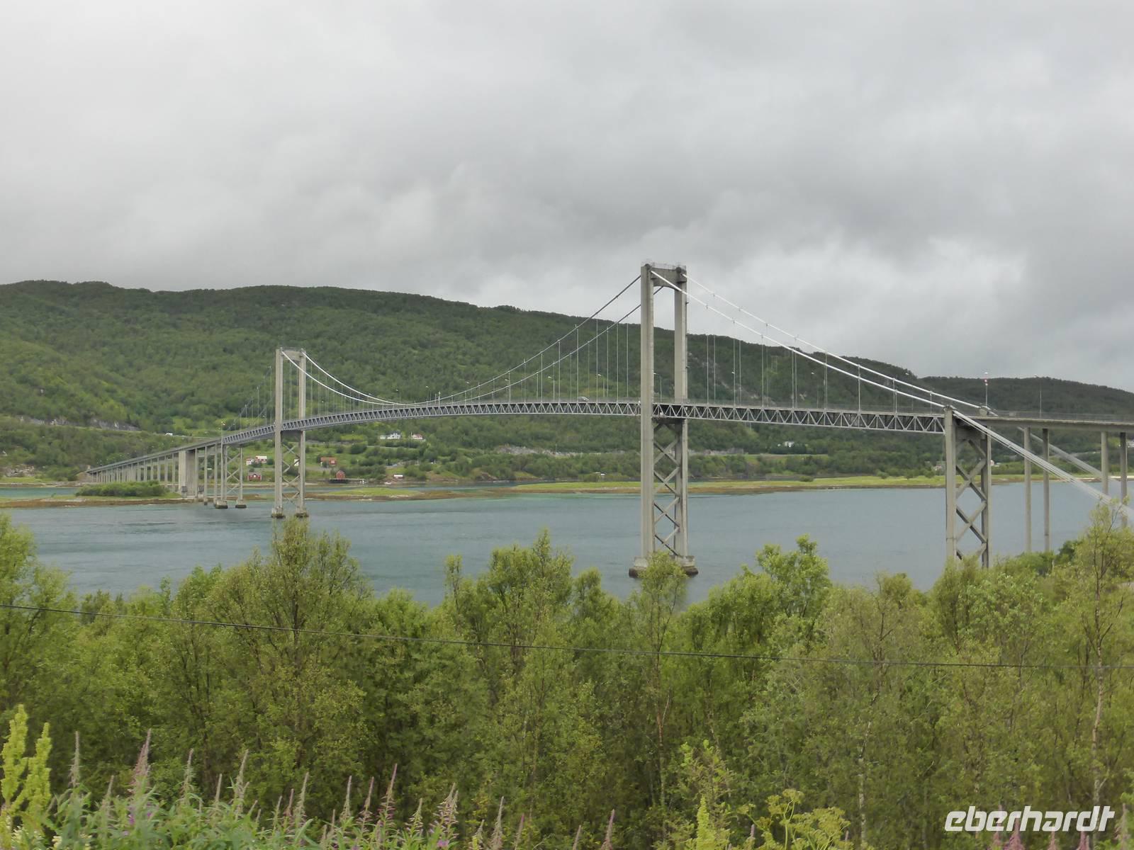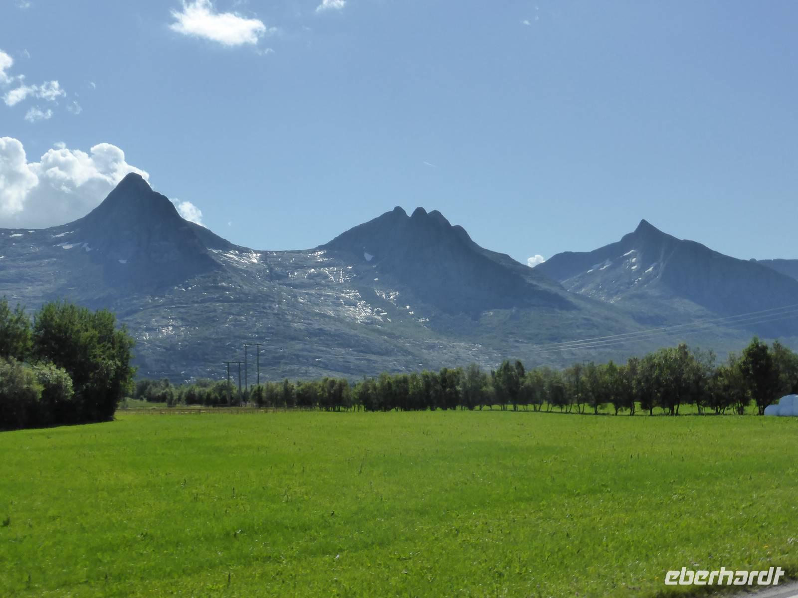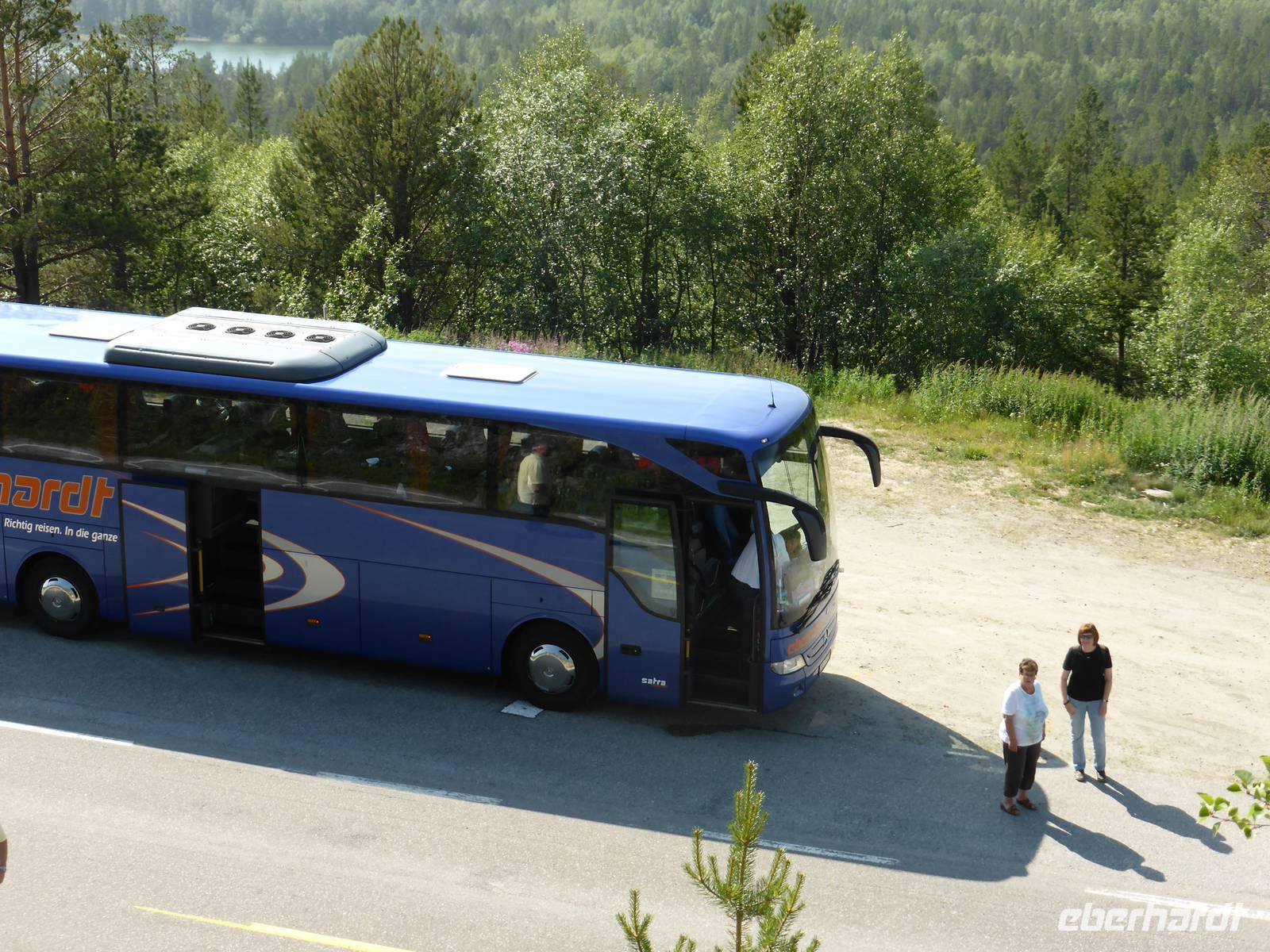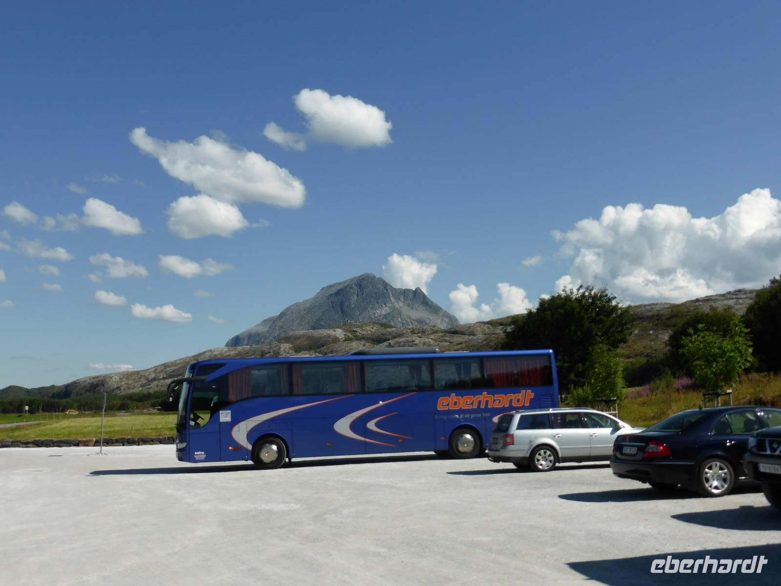 Am Morgen fuhren wir in südliche Richtung bis kurz vor Mosjoen. Hier hielten wir zur Kaffeeausgabe an einem kleinen See. Entlang des Vefsn-Fjords ging es nach Sandnessjoen. Dort gab es mit der weißen Helgelandbrücke, die sogar einmal zu Norwegens beliebtester Brücke gewählt worden ist, eine architektonische Meisterleistung zu bestaunen. Nach diesem Fotostopp fuhren wir an der Bergkette der „Sieben Schwestern" vorbei und suchten eine Stelle, um diese zu fotografieren. Die vorhandenen Parkplätze waren aber allesamt für unseren Bus zu klein, so dass letztendlich ein Halt in einer Bushaltestelle die beste Gelegenheit darstellte. Danach fuhren wir zum „Petter Dass-Museum", nahe der Ortschaft Alstahaug. Sehenswert sind in diesem schönen Gelände die romanische Steinkirche aus dem 12.Jahrhundert, die alten Pfarrhäuser und das moderne „Petter Dass-Museum". Der Priester Petter Dass war vielleicht der bedeutendste norwegische Dichter Ende des 17. und Anfang des 18. Jahrhunderts. Von Alstahaug aus fuhren wir zu unserem Fährhafen nach Tjotta. Die einstündige Fahrt von Tjoetta nach Forvik war sehr angenehm und es boten sich viele schöne Fotomotive. Von unserem Ankunftshafen in Forvik ging es weiter zum nächsten Fährhafen nach Andalsvagen. Die zweite Fährpassage dauerte nur 20 Minuten. Die dritte und letzte Fähre brachte uns dann von Vennesund nach Holm. Bei unserer Weiterfahrt zu unserem Übernachtungsort in Steinkjer machten wir anschließend noch eine Pause in der Ortschaft Grong. Nach diesem erlebnisreichen Tag kamen wir am Abend in unserem Best Western Hotel „Tinvold Park" in Steinkjer an.