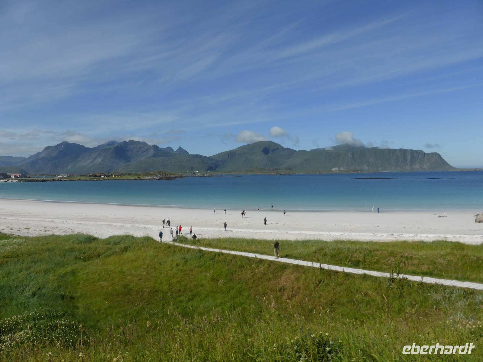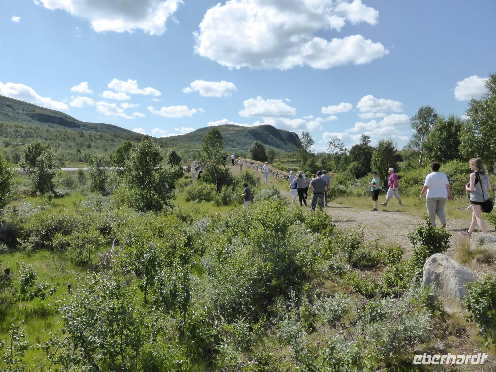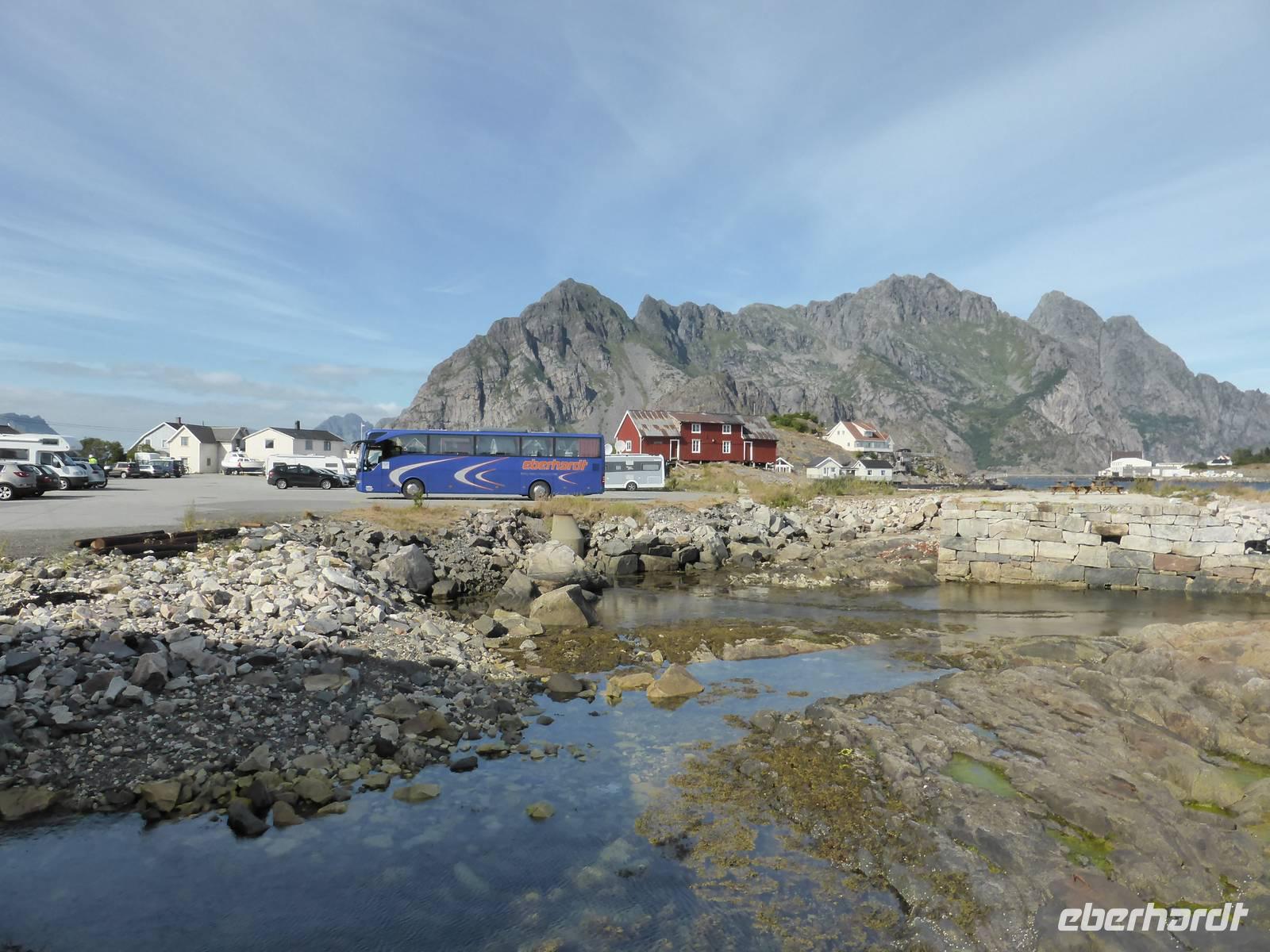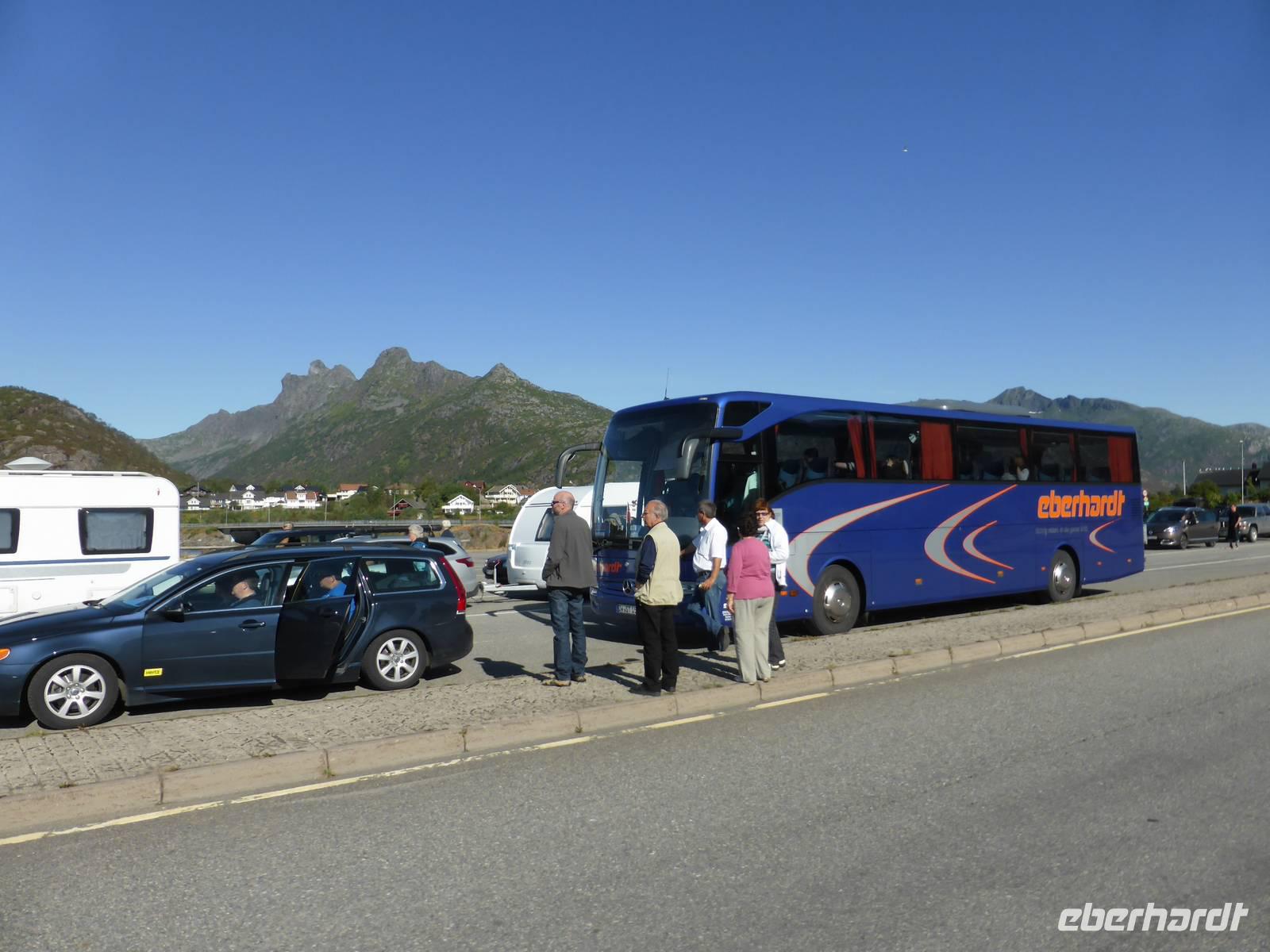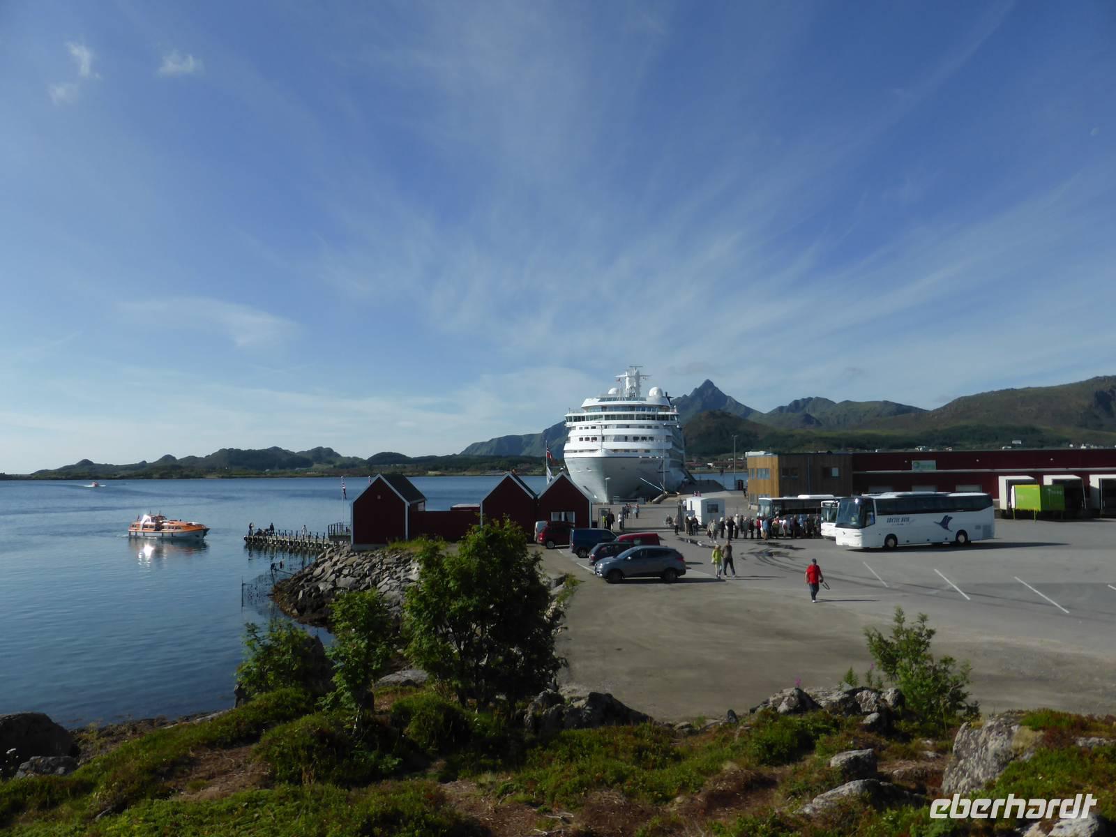 Nach dem Frühstück mit Ausblick auf die fantastische Schärenlandschaft begannen wir unsere Rundfahrt auf den Lofoten. Zuerst fuhren wir an die Bucht von Leknes, um die dort liegenden Kreuzfahrtschiffe zu fotografieren. Dann ging es über Napp zum Strand von Ramberg, wo wir bei strahlendem Sonnenschein und sommerlichen Temperaturen am Strand spazieren gingen. Von dort fuhren wir durch den Nappstraumen-Tunnel zurück auf die Insel Vestvagoy und machten noch einen Fotostopp am Strand von Utakleiv. Gegen Mittag erreichten wir schließlich die Ortschaft Borg, die durch das Wikingermuseum „Lofot" berühmt geworden ist. Zu Beginn besuchten wir gemeinsam mit unserem Museumsführer das Häuptlings- bzw. Fürstenhaus und stärkten uns bei einer kräftigen und wohlschmeckenden Lammsuppe. Vielleicht hätte man uns diese auch vor 1000 Jahren in dieser oder ähnlicher Form serviert. Nach der gemeinsamen Besichtigung hatten wir Freizeit für individuelle Erkundungen. Den Abschluss bildete der Museumsbesuch mit Filmvorführung.