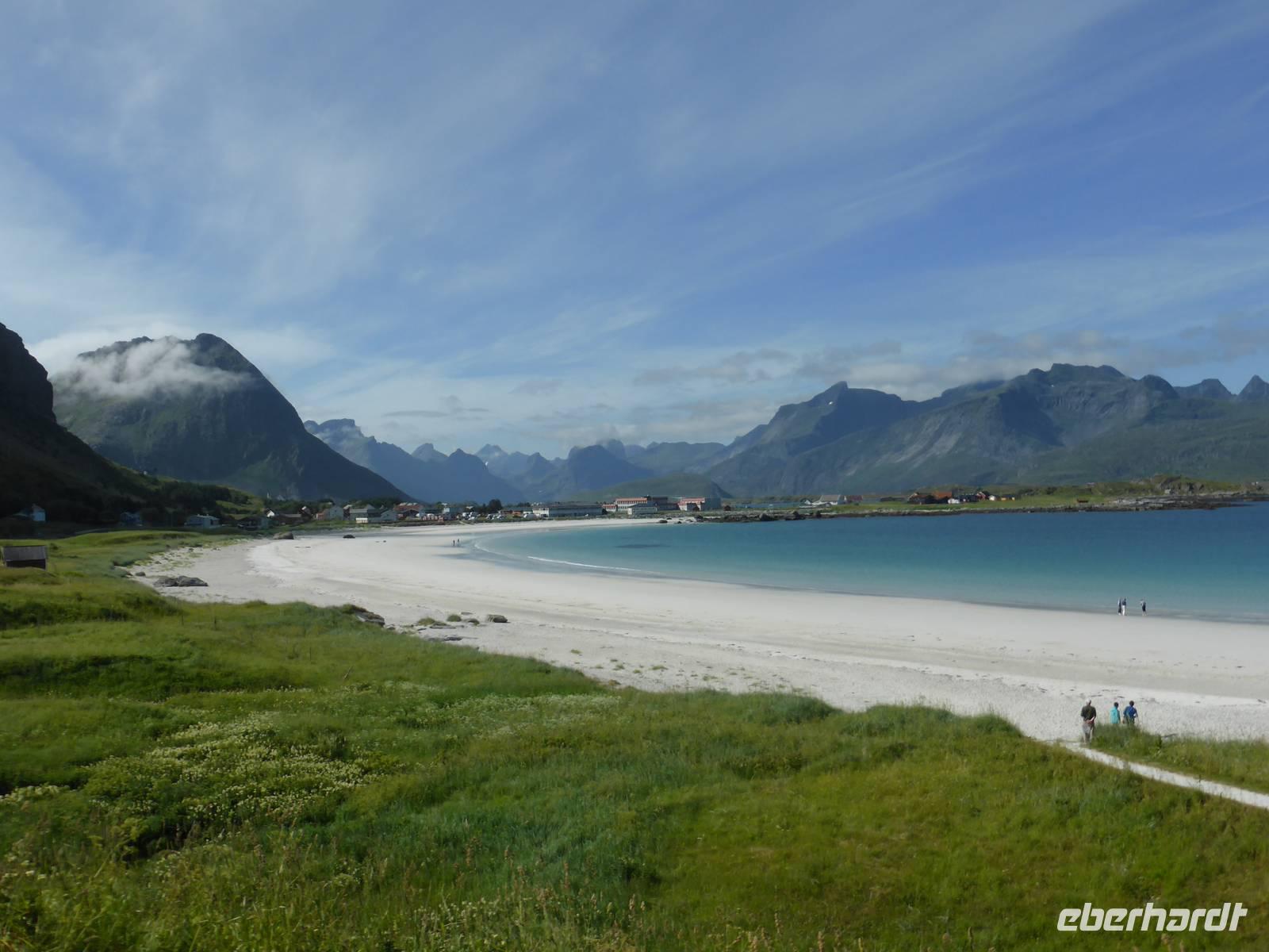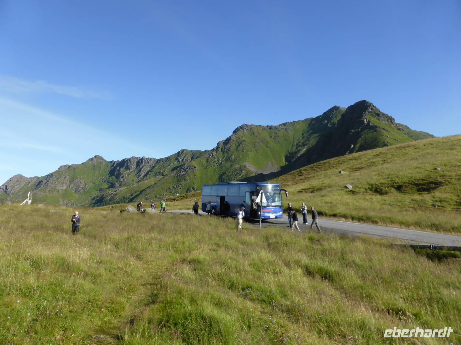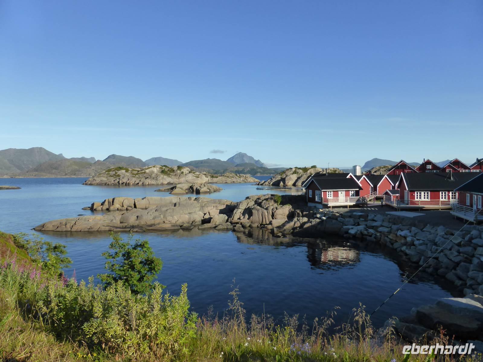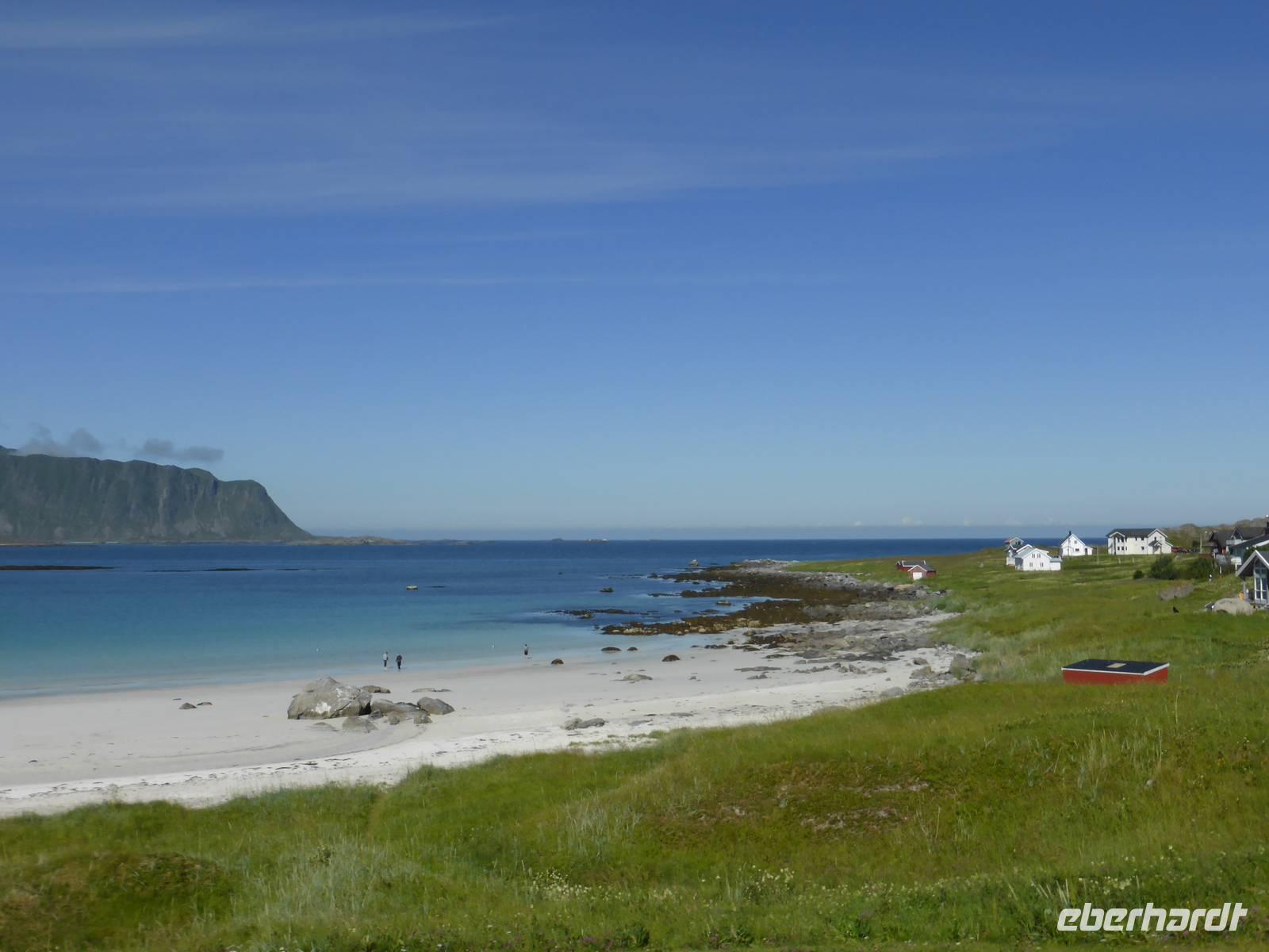 Nach dem Frühstück mit Ausblick auf die fantastische Schärenlandschaft begannen wir unsere Rundfahrt auf den Lofoten. Zuerst fuhren wir an die Bucht von Leknes, um die dort liegenden Kreuzfahrtschiffe zu fotografieren. Dann ging es über Napp zum Strand von Ramberg, wo wir bei strahlendem Sonnenschein und sommerlichen Temperaturen am Strand spazieren gingen. Von dort fuhren wir durch den Nappstraumen-Tunnel zurück auf die Insel Vestvagoy und machten noch einen Fotostopp am Strand von Utakleiv. Gegen Mittag erreichten wir schließlich die Ortschaft Borg, die durch das Wikingermuseum „Lofot" berühmt geworden ist. Zu Beginn besuchten wir gemeinsam mit unserem Museumsführer das Häuptlings- bzw. Fürstenhaus und stärkten uns bei einer kräftigen und wohlschmeckenden Lammsuppe. Vielleicht hätte man uns diese auch vor 1000 Jahren in dieser oder ähnlicher Form serviert. Nach der gemeinsamen Besichtigung hatten wir Freizeit für individuelle Erkundungen. Den Abschluss bildete der Museumsbesuch mit Filmvorführung.