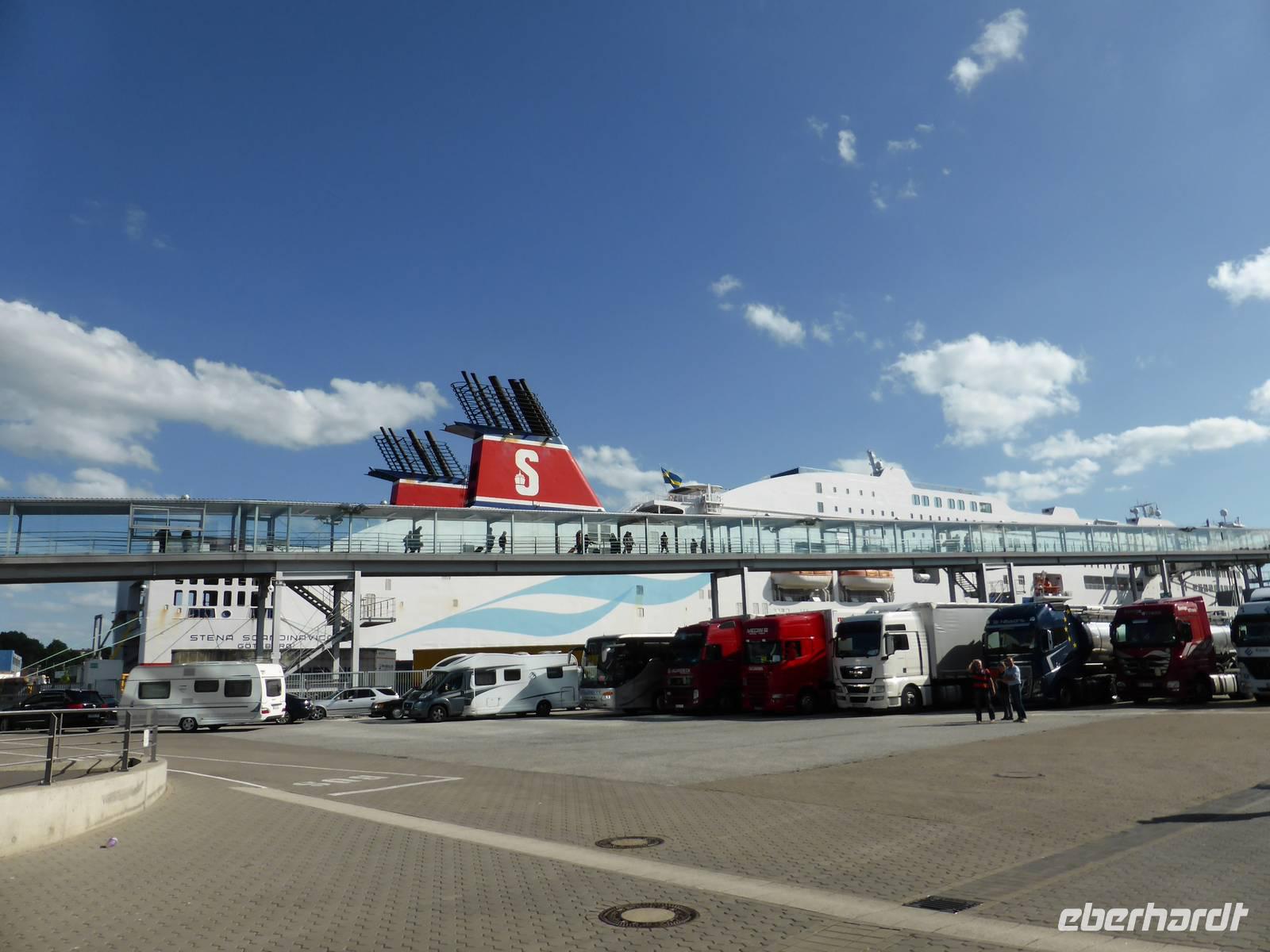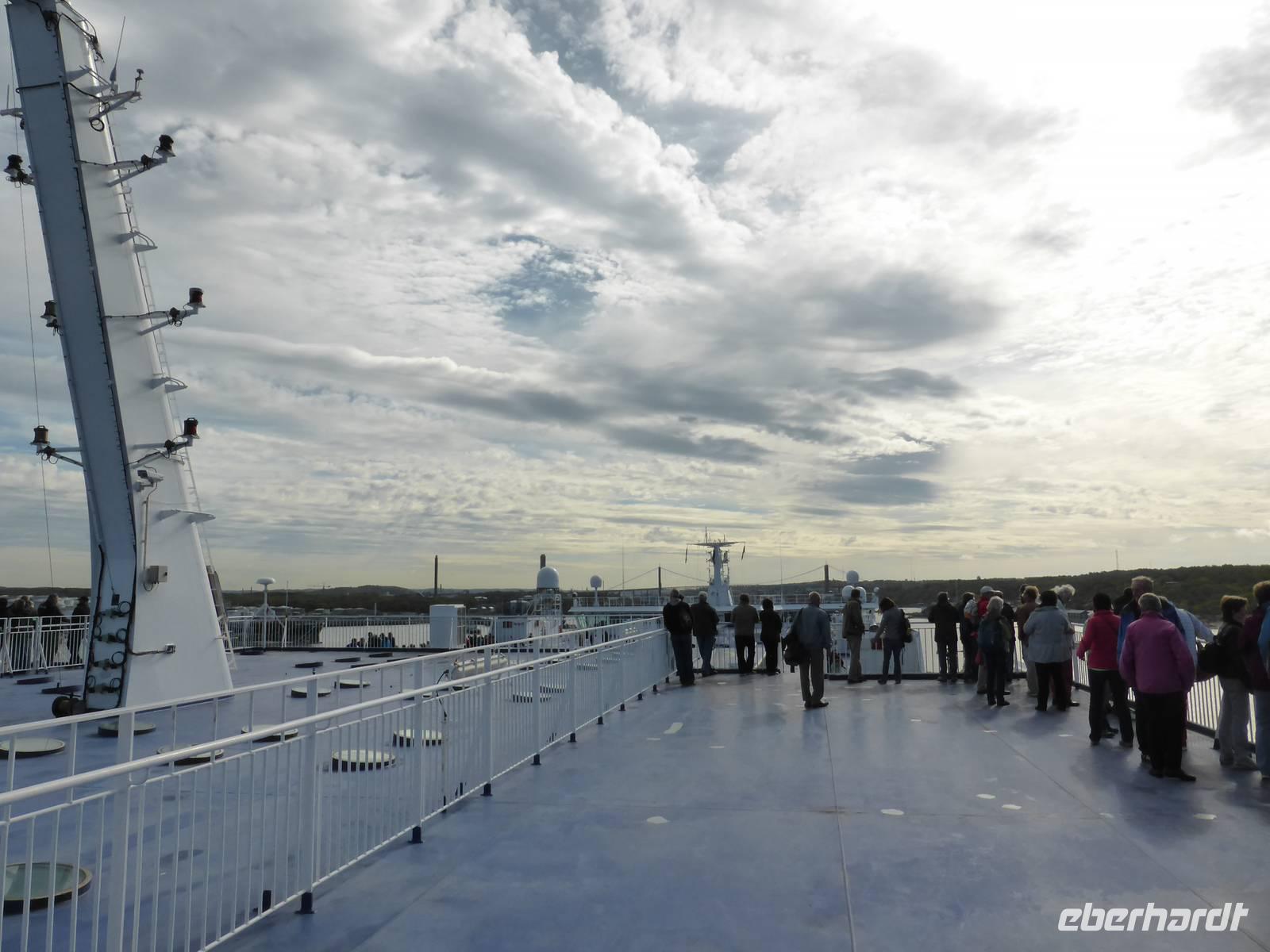 Unsere Reise begann am Flughafen Dresden. Entlang der Autobahn erfolgten weitere Zustiege am FH Leipzig und bei Magdeburg. Unsere Fahrtroute verlief über die A2 in Richtung Hannover. Gleich hinter dem gleichnamigen Autobahnkreuz verloren wir knapp eine Stunde Fahrzeit im Stau. Weiter ging es durch die Lüneburger Heide zum Flughafen Hamburg. Hier stiegen zwei weitere Gäste zu. Gegen 16.40 Uhr kamen wir am Terminal der Stena Line in Kiel an und holten unsere Kabinenschlüssel ab. Nach dem Bezug der Kabinen war bis zum Abendessen noch etwas Freizeit, um das Schiff kennenzulernen.