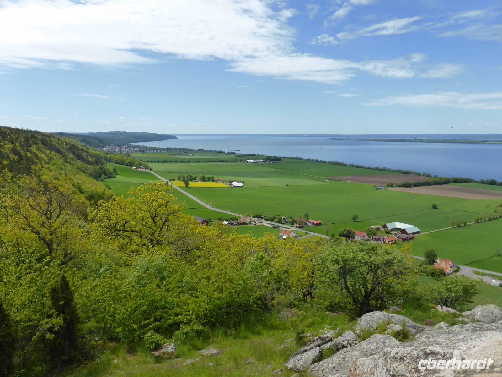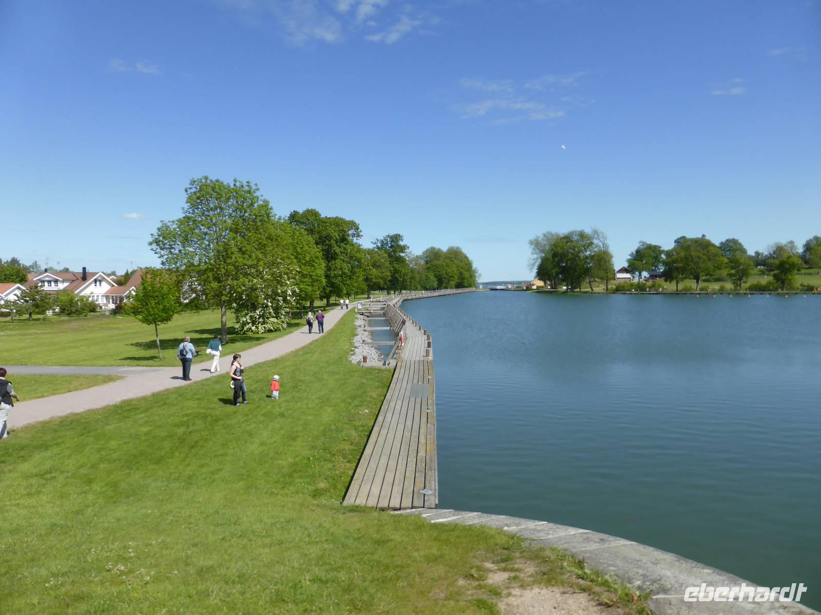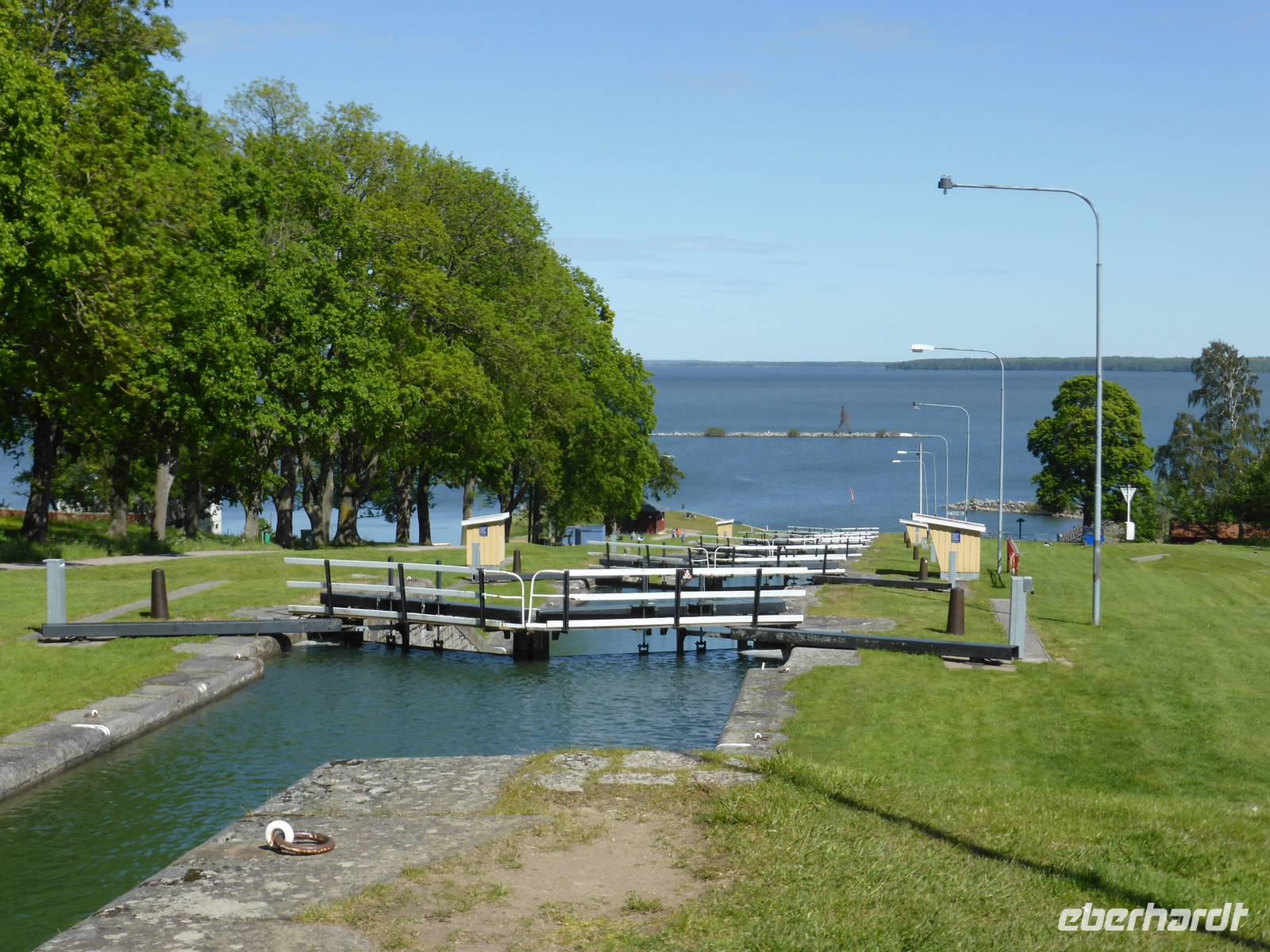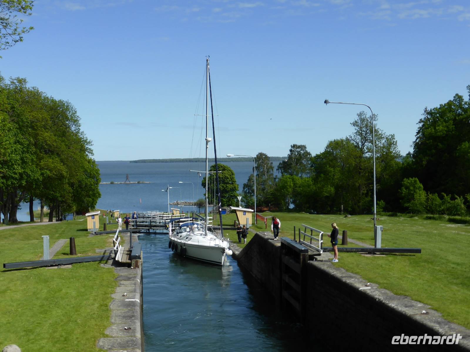 Am nächsten Morgen fuhren wir durch den Schärengürtel in den Hafen von Göteborg ein. Nach der Ankunft und dem Verlassen des Schiffes starteten wir in Richtung Boras sowie schwedische Seenplatte. Unsere Mittagspause legten wir am Rasthof Brahehus ein. Hier konnten wir die berühmten rot-weißen Zuckerstangen aus Gränna kaufen und hatten von der romantischen Schlossruine aus einen fantastischen Blick auf den Vätternsee. Von Gränna aus fuhren wir zum Runenstein von Röck und von dort nach Berg zur Schleusentreppe des Göta-Kanals. Hier sahen wir, wie die Schiffe in mehreren Schleusen einen Höhenunterschied von 10 - 15 Meter überwinden. Wir hatten fantastisches Wetter und genossen den Aufenthalt inmitten der schönen Seenlandschaft. Anschließend fuhren wir weiter zu unserem Hotel „Scandic Talk" am Stockholmer Messegelände. Zum Abendessen trafen wir Frank, den Busfahrer unserer Rundreise. Er löste Heinz ab, der uns bis Stockholm die ersten beiden Tage gefahren hatte und von dem wir uns am nächsten Tag verabschiedeten.
