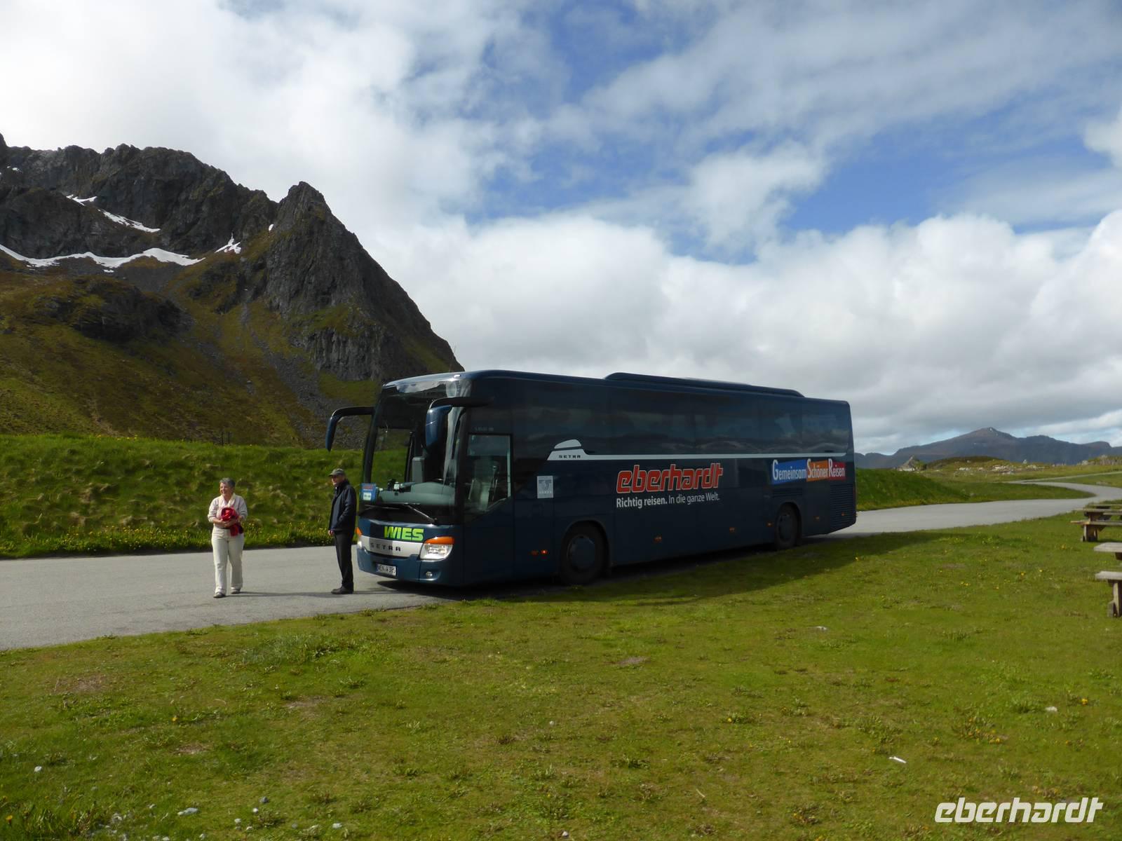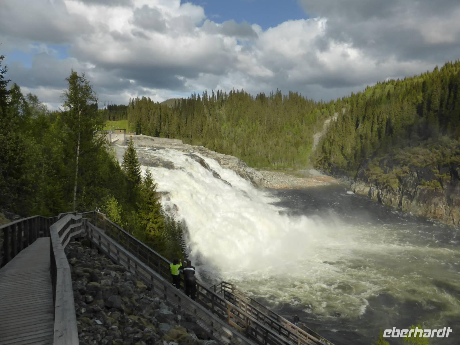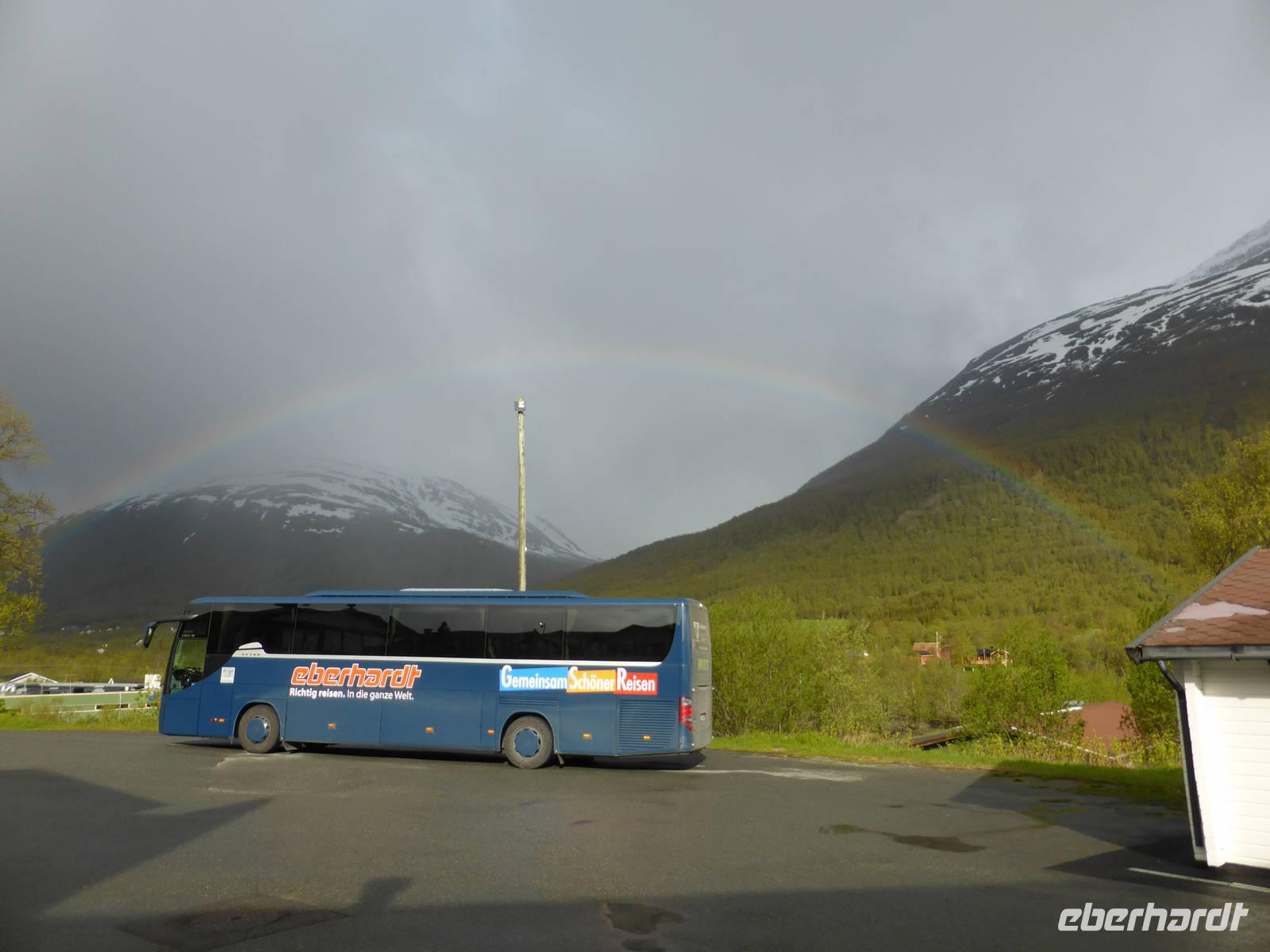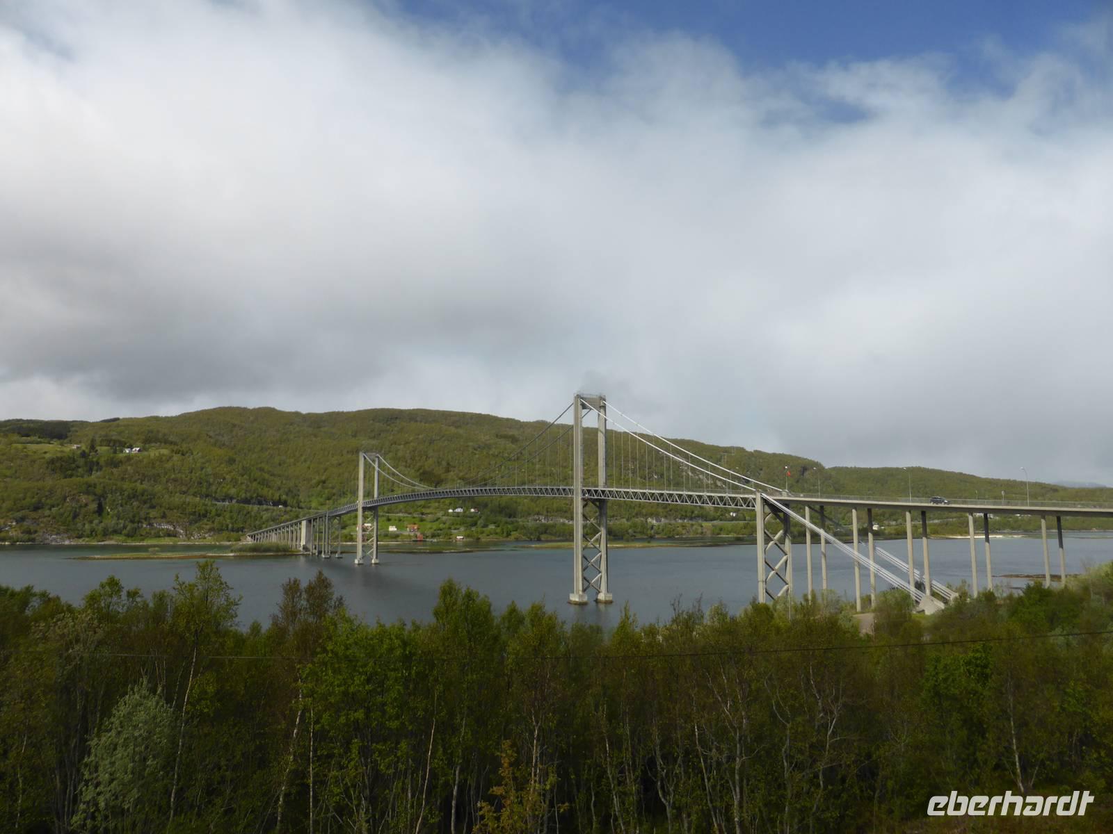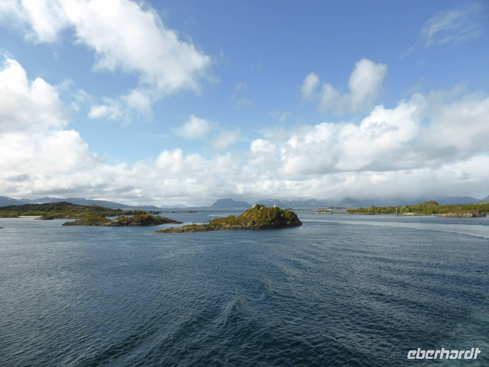 Am Morgen fuhren wir von Mo i Rana in südliche Richtung und als erster Reisebus von „Eberhardt-Travel" durch den erst im November 2014 eröffneten 11 Kilometer langen Toventunnel nach Sandnessjoen. Dort gab es mit der weißen Helgelandbrücke, die sogar einmal zu Norwegens beliebtester Brücke gewählt worden ist, eine architektonische Meisterleistung zu bestaunen. Nach diesem Fotostopp fuhren wir an der Bergkette der „Sieben Schwestern" vorbei und hielten am „Petter-Dass-Museum", nahe der Ortschaft Alstahaug. Sehenswert sind in diesem schönen Gelände die romanische Steinkirche aus dem 12.Jahrhundert, die alten Pfarrhäuser und das moderne „Petter Dass-Museum". Der Priester Petter Dass war vielleicht der bedeutendste norwegische Dichter Ende des 17. und Anfang des 18. Jahrhunderts. Von Alstahaug aus fuhren wir zu unserem Fährhafen nach Tjotta. Die einstündige Fahrt von Tjoetta nach Forvik war sehr angenehm und es boten sich viele schöne Fotomotive. Von unserem Ankunftshafen in Forvik ging es weiter zum nächsten Fährhafen nach Andalsvagen. Die zweite Fährpassage dauerte nur 20 Minuten. In Horn angekommen, machten wir einen Abstecher zum Berg „Torghatten", an dem wir auch unsere Mittagspause einlegten. Die Legende sagt, dass einst der König von Sömna seinen schützenden Hut vor das hübsche Mädchen Lekamoya warf, um es vor dem Pfeil des Hestmannes zu schützen. Der Pfeil durchbohrte genau in dem Moment den Hut, in dem die Sonne aufging und alles zu Stein erstarren ließ. Die Hutform des Torghatten ist heute noch gut zu erkennen und zu dem Loch im Fels kann man hoch laufen.Die dritte und letzte Fähre brachte uns dann von Vennesund nach Holm. Bei unserer Weiterfahrt zu unserem Übernachtungsort in Steinkjer hielten wir anschließend am Namsen-Lachsaquarium. Leider hatte es zu dieser Jahreszeit immer noch geschlossen, aber wir nutzten die Gelegenheit um fantastische Aufnahmen vom Namsen-Fluss und vom Staudamm zu machen. Unsere eigentliche Pause legten wir dann auf einem kleinen Parkplatz oberhalb des Flusses ein. Alle Gäste werden sich noch gern erinnern, wie wir mit Hilfe von Lakritz-Bonbons norwegische Kinderaugen zum Leuchten brachten.