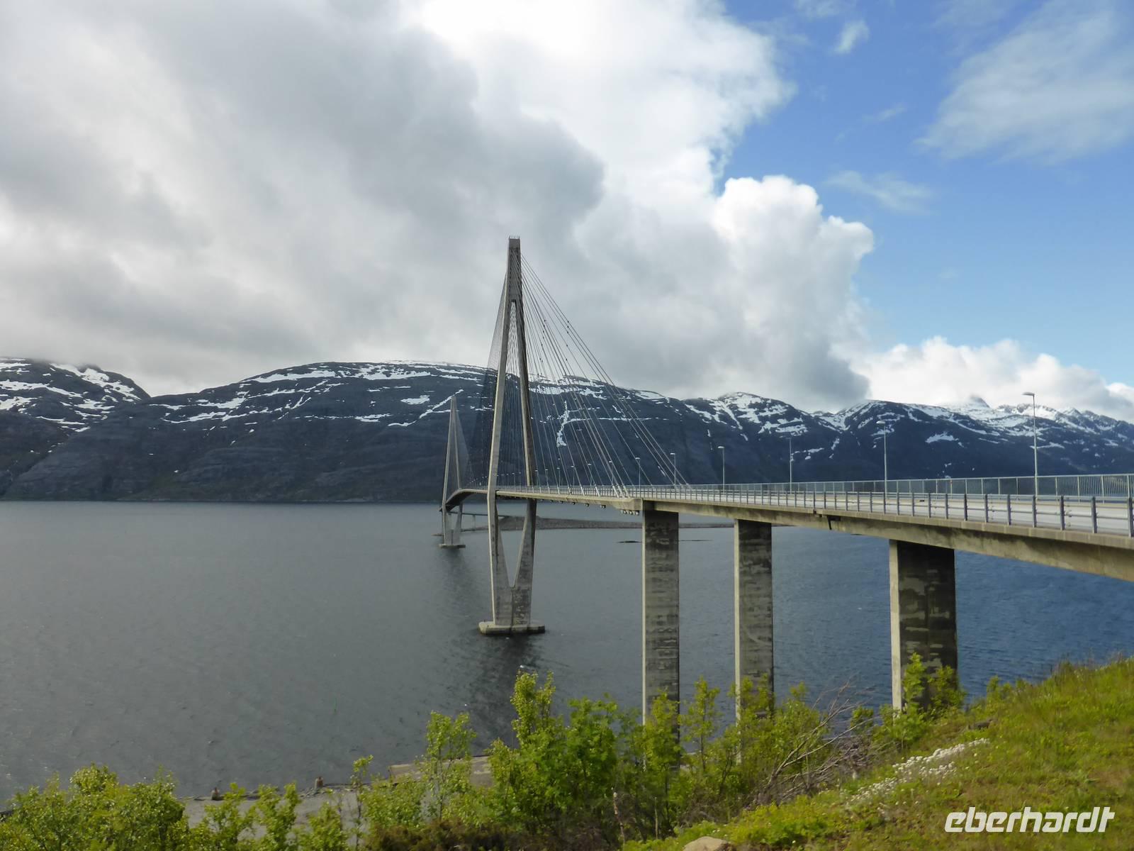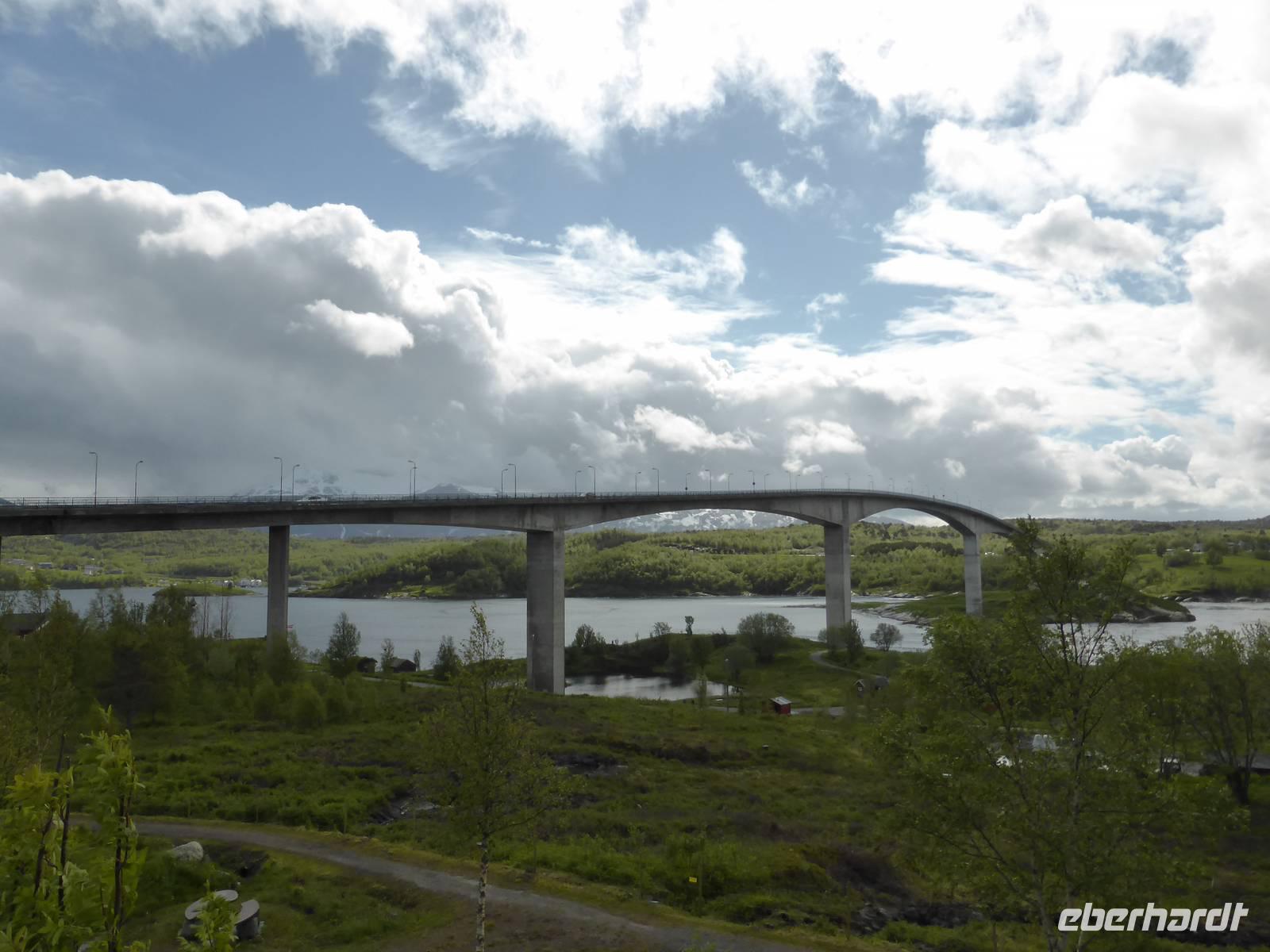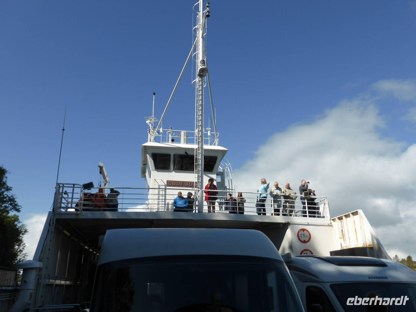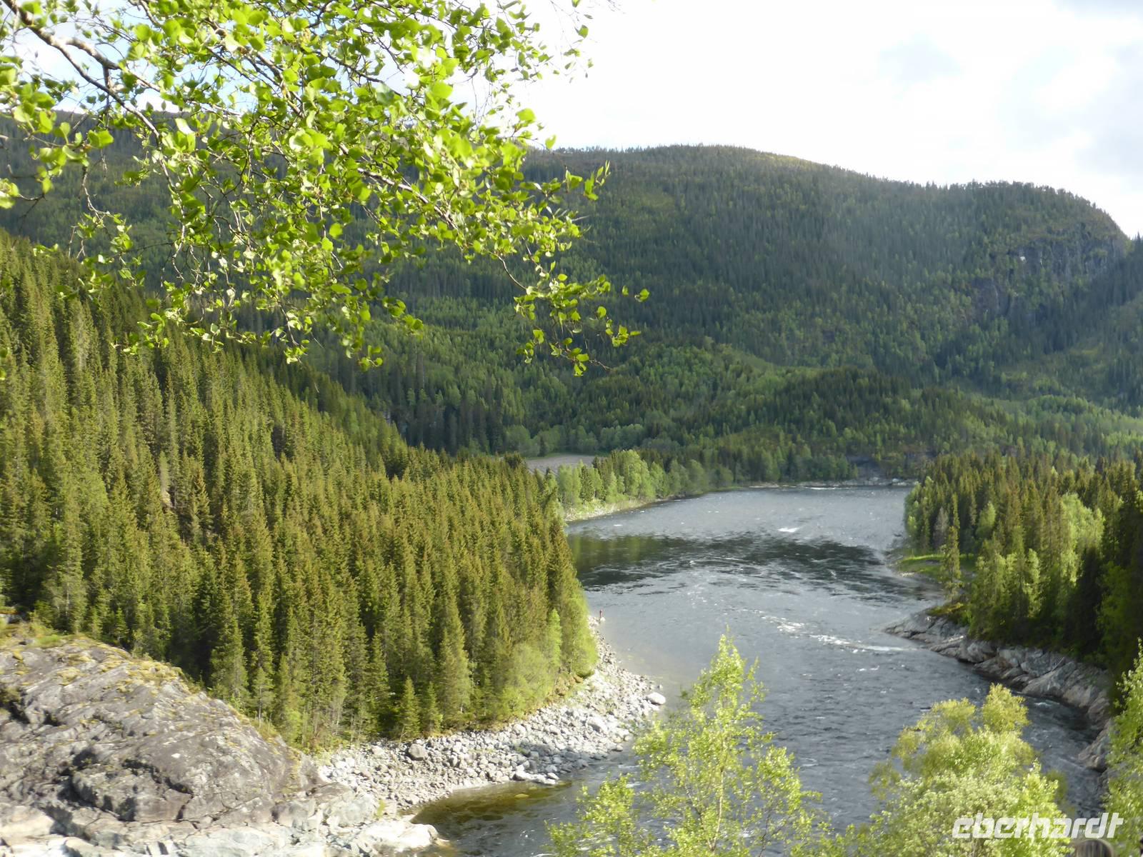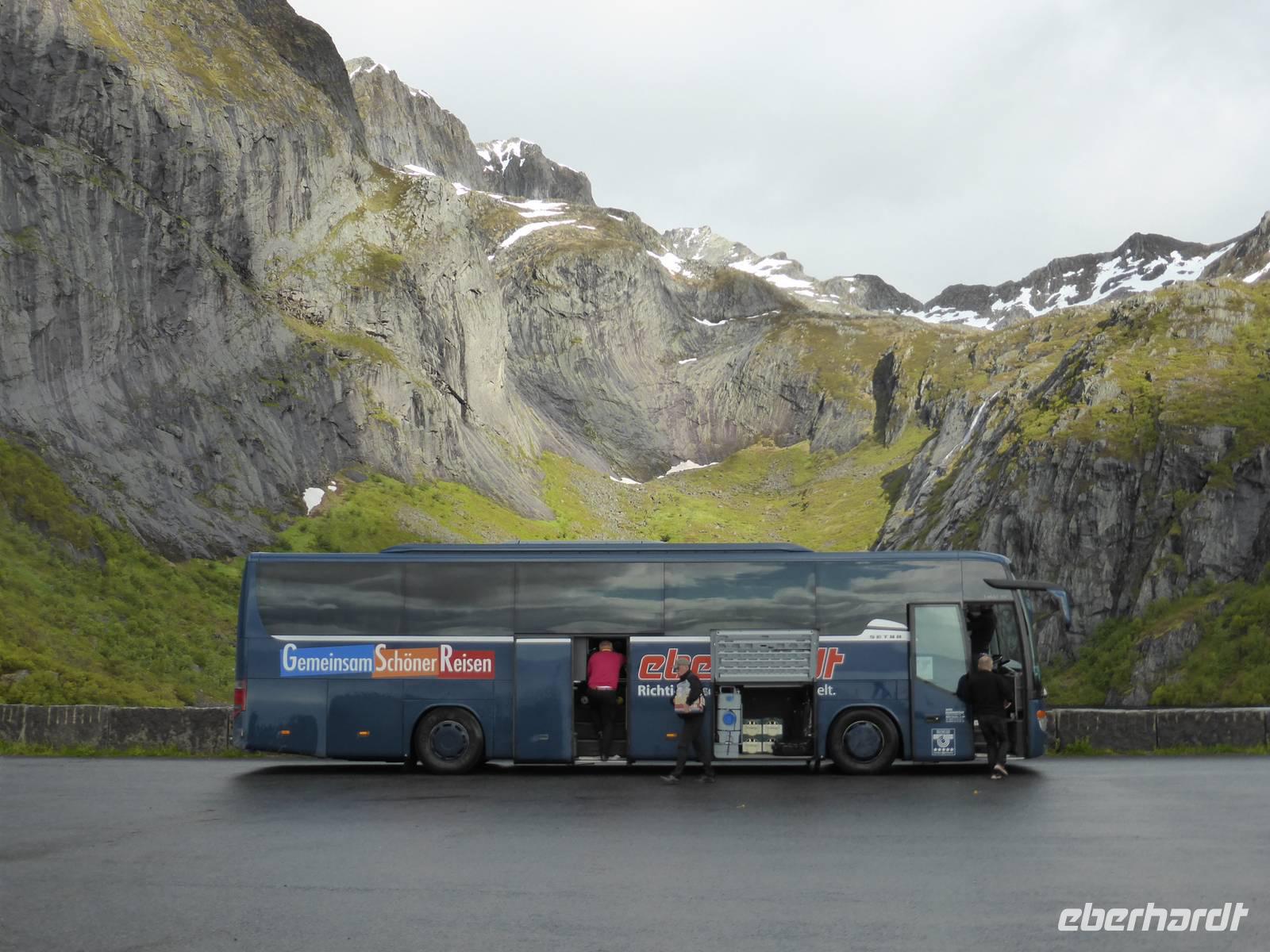 Am Morgen fuhren wir von Mo i Rana in südliche Richtung und als erster Reisebus von „Eberhardt-Travel" durch den erst im November 2014 eröffneten 11 Kilometer langen Toventunnel nach Sandnessjoen. Dort gab es mit der weißen Helgelandbrücke, die sogar einmal zu Norwegens beliebtester Brücke gewählt worden ist, eine architektonische Meisterleistung zu bestaunen. Nach diesem Fotostopp fuhren wir an der Bergkette der „Sieben Schwestern" vorbei und hielten am „Petter-Dass-Museum", nahe der Ortschaft Alstahaug. Sehenswert sind in diesem schönen Gelände die romanische Steinkirche aus dem 12.Jahrhundert, die alten Pfarrhäuser und das moderne „Petter Dass-Museum". Der Priester Petter Dass war vielleicht der bedeutendste norwegische Dichter Ende des 17. und Anfang des 18. Jahrhunderts. Von Alstahaug aus fuhren wir zu unserem Fährhafen nach Tjotta. Die einstündige Fahrt von Tjoetta nach Forvik war sehr angenehm und es boten sich viele schöne Fotomotive. Von unserem Ankunftshafen in Forvik ging es weiter zum nächsten Fährhafen nach Andalsvagen. Die zweite Fährpassage dauerte nur 20 Minuten. In Horn angekommen, machten wir einen Abstecher zum Berg „Torghatten", an dem wir auch unsere Mittagspause einlegten. Die Legende sagt, dass einst der König von Sömna seinen schützenden Hut vor das hübsche Mädchen Lekamoya warf, um es vor dem Pfeil des Hestmannes zu schützen. Der Pfeil durchbohrte genau in dem Moment den Hut, in dem die Sonne aufging und alles zu Stein erstarren ließ. Die Hutform des Torghatten ist heute noch gut zu erkennen und zu dem Loch im Fels kann man hoch laufen.Die dritte und letzte Fähre brachte uns dann von Vennesund nach Holm. Bei unserer Weiterfahrt zu unserem Übernachtungsort in Steinkjer hielten wir anschließend am Namsen-Lachsaquarium. Leider hatte es zu dieser Jahreszeit immer noch geschlossen, aber wir nutzten die Gelegenheit um fantastische Aufnahmen vom Namsen-Fluss und vom Staudamm zu machen. Unsere eigentliche Pause legten wir dann auf einem kleinen Parkplatz oberhalb des Flusses ein. Alle Gäste werden sich noch gern erinnern, wie wir mit Hilfe von Lakritz-Bonbons norwegische Kinderaugen zum Leuchten brachten.