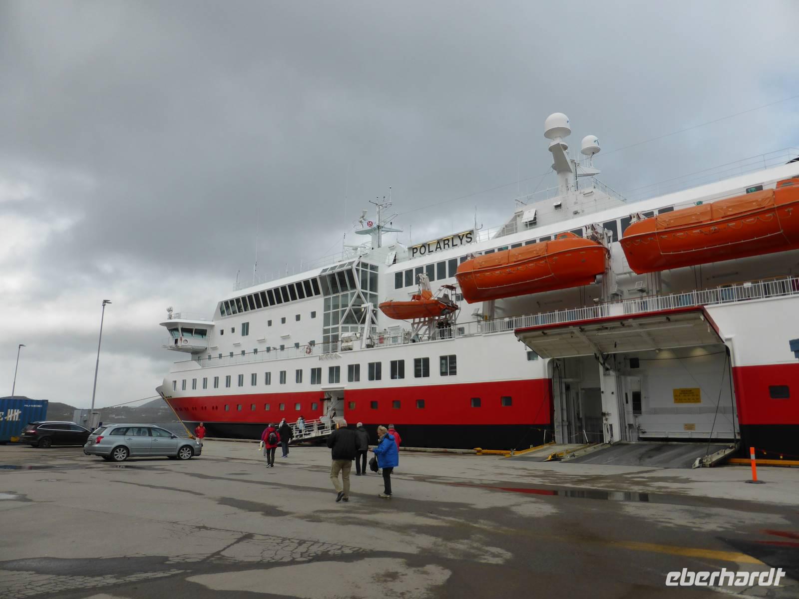 Unsere nächste Pause war am König Olafs- Weg, direkt an der Tjelsund-Brücke, an der wir einen prächtigen Blick auf die Vesteralen-Insel Hinnoya hatten. Anschließend fuhren wir weiter nach Stokmarknes. Hier wurde im Jahre 1893 die erste Linienverbindung von Trondheim nach Hammerfest eröffnet. Pünktlich legte die „MS Nordlys" in Richtung Svolvaer ab. Es war beeindruckend, zwischen den spitzen Bergmassiven der Vesteralen-Inseln hindurch zu fahren. Am aufregendsten war allerdings das Wendemanöver im schmalen Troll-Fjord, welches wir wohl immer in unserer Erinnerung behalten werden. Nach dieser traumhaften Fahrt auf der Hurtigrute kamen wir gegen 18.45 Uhr in Svolvaer auf den Lofoten an. Dort erwartete uns bereits Frank zur Weiterfahrt zu unseren Rorbu-Hütten in Mortsund. Nach der Begrüßung bezogen wir unsere Zimmer und trafen uns anschließend zum gemeinsamen Abendessen.