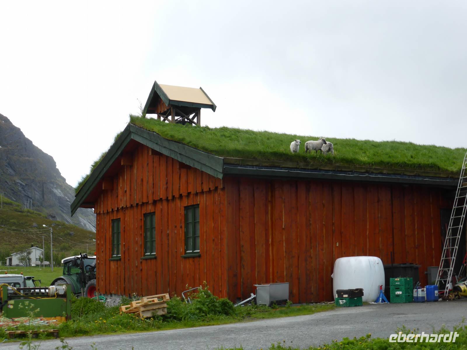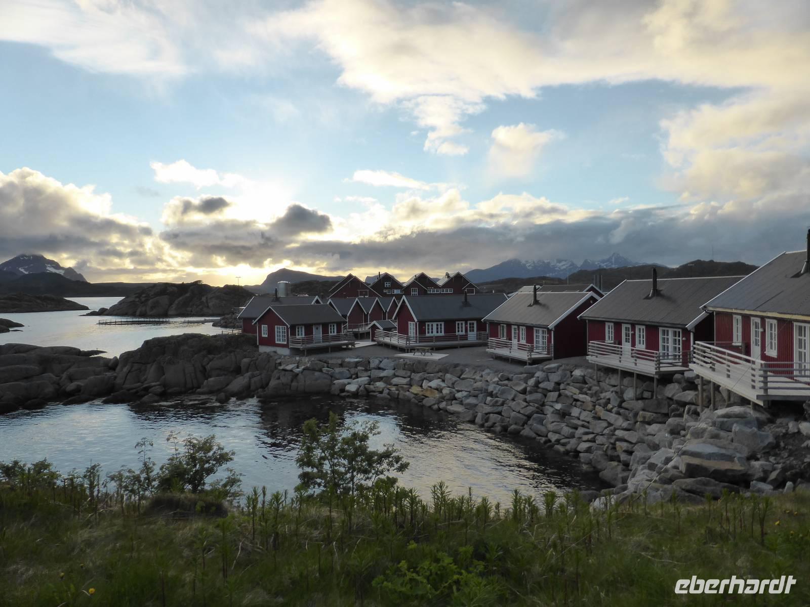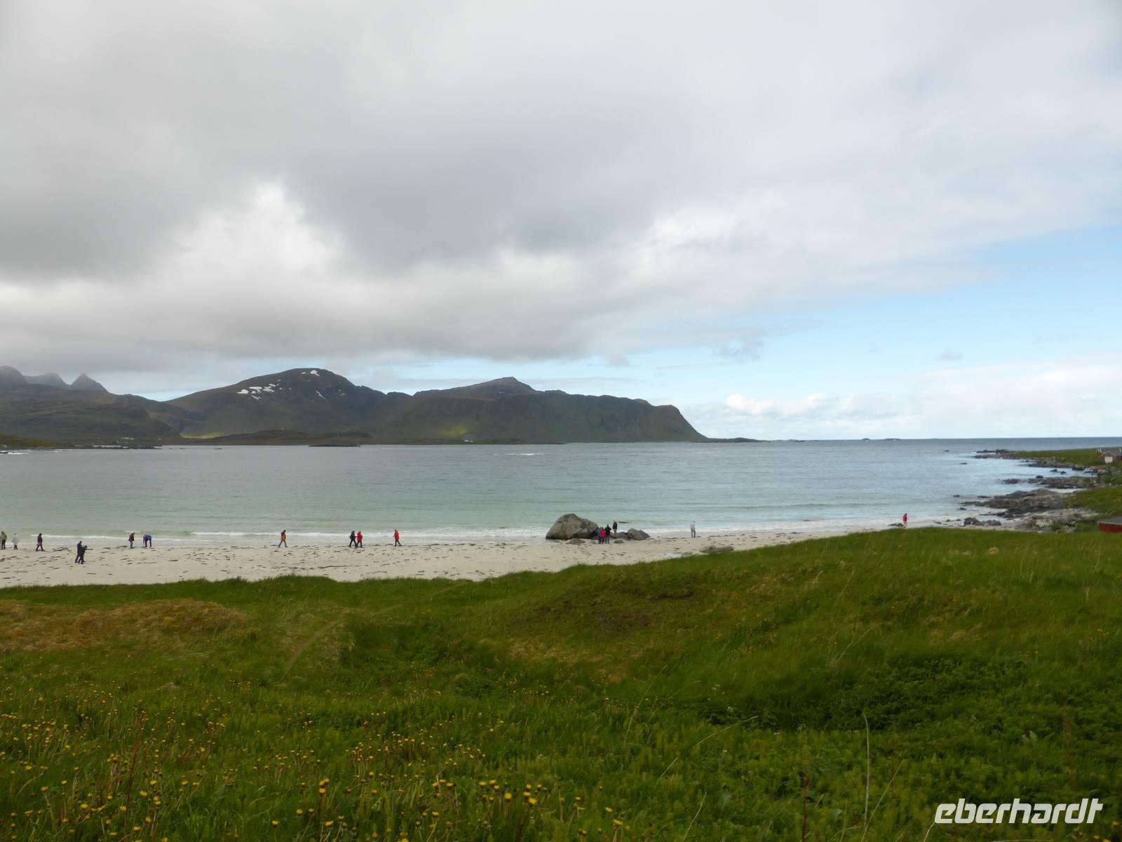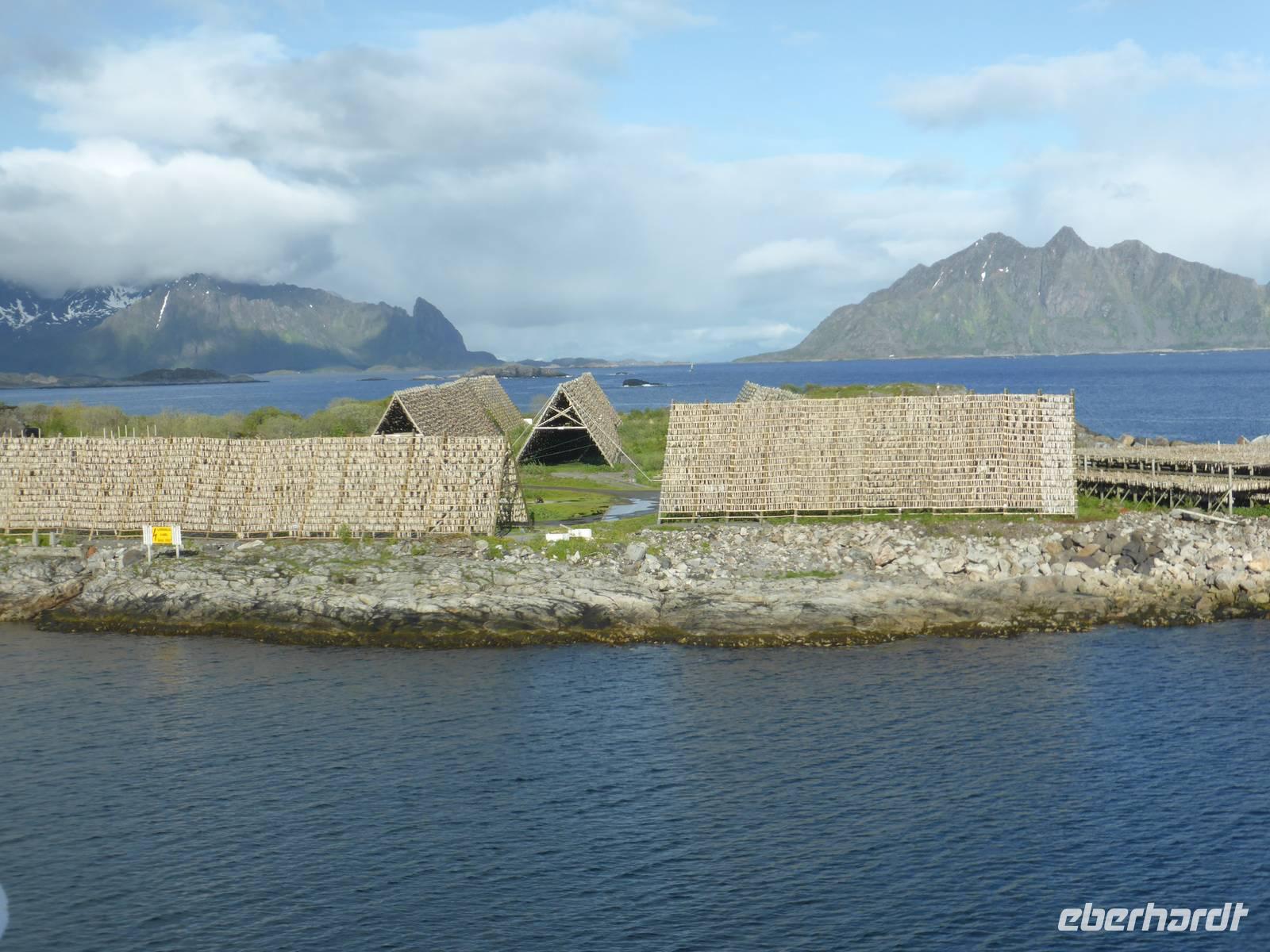Mit Ausblick auf die fantastische Schärenlandschaft begannen wir nach dem Frühstück unsere Rundfahrt auf den Lofoten. Zuerst fuhren wir in Richtung Insel Flakstadoya und hielten in der winzigen Ortschaft Vareid, weil wir auf einem Bauernhaus Schafe auf dem Dach weiden sahen. Das mussten wir einfach fotografieren! Anschließend ging die Fahrt zu den traumhaften Stränden von Ramberg und Flakstad. In Ramberg hatten wir auch Zeit für einen kleinen Spaziergang am Wasser. Von dort ging es durch den Nappstraumen-Tunnel zurück auf die Insel Vestvagoy und zum paradiesischen Strand von Utakleiv. Gegen Mittag erreichten wir schließlich die Ortschaft Borg, die durch das Wikingermuseum „Lofot" berühmt geworden ist. Während der Besichtigung des Museums sahen wir uns einen beeindruckenden Film über die Geschichte des Häuptlinghofes an. Danach besuchten wir gemeinsam mit unserem Museumsführer Christian das Häuptlings- bzw. Fürstenhaus und stärkten uns bei einer kräftigen und wohlschmeckenden Lammsuppe. Vielleicht hätte man uns diese auch vor 1000 Jahren in dieser oder ähnlicher Form serviert. Eine besondere Überraschung war die Gesanges-Darbietung der Museumsmitarbeiter im Häuptlingssaal. Nach der gemeinsamen Besichtigung hatten wir Freizeit für individuelle Erkundungen. Von Borg aus fuhren wir zum kleinen Fischerdorf Henningsvaer, wobei die Anfahrt über die beiden schmalen Brücken ein Erlebnis wurde. Wir nutzten unseren Aufenthalt zum Bummeln durch die bunten Häuserzeilen und suchten die besten Fotomotive . Von Henningsvaer aus ging es über den Breidtinden-Sattel zu unserer Robu-Siedlung nach Mortsund zurück. Vor dem Abendessen besuchten wir Brigittes Vortrag über den Stockfisch und hatten auch Gelegenheit, getrockneten Fisch zu probieren.