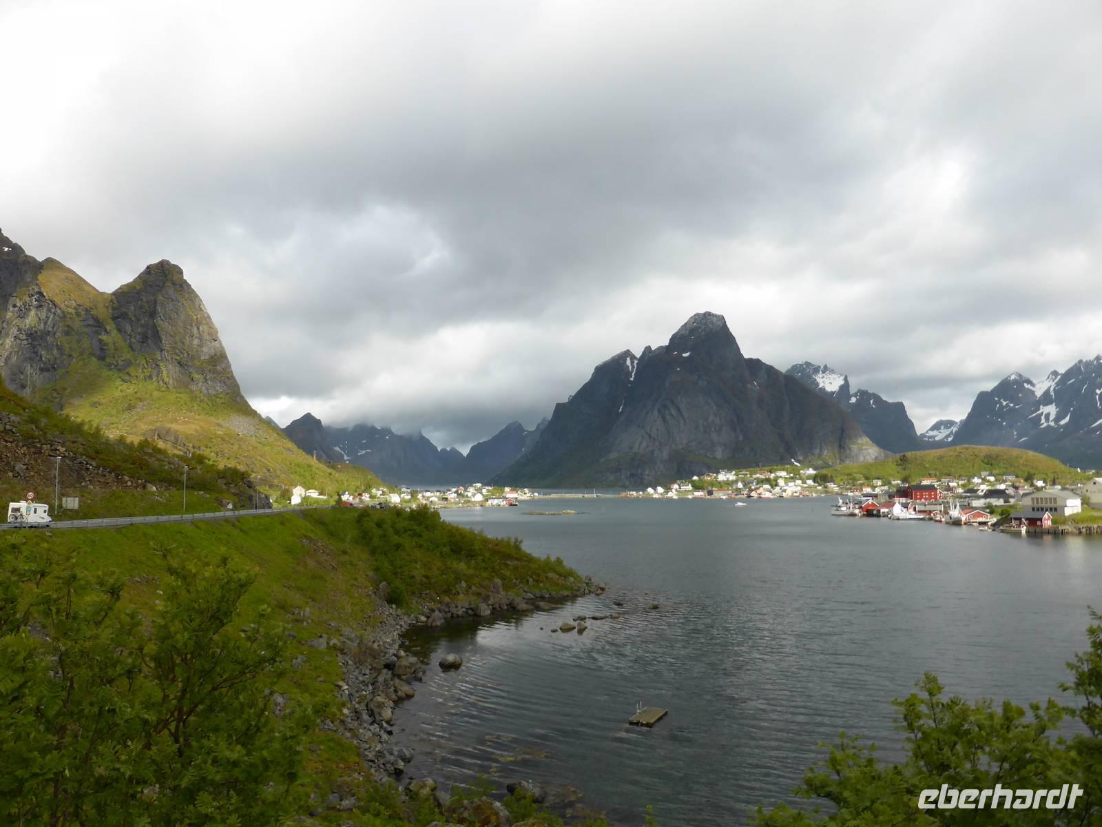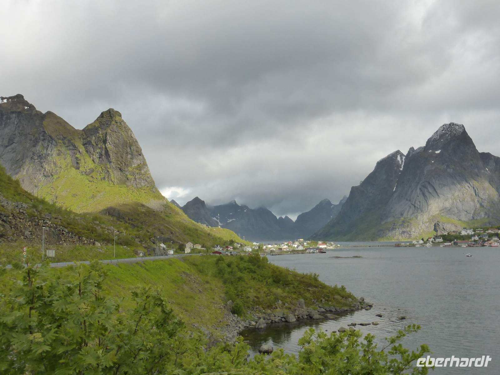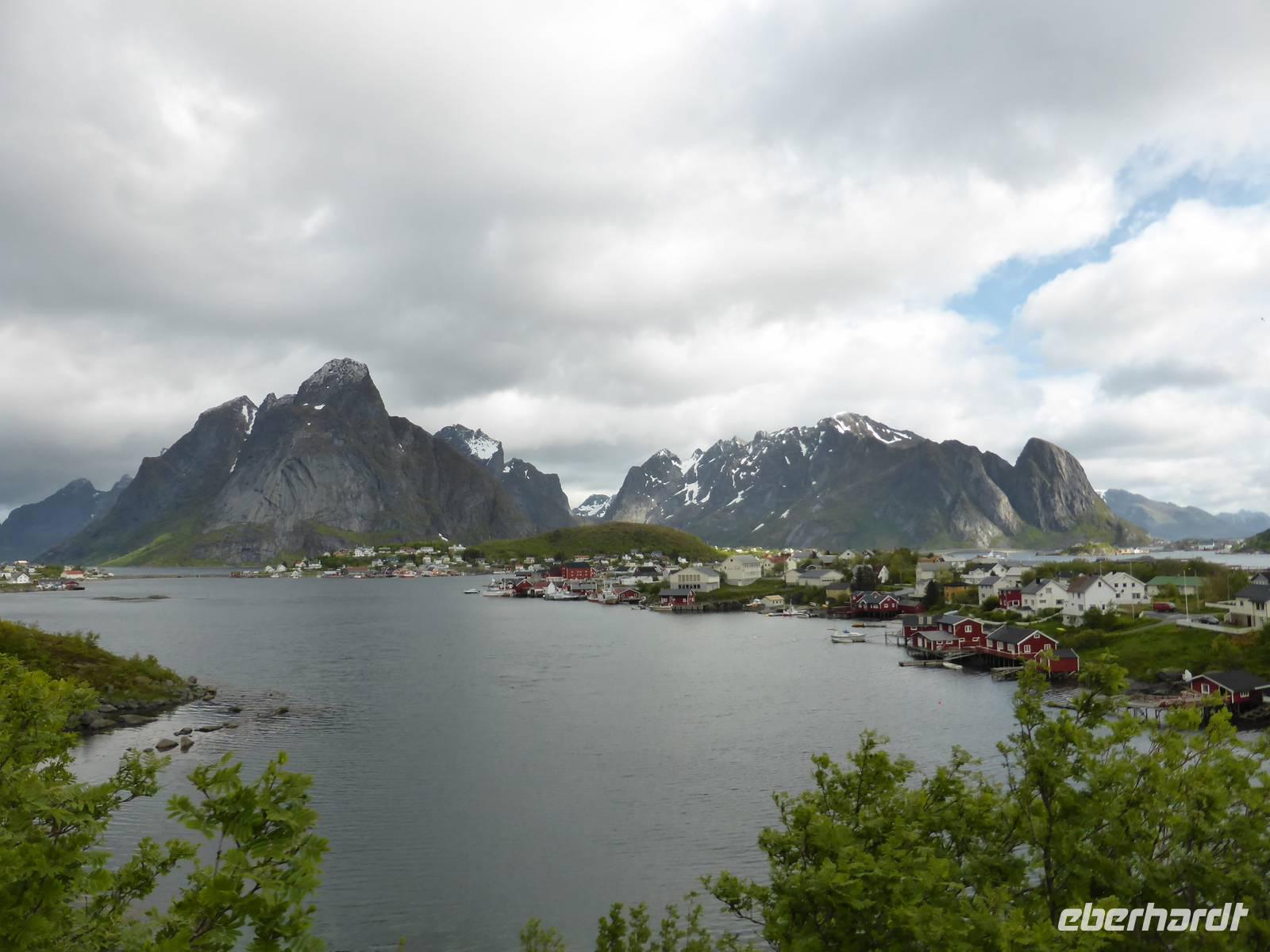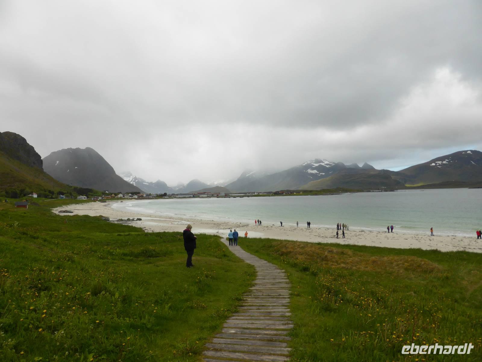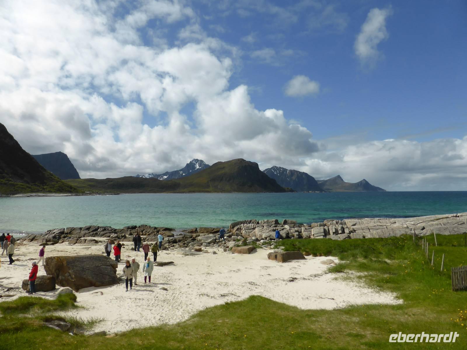 Mit Ausblick auf die fantastische Schärenlandschaft begannen wir nach dem Frühstück unsere Rundfahrt auf den Lofoten. Zuerst fuhren wir in Richtung Insel Flakstadoya und hielten in der winzigen Ortschaft Vareid, weil wir auf einem Bauernhaus Schafe auf dem Dach weiden sahen. Das mussten wir einfach fotografieren! Anschließend ging die Fahrt zu den traumhaften Stränden von Ramberg und Flakstad. In Ramberg hatten wir auch Zeit für einen kleinen Spaziergang am Wasser. Von dort ging es durch den Nappstraumen-Tunnel zurück auf die Insel Vestvagoy und zum paradiesischen Strand von Utakleiv. Gegen Mittag erreichten wir schließlich die Ortschaft Borg, die durch das Wikingermuseum „Lofot" berühmt geworden ist. Während der Besichtigung des Museums sahen wir uns einen beeindruckenden Film über die Geschichte des Häuptlinghofes an. Danach besuchten wir gemeinsam mit unserem Museumsführer Christian das Häuptlings- bzw. Fürstenhaus und stärkten uns bei einer kräftigen und wohlschmeckenden Lammsuppe. Vielleicht hätte man uns diese auch vor 1000 Jahren in dieser oder ähnlicher Form serviert. Eine besondere Überraschung war die Gesanges-Darbietung der Museumsmitarbeiter im Häuptlingssaal. Nach der gemeinsamen Besichtigung hatten wir Freizeit für individuelle Erkundungen. Von Borg aus fuhren wir zum kleinen Fischerdorf Henningsvaer, wobei die Anfahrt über die beiden schmalen Brücken ein Erlebnis wurde. Wir nutzten unseren Aufenthalt zum Bummeln durch die bunten Häuserzeilen und suchten die besten Fotomotive . Von Henningsvaer aus ging es über den Breidtinden-Sattel zu unserer Robu-Siedlung nach Mortsund zurück. Vor dem Abendessen besuchten wir Brigittes Vortrag über den Stockfisch und hatten auch Gelegenheit, getrockneten Fisch zu probieren.