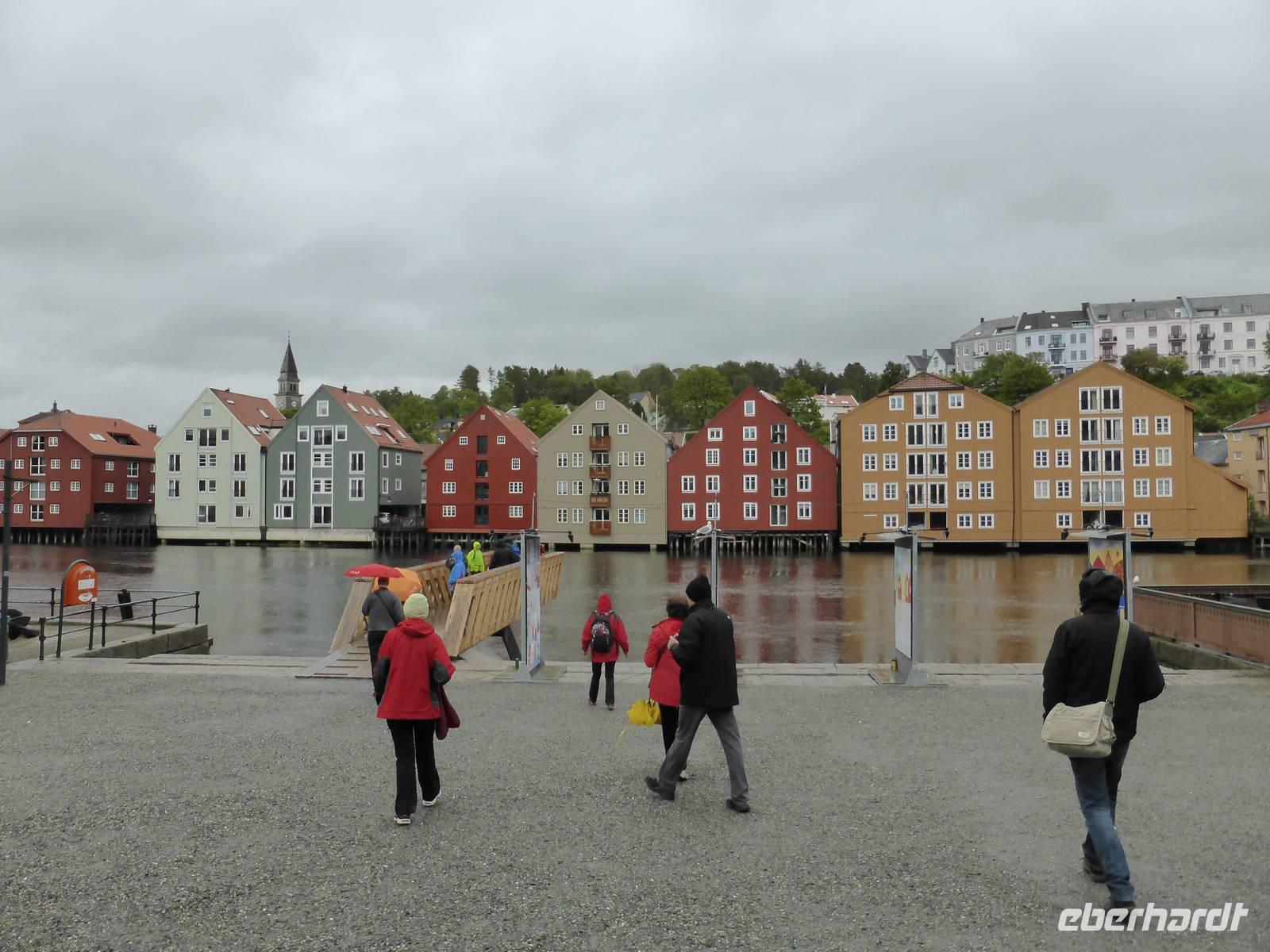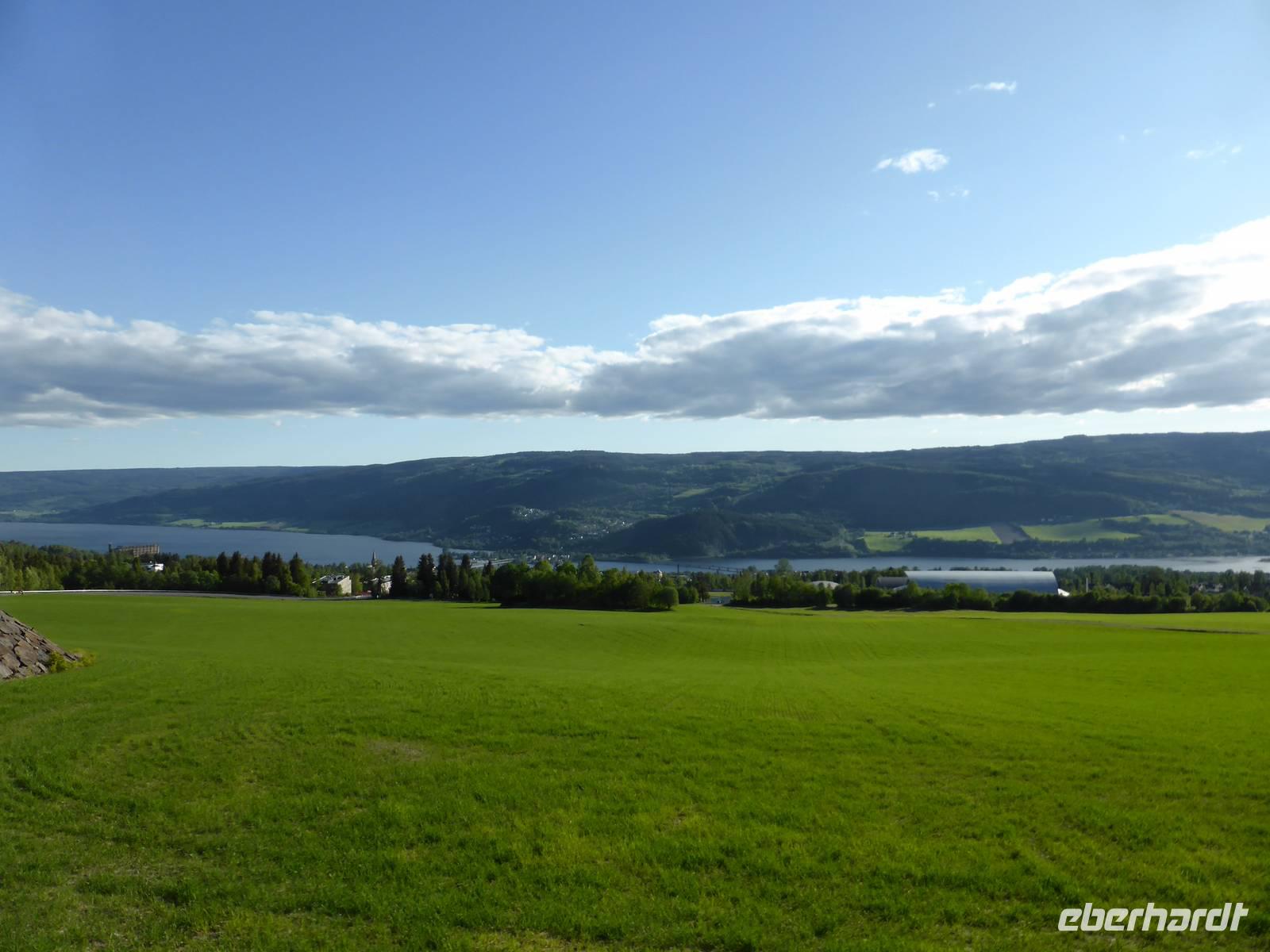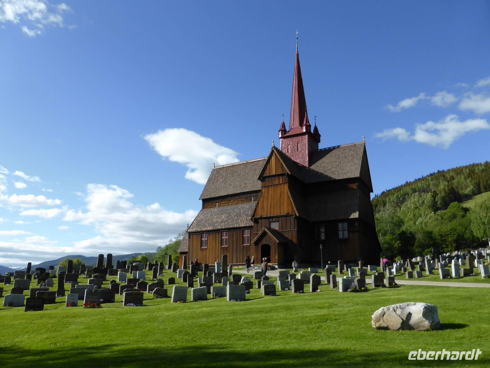Nach dem Frühstück begann unsere Fahrt in die ehemalige Krönungsstadt der norwegischen Könige, Trondheim. Dort angekommen, hielten wir am Nidaros-Dom. Leider regnete es bei unserer Ankunft. Wir spazierten nach einer kleinen Pause zur Bybrua (Bybrücke) und zu den hölzernen Lagerhäusern, die auf Pfählen am Ufer des Flusses Nidelva stehen. Die beiden Häuserreihen sind immer wieder ein schönes Fotomotiv. Von den Lagerhäusern aus gingen wir dann gemeinsam an der Frauenkirche vorbei bis zum Torget, dem Marktplatz, in dessen Mitte die Säule mit dem Standbild Olav Tryggvasons steht. Anschließend war noch etwas Freizeit für den Besuch des Nidaros-Domes oder einen kleinen individuellen Stadtbummel. Von Trondheim aus fuhren wir über Oppdal auf das Dovrefjell und hielten am Aussichtspunkt Hjerkinn mit Blick auf den schneebedeckten Berg „Snohetta" (2236 m). Moschusochsen, die auch im Dovrefjell Nationalpark vorkommen, wollen zwar einige aus unserer Gruppe gesehen haben, aber so recht glauben wollte das keiner. Unser nächster Aufenthalt war in Dombas, dem ersten Ort im 200 km langen Gudbrandstal und Ausgangspunkt für viele Aktivitäten in die Umgebung. Hier konnten wir Rentier- und Elchsalami kaufen. Auf der Weiterfahrt erfreuten wir uns an den historischen dunkelbraunen Bauernhöfen, die so typisch für diese Gegend sind. Der nächste Halt war an der Stabkirche von Ringebu. Unseren letzten Stopp machten wir am Schanzenauslauf in Lillehammer. Hier konnten wir noch die monumentale Feuerschale sehen, in der das Feuer der Winterolympiade 1994 angezündet wurde. Entlang des Mjoesa-Sees ging es danach zu unserem Scandic-Hotel in Hamar.