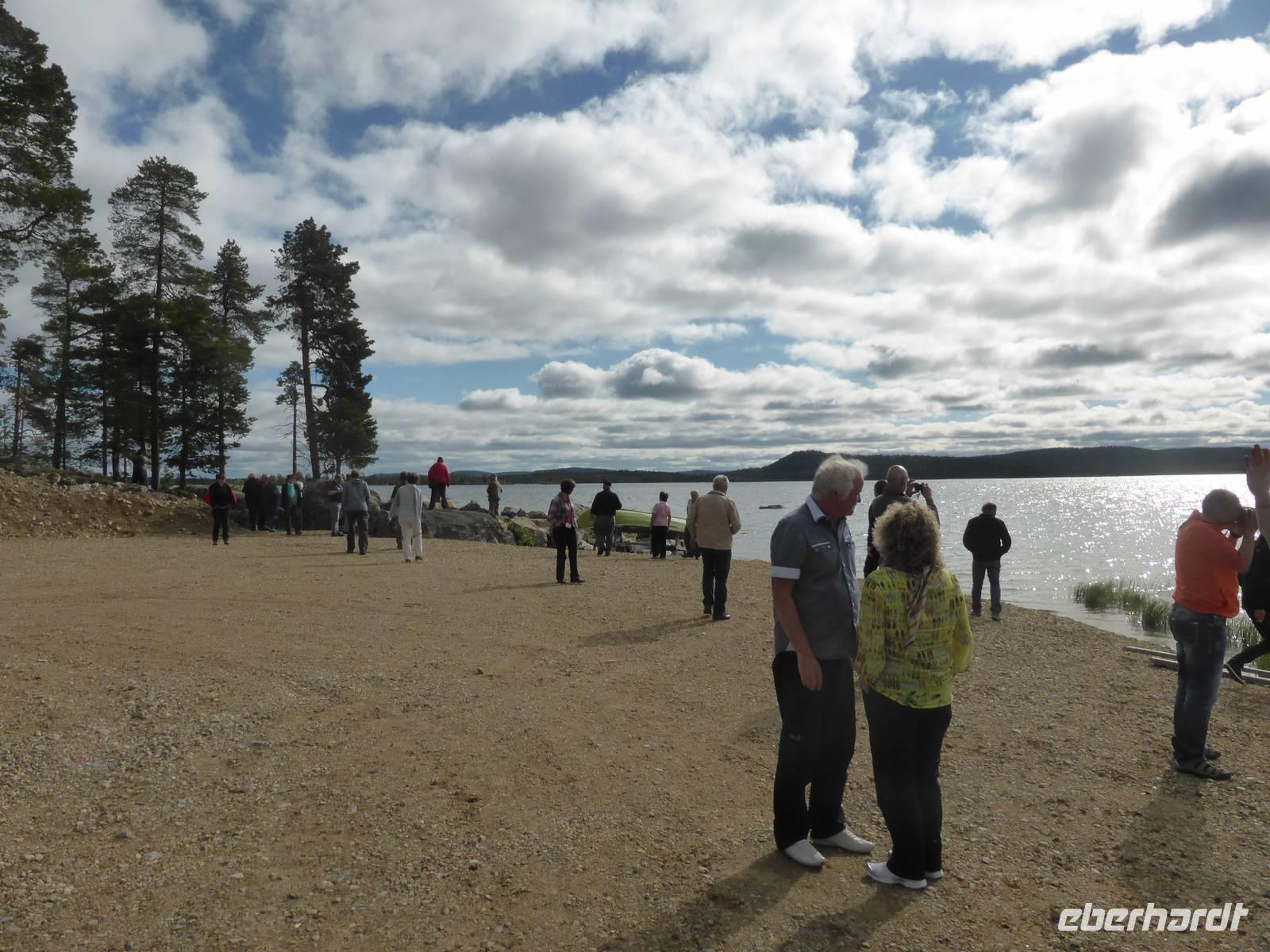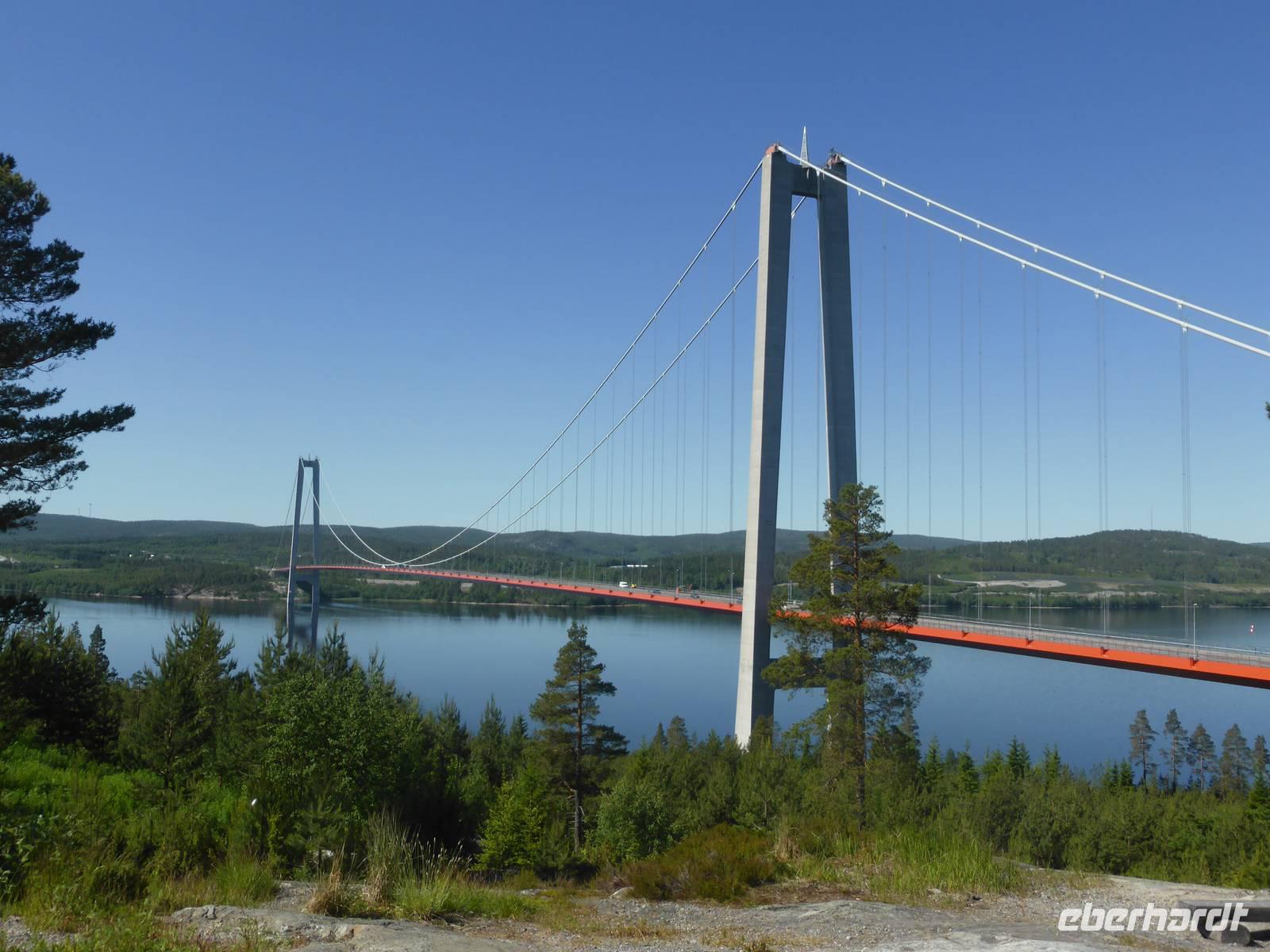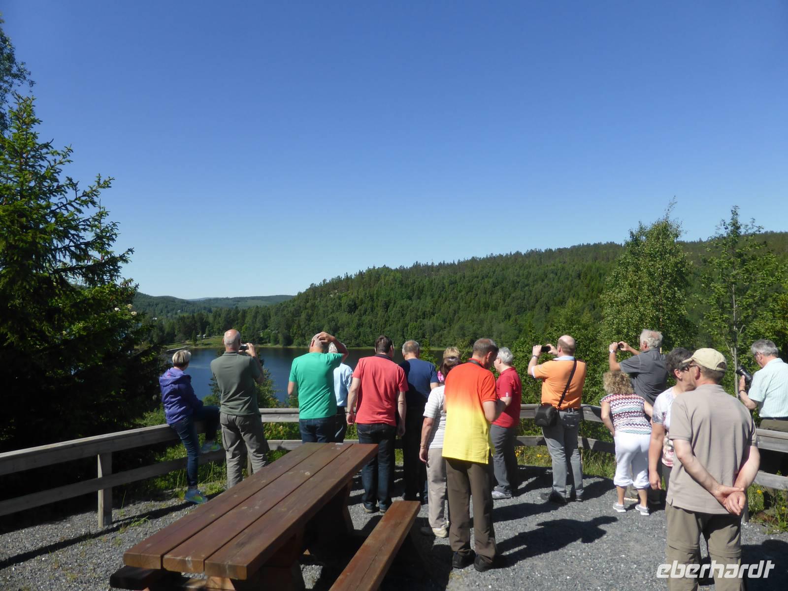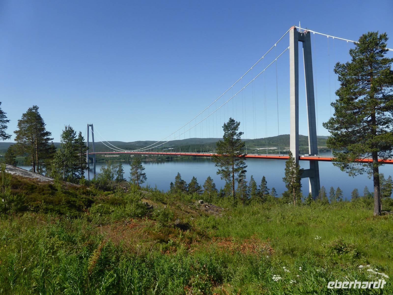 Nach dem Frühstück fuhren wir zur berühmten Höga Kusten (Hohe Küste). Nach der letzten Eiszeit hob sich die Landschaft um ca. 300 Meter. Diese Besonderheit war Anlass dafür, die Landschaft im Jahr 2000 auf die Liste der UNESCO Weltnaturerbe zu setzen. An der Höga Kusten Brücke, welche 1800 m lang ist und 1997 gebaut wurde legten wir unseren ersten Stopp ein. Wir konnten den schönen Ausblick auf die Brücke sowie den Fluss Angermanälven genießen. Eine Spezialität der Region ist der vergorene Hering Surströmming. Als uns Claudia davon erzählte rümpften einige die Nase. Außer Peter... er wollte gleich welchen erwerben und probieren. Die Saison beginnt allerdings erst im August. Zum Glück! Einen kleinen Abstecher unternahmen wir entlang der touristischen Route der Hohen Küste. Der strahlend blaue Himmel lud regelrecht dazu ein.