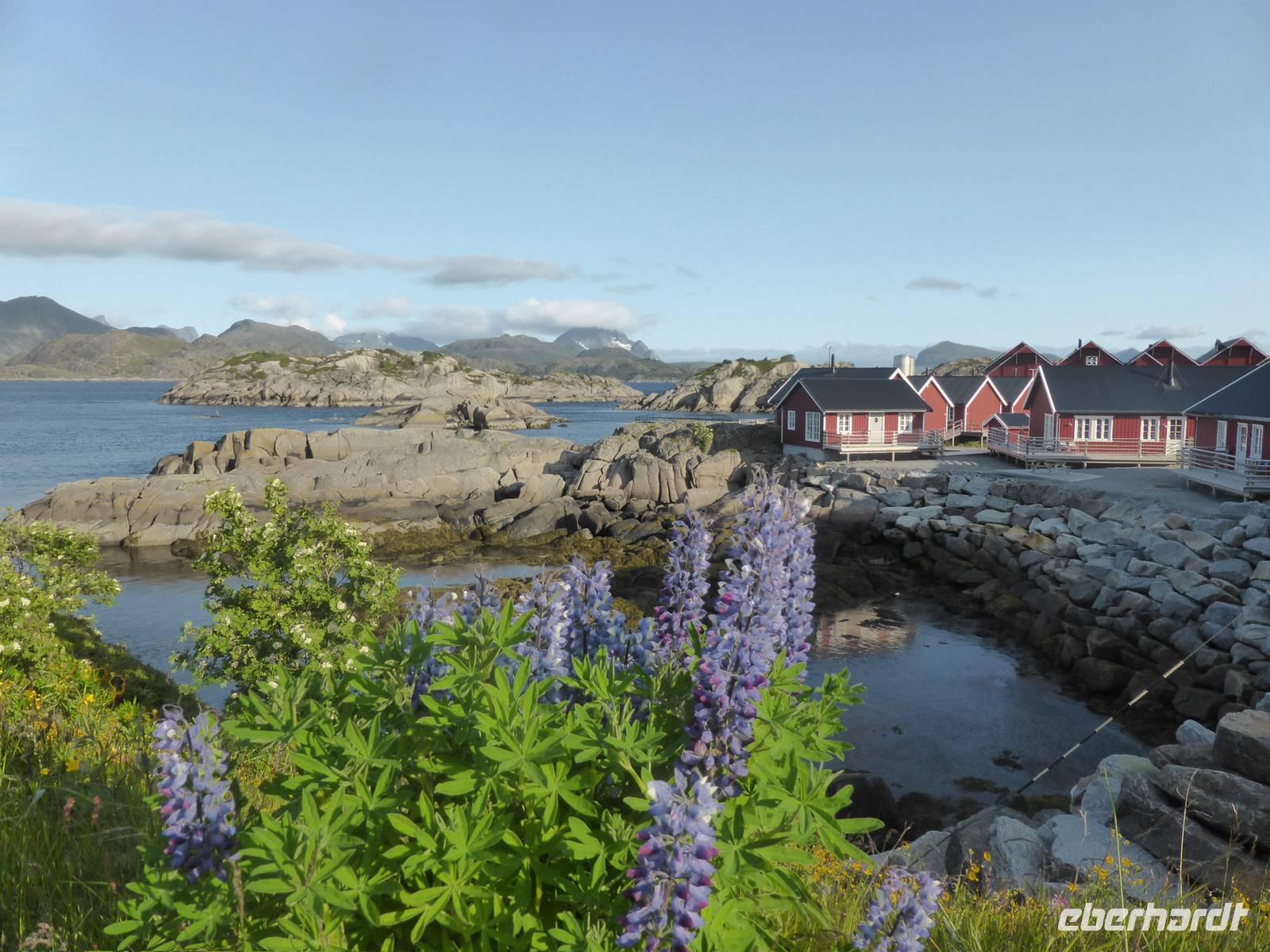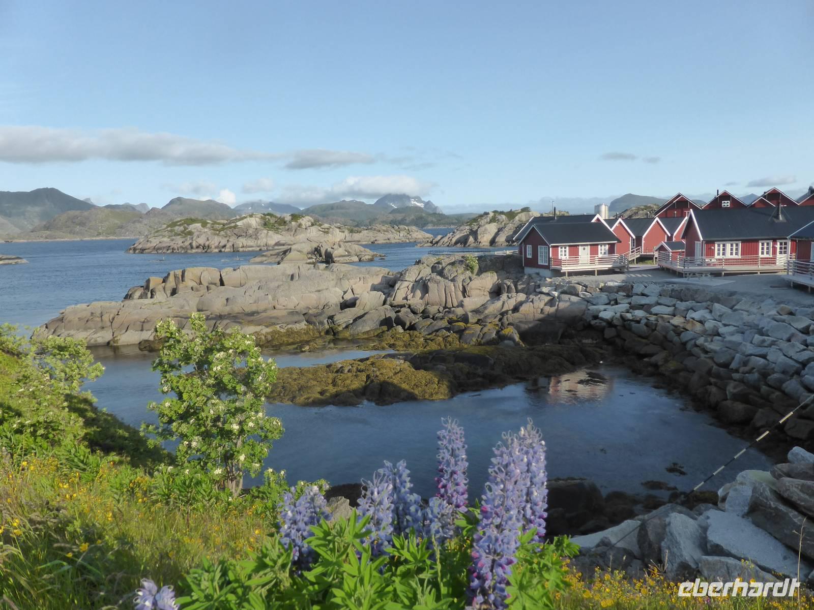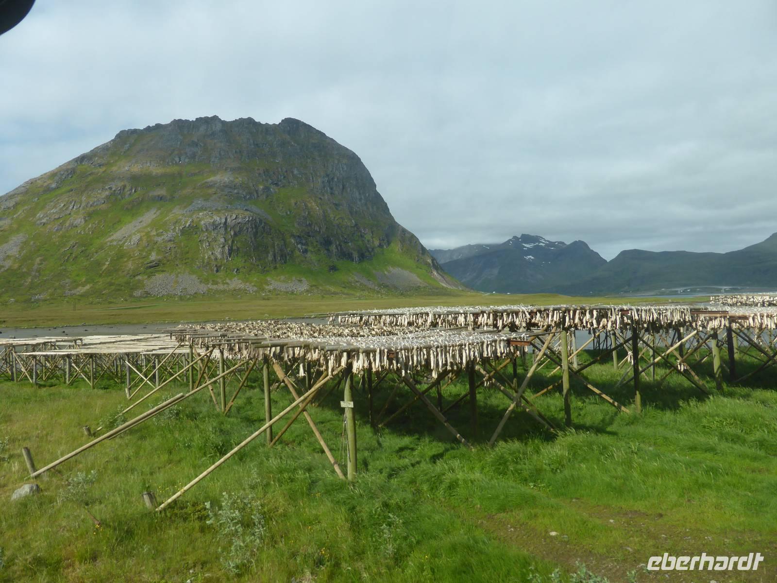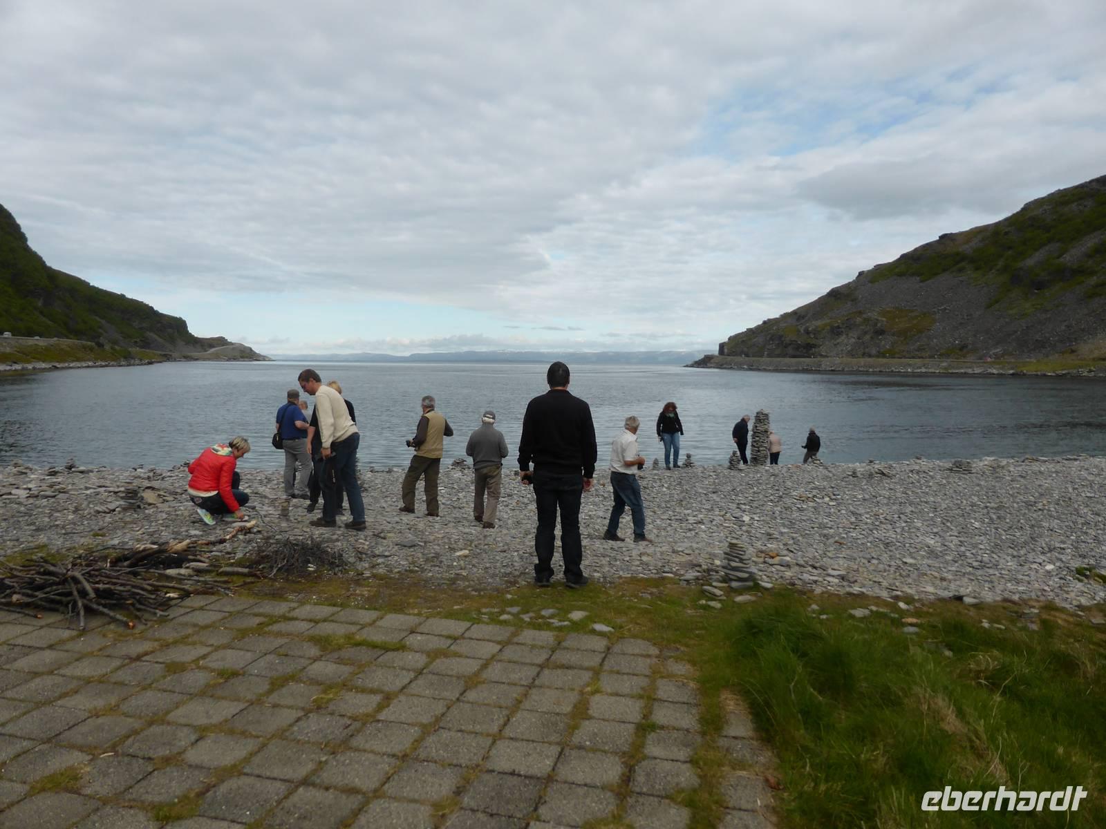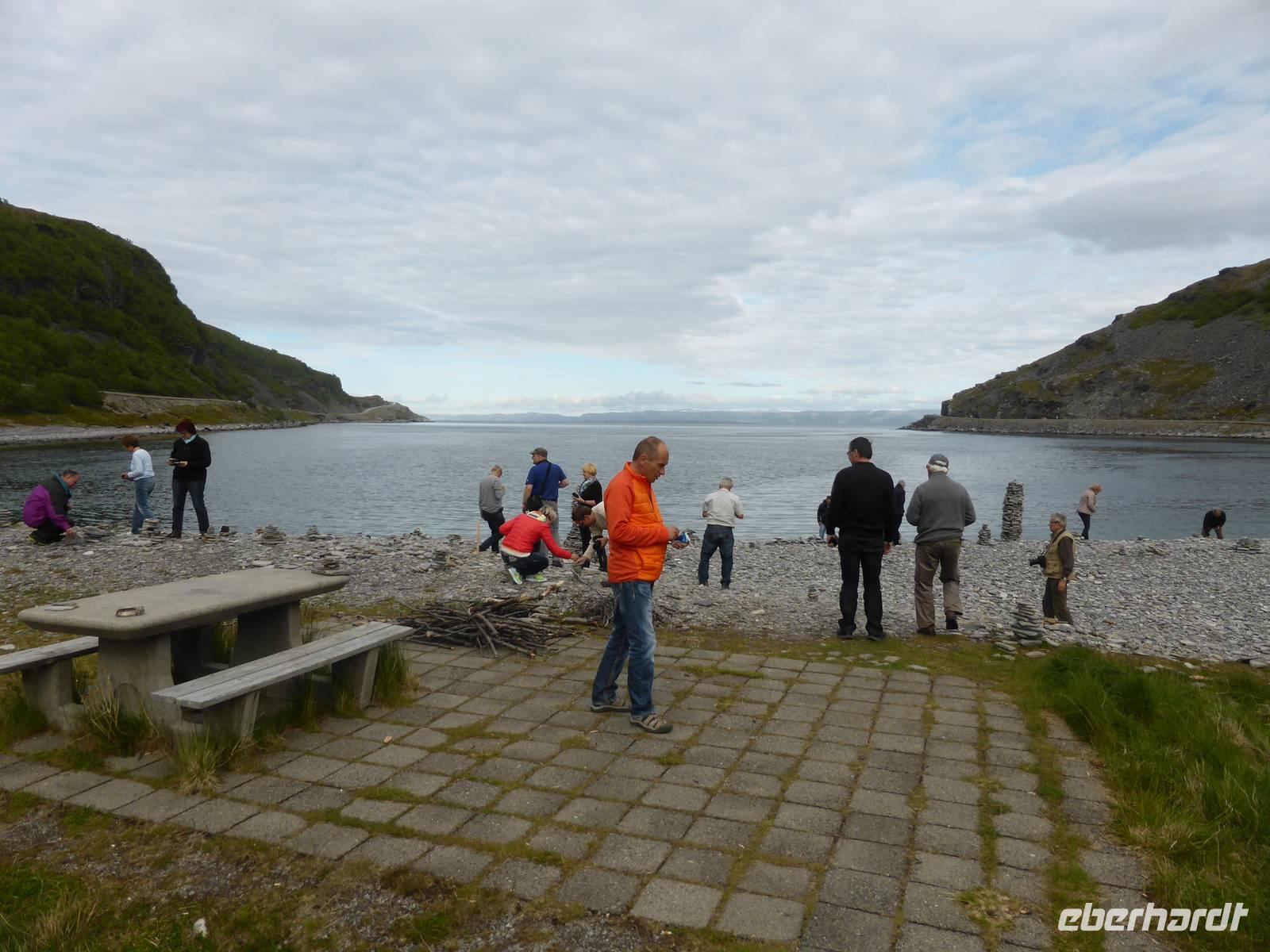 Heute stand die Lofotenrundfahrt auf dem Programm. Leider blieb die Naturszenerie der Lofoten uns heute verwehrt. Von Svolvaer erreichten wir recht bald die Lofotenkathedrale sowie den Trollstein von König Oystein Magnusson in Kabelvag. Im Anschluss bummelten wir durch das „Venedig des Nordens" Hennigsvaer. Dieser kleine Ort ist heute noch ein lebendiger Fischerort, in dem sich u. a. auch viele Künstler niedergelassen haben. Erik Harr ist einer der bekanntesten Künstler der Gegenwart. Gegen Mittag wurden wir im Wikingermuseum „Lofotr" in Borg erwartet. Manfred führte uns durch das Gelände sowie das rekonstruierte Langhaus. Dort erhielten wir auch die defitige Suppe „sodd" (Lammfleischeintopf). Nach dem Besuch des Film sowie der Besichtigung der Ausstellungsräume setzten wir unsere Reise nach Vikten in die nördlichste Glasbläserei fort. Hier erhielten wir eine kleine Vorführung. Nach dem Stopp an der Kirche sowie dem Strand von Flagstad erreichten wir unsere heiß ersehnten Rorbu - Hütten in Mortsund. Leider immer noch bei schlechtem Wetter und Dauernieselregen. Nach dem Abendessen hörten wir gespannt Brigitte bei ihre Vortrag über Stockfisch und Lebertran zu. Der Lebertran war nicht jedermanns Geschmack und sollte noch des Öfteren Gesprächsstoff geben. Und dann ging es ans Probieren - einige rumpften die Nase andere genossen diese Spezialitäten.