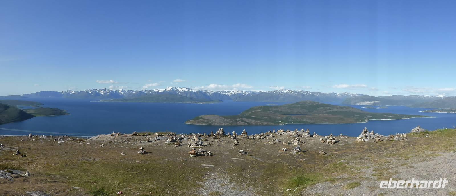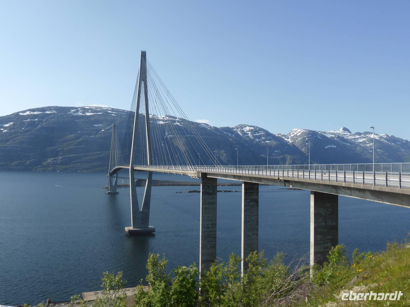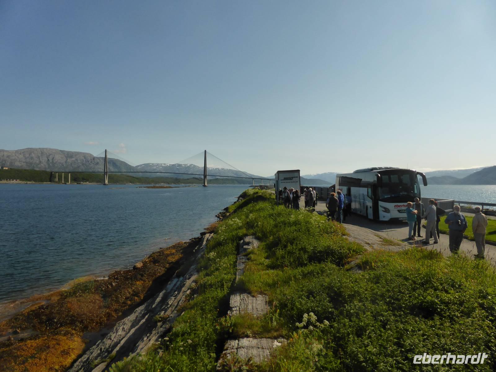 Auf unserer Panoramafahrt nutzten wir drei Fähren von Tjötta nach Forvik, von Anddalsvagen nach Horn und Vennesund nach Holm. Vor der ersten Fähre legten wir allerdings noch einige Stopps ein: am Haus sowie der Kirche des Dichter-Pfarrers Petter Dass, der 1065 m langen Helgelandbrücke sowie am „Haus des Windes". Hier konnten wir ablesen, dass das Wetter schön bleiben sollte. Jedenfalls an dieser Stelle.