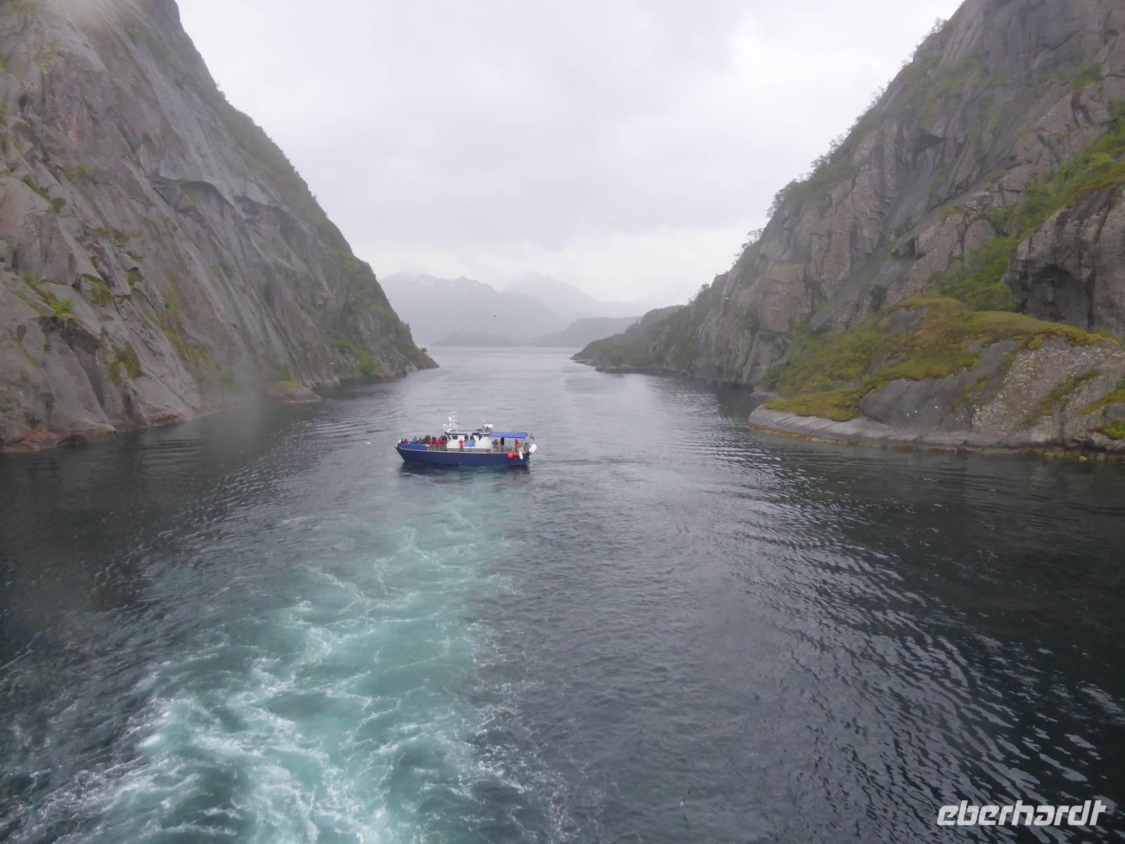 Heute war es am Morgen etwas bewölkt. Leider wurden unsere Befürchtungen wahr. Je näher wir den Versteralen kamen desto dichter wurden die Wolken. Am Denkmal für die Befreiungsarmee in Gratangen legten wir unseren ersten Stopp ein. Ein Blick auf Narvik war uns leider nur schlecht vergönnt, bevor wir über die Tjeldsundbrücke die größte der Vesterålen - Insel Hinnoya erreichten. Unser Zielt war Stokmarknes. Hier begann 1893 die Geschichte der „Reichsstrasse 1" oder auch der schönsten Seereise der Welt der Hurtigrute. Unser Schiff „MS Finnmarken" brachte uns durch den berühmten Raftsund und den Trollfjord nach Svolvaer. Das verregnete Wetter war wirklich ärgerlich. Angelangt auf den Lofoten verließen wir das Schiff in Svolvaer. Nach unserem gemeinsamen Abendessen im Scandic Hotel bezogen wir unsere Zimmer im Scandic sowie Vestfjord Hotel.